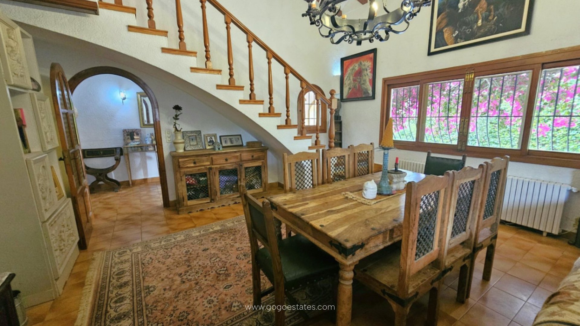 Wir präsentieren Ihnen exklusiv diese wunderschöne traditionelle Villa in Jávea. Bei der Ankunft auf dem Grundstück finden wir einen privaten Parkplatz mit genügend Platz für vier Autos. Beim Betreten der Villa werden wir von einer Diele empfangen, die zu einem sehr geräumigen Wohn-Esszimmer führt. Der Essbereich hat hohe Decken, und durch einen schönen Tosca-Steinbogen gelangen wir ins Wohnzimmer, das einen schönen Kamin hat, ebenfalls aus Tosca-Stein, und die Räumlichkeit sehr gemütlich macht. Die Küche ist gut geschnitten, mit Platz für einen Tisch und Stühle und ist mit vielen natürlichen Holzschränken ausgestattet, die viel Stauraum bieten, sowie einem Waschraum, der den Alltag erheblich erleichtert. Außerdem gibt es auf dieser Etage ein voll ausgestattetes Badezimmer. Im Obergeschoss finden wir vier Doppelzimmer mit Einbauschränken und drei Bädern, von denen zwei en-suite sind, sowie eine geräumige Terrasse vom Hauptschlafzimmer aus, mit offenen Ausblicken und einem kleinen Blick auf das Meer. Im Untergeschoss, das über eine Innentür zugänglich ist, befindet sich ein Wohn-Esszimmer mit einer kleinen offenen Küche, zwei Schlafzimmer, ein komplett renoviertes Badezimmer mit Dusche und ein weiterer Raum, der derzeit als Abstellraum genutzt wird, aber in ein Fitnessstudio oder ein weiteres Schlafzimmer umgewandelt werden könnte. Der Außenbereich der Villa ist der perfekte Ort, um das schöne Wetter zu genießen, die Aussicht auf den Montgó zu bewundern, uns im 10x5 Pool zu erfrischen, uns auf der Wiese zu sonnen oder die geräumige L-förmige Naya mit schönen Tosca-Steinbögen zu genießen, ein Buch zu lesen, mit Familie oder Freunden zu Abend zu essen oder einfach zu sitzen und entspannt mit einem Glas Wein zu sein. Die gesamte Villa ist mit Heizölheizung, Holzfenstern im oberen Teil und kippbaren Doppelverglasungsfenstern im unteren Teil ausgestattet.