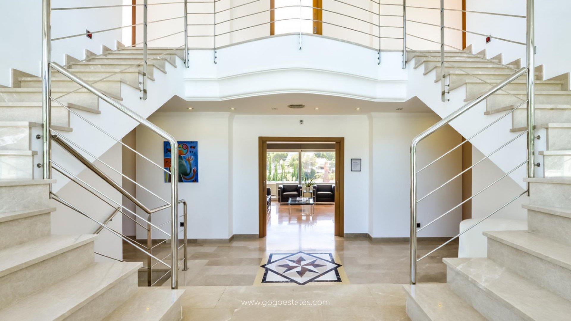 Grosse, luxuriöse und moderne Villa mit Meerblick & Spa in Benissa. GROSSZÜGIGE, LUXURIÖSE MODERNE VILLA MIT MEERBLICK & SPA Diese geräumige und luxuriöse Villa befindet sich in der Urbanisation La Fustera, nur 10 Autominuten vom Zentrum von Calpe und 15 Minuten von Moraira entfernt, in der Nähe des bezaubernden Strandes von La Fustera. Sobald Sie das Anwesen betreten, können Sie sofort die Größe dieser geräumigen Villa erkennen. Im Inneren werden Sie von einer kaiserlichen Treppe und einem auffälligen Marmorboden empfangen, der sich durch die gesamte Villa zieht. Der Wohnbereich ist riesig und besteht aus 3 getrennten Bereichen: einem formellen Essbereich, einem Wohnzimmer und, in der Ecke, dem gemütlichen Lounge-/Fernsehbereich mit einem Gaskamin. Die Außenterrasse bietet viel Platz zum Sonnenbaden oder Entspannen für all Ihre Freunde und Familie. Auf der Terrasse finden Sie einen überdachten Ess- und Sitzbereich sowie eine Außenküche. Der Außenpool verfügt über einen eingebauten Whirlpool und einen Wasserfall mit wunderschönem Blick über die Landschaft bis hin zum Mittelmeer. Die Villa verfügt über einen SPA-Bereich mit Fitnessraum, Sauna, Innenpool und Jacuzzi, um auch in den Wintermonaten den erstklassigen Lebensstil zu genießen. Im Erdgeschoss befindet sich ein sehr stilvoller Barbereich, der ein perfekter Ort ist, um zu tanzen oder einen Drink mit Freunden zu organisieren. Neben der Bar befindet sich ein völlig unabhängiges Apartment mit einem eigenen separaten Eingang, das für Freunde, Familie oder ein Dienstmädchen genutzt werden kann. Zu guter Letzt gibt es im obersten Stockwerk 4 große Schlafzimmer, alle mit eigenem Bad, und ein Büro. Das Hauptschlafzimmer verfügt außerdem über einen begehbaren Kleiderschrank, eine private Terrasse und ein Bad. Das Home-Office teilt sich eine große Terrasse mit 2 der Schlafzimmer und bietet eine wunderbare Aussicht, während Sie von zu Hause aus etwas Arbeit nachholen. Diese Villa hat alles, was Sie brauchen, um das ganze Jahr über zu leben! Das Anwesen befindet sich zwischen Moraira (9KM) & Calpe (7KM) und 1,5 KM vom Strand von La Fusterra entfernt.