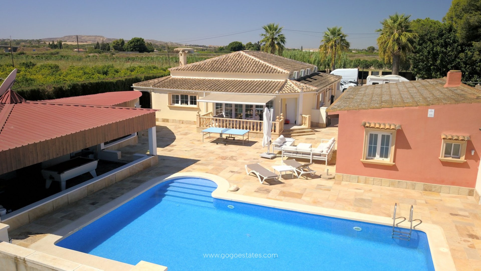 Diese wirklich begehrenswerte, nach Osten und Westen ausgerichtete, freistehende Landvilla mit vier/sechs Schlafzimmern, Stallungen und Koppel steht auf einem 2000 m² großen Grundstück in Las Heredades zwischen Formentera del Segura und Almoradi in malerischer Lage, nur 6–7 Gehminuten von dem charmanten spanischen Dorf und nur 5 Autominuten von Formentera del Segura, Rojales und Benijofar entfernt. Die atemberaubenden Strände und die beliebte Promenade von Guardamar sind nur 15 Autominuten entfernt. Die Hauptvilla hat 4 Schlafzimmer und 3 Badezimmer sowie 1 Garderobe. Eines der Schlafzimmer wird derzeit als Golfsimulatorraum genutzt, während das Hauptschlafzimmer über einen begehbaren Kleiderschrank und ein atemberaubendes Bad en suite mit Badewanne und Dusche verfügt. Zwei der übrigen Schlafzimmer haben ebenfalls ein eigenes Bad. Die Villa verfügt über eine fabelhafte, moderne Küche im Landhausstil mit fantastischen Türen, die vom Essbereich auf eine Außenterrasse mit Blick auf den privaten Pool führen. Der Außenbereich eignet sich mit Außenküche, Grill und Unterhaltungsbereich perfekt für gesellige Stunden. Die separate Gästeunterkunft bietet zwei zusätzliche Schlafzimmer, ein Badezimmer, eine Küche und ein Wohnzimmer und ist somit ideal für Besucher oder die Großfamilie. Das Anwesen umfasst Ställe und eine Koppel, ein Büro im Wohnzimmer der Hauptvilla, Klimaanlage im gesamten Gebäude, Heizpaneele, Einbauschränke und einen separaten Hauswirtschaftsraum. Der Außenbereich besticht durch atemberaubende Fliesen rund um den Pool, ausreichend Parkplätze abseits der Straße unter dem Carport und einen Springbrunnen. Diese Villa verbindet meisterhaft moderne und traditionelle Elemente und ist damit ein wirklich einzigartiges und begehrenswertes Zuhause an der Costa Blanca Süd.
