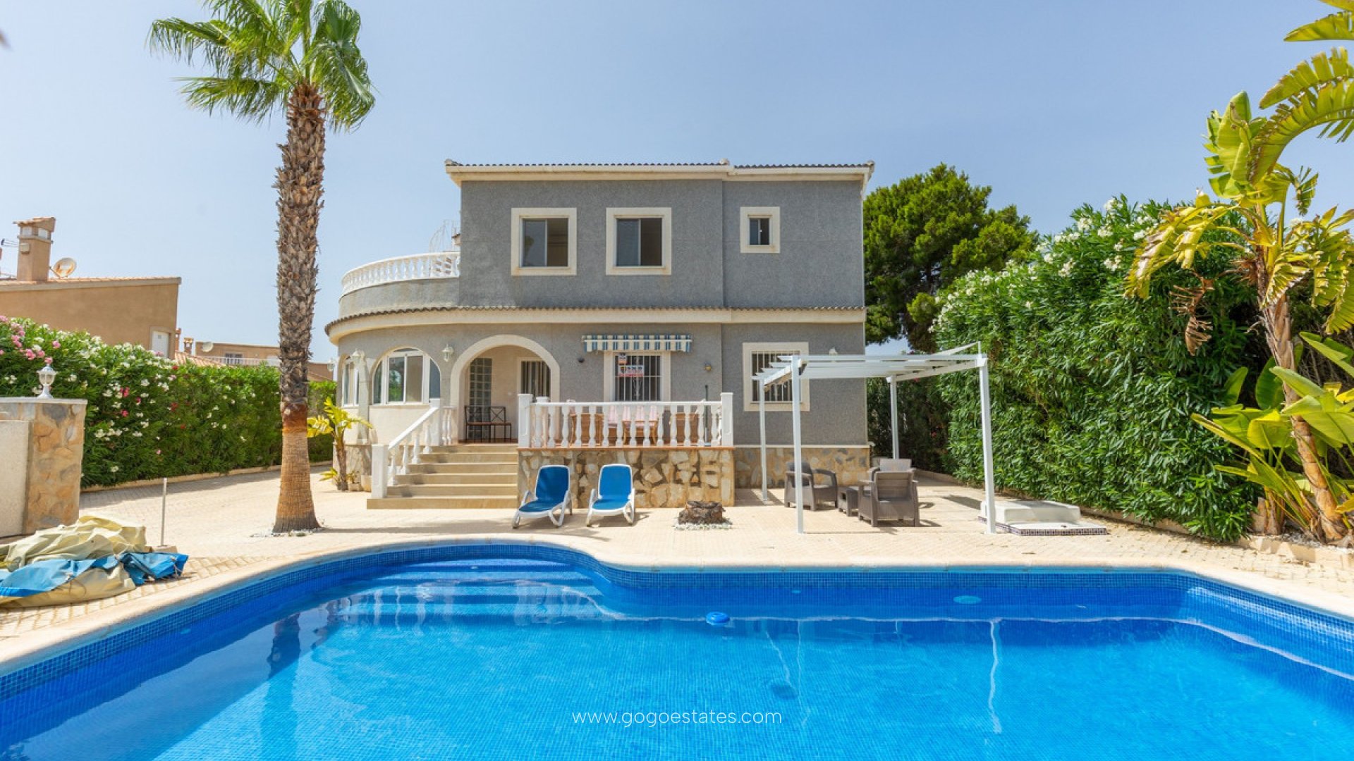 Wir präsentieren diese beeindruckende freistehende Villa auf einem 885 m² großen Privatgrundstück in einem ruhigen Wohngebiet von San Fulgencio. Das Anwesen verfügt über 5 Schlafzimmer und 5 Badezimmer, darunter eines im Freien – perfekt als Poolbadezimmer oder für Gäste – und ist somit ideal für große Familien oder als geräumiges Ferienhaus. Im Inneren bietet das Haus ein helles und geräumiges Wohnzimmer mit Kamin, einen separaten Essbereich, eine voll ausgestattete Küche und eine verglaste Veranda für ganzjährigen Genuss. Es gibt auch eine Waschküche und einen Abstellraum sowie eine private Terrasse und ein Solarium, um das mediterrane Klima zu genießen. Der Außenbereich ist wirklich außergewöhnlich: privater Pool, große und gepflegte Gärten und eine geschlossene Garage mit Platz für zwei Autos. Ein charmantes Anwesen, das Privatsphäre, Platz und Komfort bietet – perfekt für alle, die einen ruhigen Lebensstil suchen, ohne auf nahe gelegene Annehmlichkeiten zu verzichten.