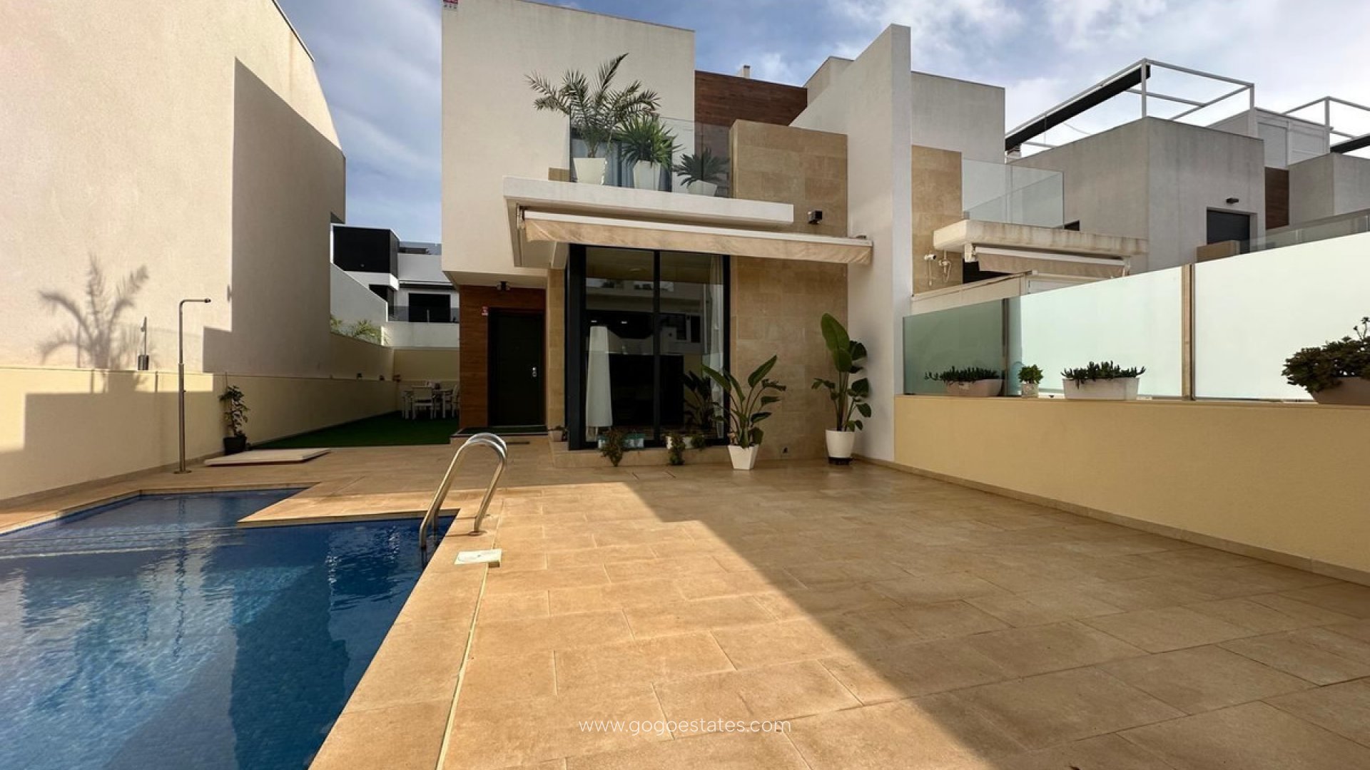 Villa mit privatem Pool, Terrasse und sonniger Dachterrasse Willkommen in der beliebten Gegend von San Pedro del Pinatar und dieser modernen und gut geplanten Villa mit privatem Pool. Die Villa besteht aus drei Schlafzimmern, drei Badezimmern und einem offenen Wohnzimmer und einer Küche. Hinzu kommt eine großzügige Terrasse mit Platz für Gartenmöbel und eine sonnige Dachterrasse. Die Villa hat eine einladende Atmosphäre, großzügige Lichteinflüsse und leicht möblierte Oberflächen. Diese Unterkunft ist bezugsfertig und eine Villa, die Sie gerne Ihr Zuhause in Spanien nennen werden. Das Wohnzimmer und die Küche sind offen gestaltet und bieten Platz für einen Wohnbereich und einen Essbereich. Die Küche ist gut ausgestattet und verfügt über gute Lagermöglichkeiten und Arbeitsflächen. Drei Schlafzimmer mit ruhiger Lage und schönem Licht, in den Schlafzimmern ist Platz für Betten und Nachttische. Das Hauptschlafzimmer verfügt außerdem über eine private Terrasse mit Platz für Gartenmöbel und Liegestühle. Drei Badezimmer, alle Badezimmer sind mit Toilette, Waschbecken und Dusche ausgestattet. Großzügige Dachterrasse mit Platz für eine Loungegruppe und Liegestühle. Hier wohnen Sie in der Nähe der zahlreichen Geschäfte, Restaurants und Cafés der Gegend sowie des Mar Menor und der schönen Strände. An der Costa Cálida gibt es eine gute Auswahl an gepflegten Golfplätzen. Die größeren Städte Murcia, Cartagena und Torrevieja sind mit dem Auto gut erreichbar. Gerne können Sie uns für weitere Informationen kontaktieren oder eine Besichtigung buchen. Selbstverständlich führen wir digitale Besichtigungen durch, wenn Sie nicht vor Ort sein können.