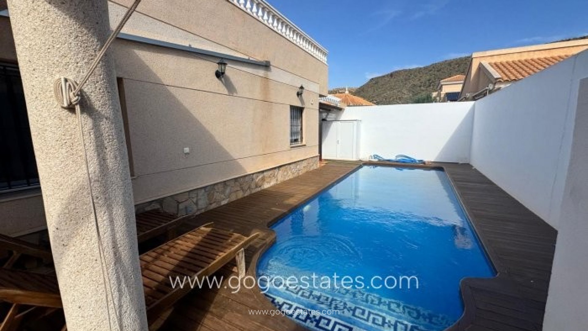 Im Außenbereich der Villa befindet sich ein privater Pool, umgeben von einer Terrasse, die sich ideal zum Sonnenbaden, Grillen und Genießen des angenehmen Klimas das ganze Jahr über eignet.