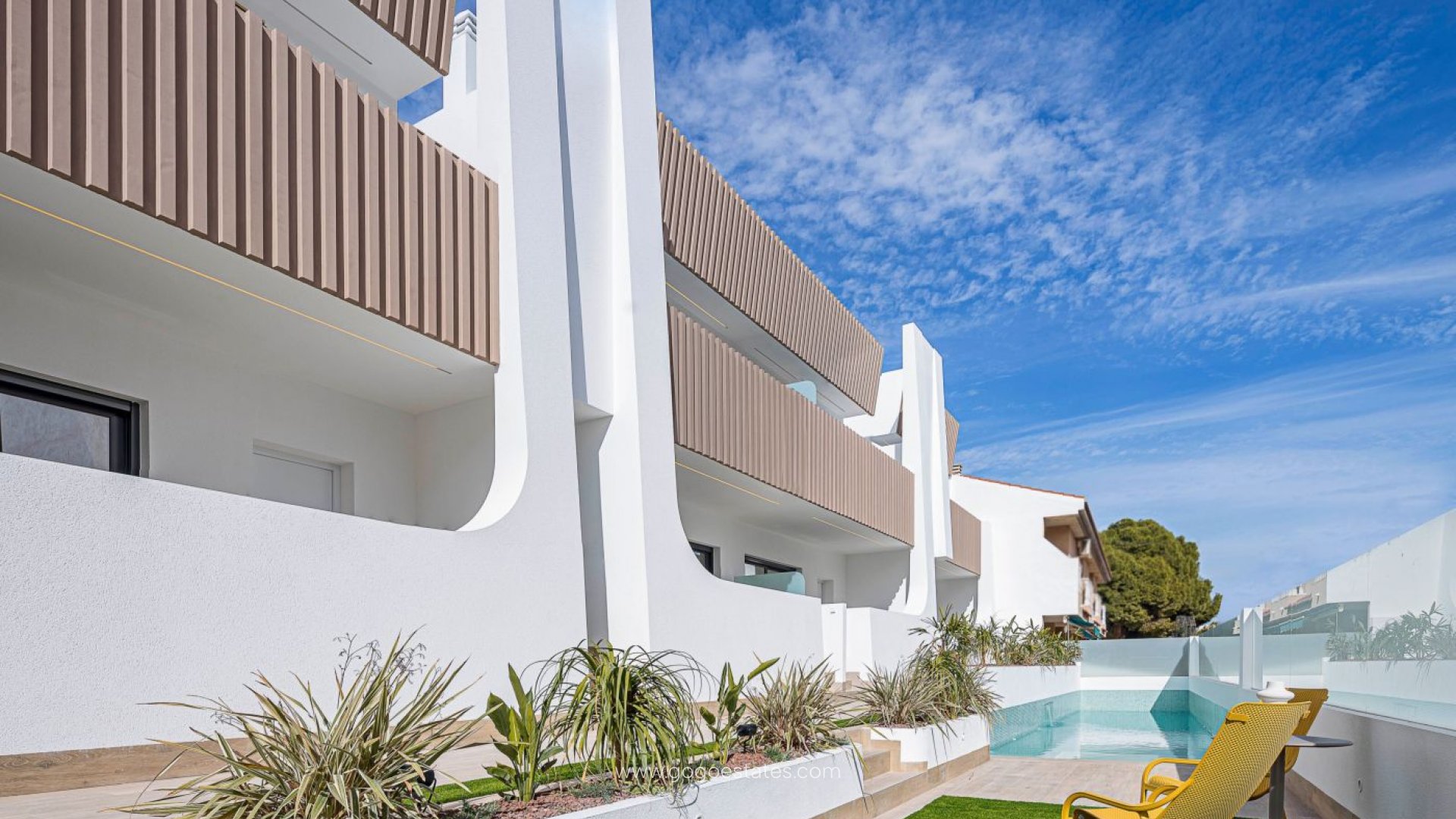 Schlüsselfertige Premium-Häuser im einzigartigen Stil in Strandnähe. Wählen Sie zwischen einem Erdgeschoss-Modell mit großer Vorderterrasse und hinterem Patio oder einem Penthouse-Loft mit Vorderterrasse und großer privater Dachterrasse mit Pergola und Sommerküche, nur 350 Meter vom Strand entfernt.~Garten-/Erdgeschoss-Haus:~Die Eingangstür öffnet sich in den geräumigen Wohnbereich mit seitlichem Essbereich. Die voll ausgestattete Küche befindet sich neben den Schiebetüren und lässt viel Tageslicht herein. Seitlich befinden sich ein Familienbadezimmer mit Waschbecken, Toilette und Dusche sowie zwei großzügige Schlafzimmer – das Hauptschlafzimmer mit eigenem Bad.~Penthouse-Modell: Eine Treppe führt Sie in das Obergeschoss mit großer gefliester Privatterrasse und Eingangstür zum Haus.~Wie bei den Erdgeschoss-Modellen gibt es einen großzügigen offenen Wohn-/Essbereich mit extragroßer Küche – zwei Schlafzimmer liegen seitlich (Hauptschlafzimmer mit eigenem Bad). Von der Rückseite der Küche aus gelangt man in die private Dachterrasse.~Schlüsselfertig: Unsere Häuser verfügen über sämtliche LED-Beleuchtung innen und außen, eine installierte Klimaanlage, Fußbodenheizung in beiden Bädern, eine Einbauküche mit Induktionskochfeld, Backofen, Geschirrspüler, komplettes Möbelpaket und einen Tiefgaragenstellplatz. Optionale Abstellräume sind gegen Aufpreis verfügbar.~Eine ausgewählte Anlage im Signature-Stil mit nur 12 Strandhäusern – alle mit großem Gemeinschaftsgarten und Swimmingpool.~