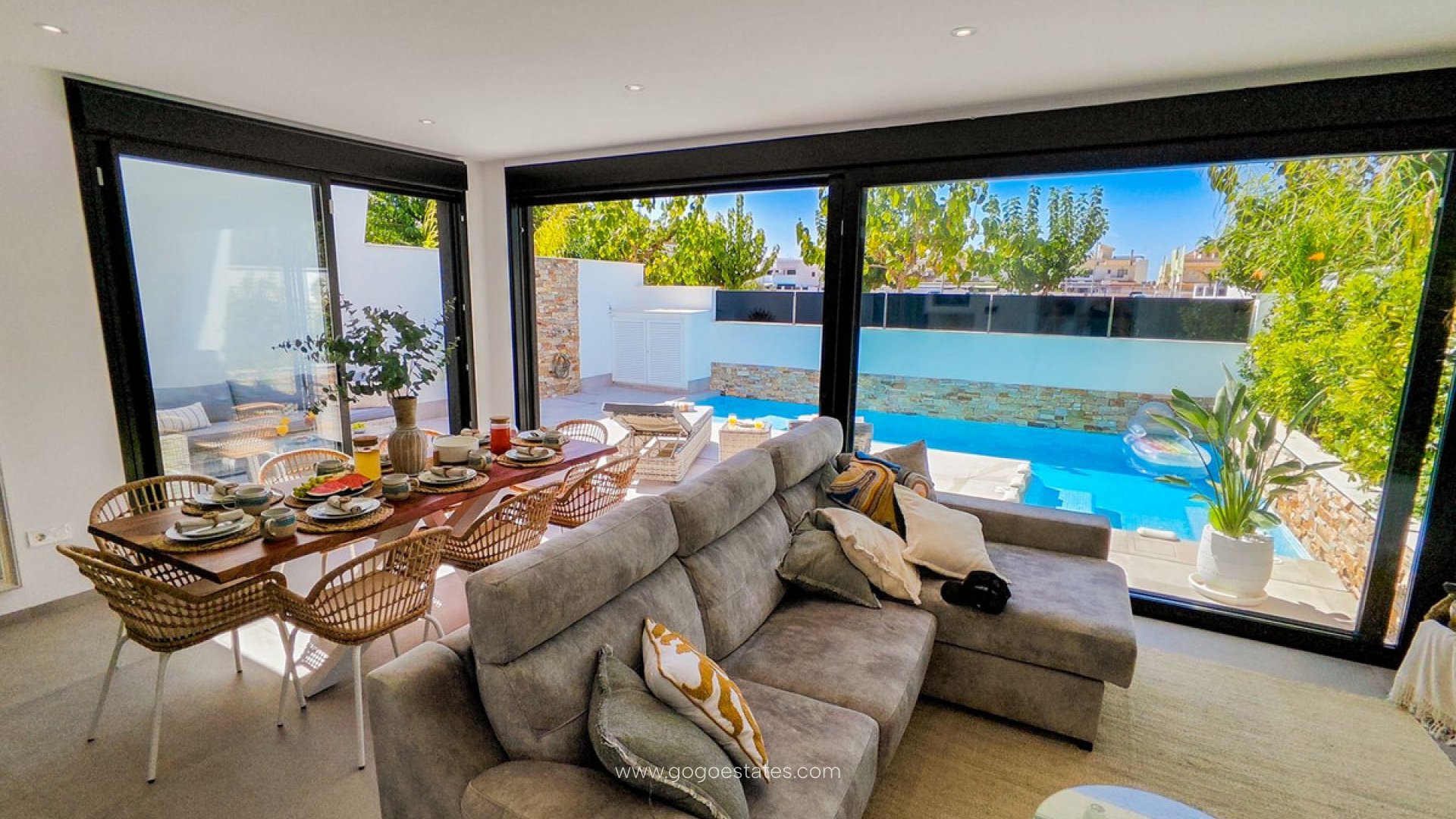 Wir freuen uns, Ihnen diese wunderschöne, freistehende Villa in einer beliebten Gegend von Santiago de la Riberia, nur 800 m vom Strand entfernt, präsentieren zu dürfen. Die Villa bietet alles, was das Herz begehrt und noch vieles mehr: drei Schlafzimmer mit Einbauschränken und privaten Terrassen, drei Badezimmer mit Fußbodenheizung, einen großzügigen Wohn-/Essbereich und eine voll ausgestattete Küche. Das Haus ist lichtdurchflutet, und Schiebetüren zur Terrasse bieten direkten Zugang zum privaten Garten, den Terrassen und dem privaten Swimmingpool. Zu den weiteren Annehmlichkeiten gehören eine Garage, ein Hauswirtschaftsraum, elektrische Jalousien, ein Solarium mit Pergola, eine Außenküche und ein intelligentes Schließsystem mit Fingerabdrucksensor. Dank der Strandnähe, des privaten Pools und der großzügigen Ausstattung eignet sich diese Immobilie hervorragend als Ferienimmobilie und ist besonders für Familien und Gruppen attraktiv. Santiago de la Riberia ist ein charmantes Städtchen am Mar Menor. Ursprünglich ein einfaches Fischerdorf, hat es sich zu einem beliebten Urlaubsort entwickelt und zieht sowohl spanische Besucher als auch Touristen aus ganz Europa an. Obwohl modern, hat sich Santiago seinen traditionellen Charme als Fischerdorf bewahrt. Die Stadt besticht durch ihre Atmosphäre. Sie verfügt über eine wunderschöne, von majestätischen Palmen gesäumte Promenade und zwei Kilometer herrliche Sandstrände. Von hier aus können Sie eine Bootsfahrt über das ruhige Wasser des Mar Menor zum La Manga Strip unternehmen. Das Haupteinkaufsviertel befindet sich zwar in San Javier, aber auch Santiago selbst bietet zahlreiche Geschäfte zum Stöbern, insbesondere mittwochs vormittags, wenn ein großer Straßenmarkt stattfindet. Hier einige Ideen für Ihren Aufenthalt in Santiago de la Ribera: * Verbringen Sie Ihren Mittwochvormittag auf dem großen Markt in Santiago und unternehmen Sie anschließend eine 40-minütige Bootsfahrt über den Mar Menor zum La Manga Strip. Dort können Sie im Yachthafen von Tomás Maestre zu Mittag essen, bevor Sie für einen abendlichen Spaziergang an der Promenade nach Santiago zurückkehren. * Verbinden Sie Ihren Besuch in Santiago mit Ausflügen in andere Städte und Dörfer entlang des Mar Menor. Punta Brava ist eine ausgezeichnete Wahl und bietet einen fantastischen Aussichtspunkt mit atemberaubendem Blick über die Lagune auf den La Manga Strip und die Sierra Mineras.* Santiago ist auch ein praktischer Zwischenstopp bei Flugverspätung am Flughafen Murcia San Javier, da es nur 10 Autominuten entfernt liegt. Bitte lassen Sie uns wissen, wenn Sie weitere Informationen wünschen oder einen Besichtigungstermin vereinbaren möchten.