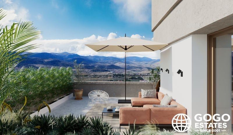 Das Haus verfügt über eine geräumige Terrasse, die perfekt ist, um das mediterrane Klima und die ungehinderten Ausblicke zu genießen. Hochwertige Materialien wie Porzellanfliesen gewährleisten Langlebigkeit und einfache Pflege.
