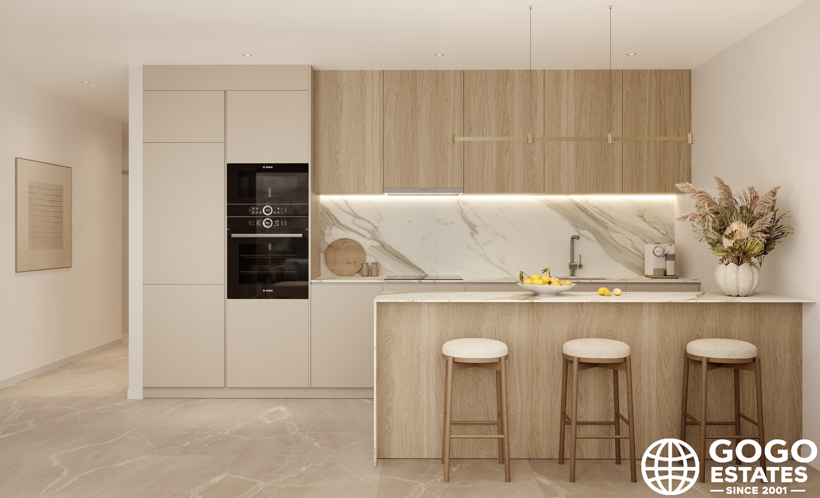 Die Innenräume bestechen durch hochwertige Ausstattungen, darunter Porzellanböden und integrierte Geräte. Eingebaute Schränke bieten effizienten Stauraum, während elektrische Rollläden und eine Video-Gegensprechanlage einen Hauch von Komfort und Sicherheit verleihen.