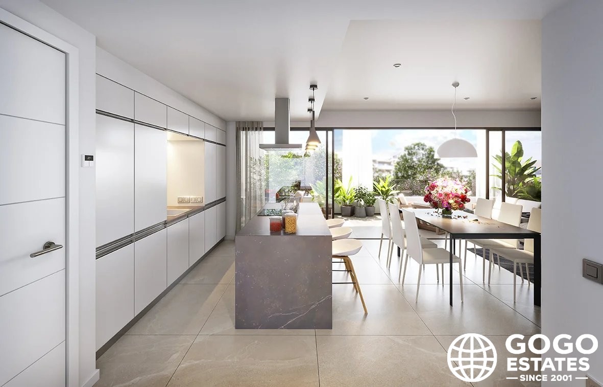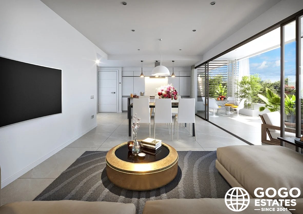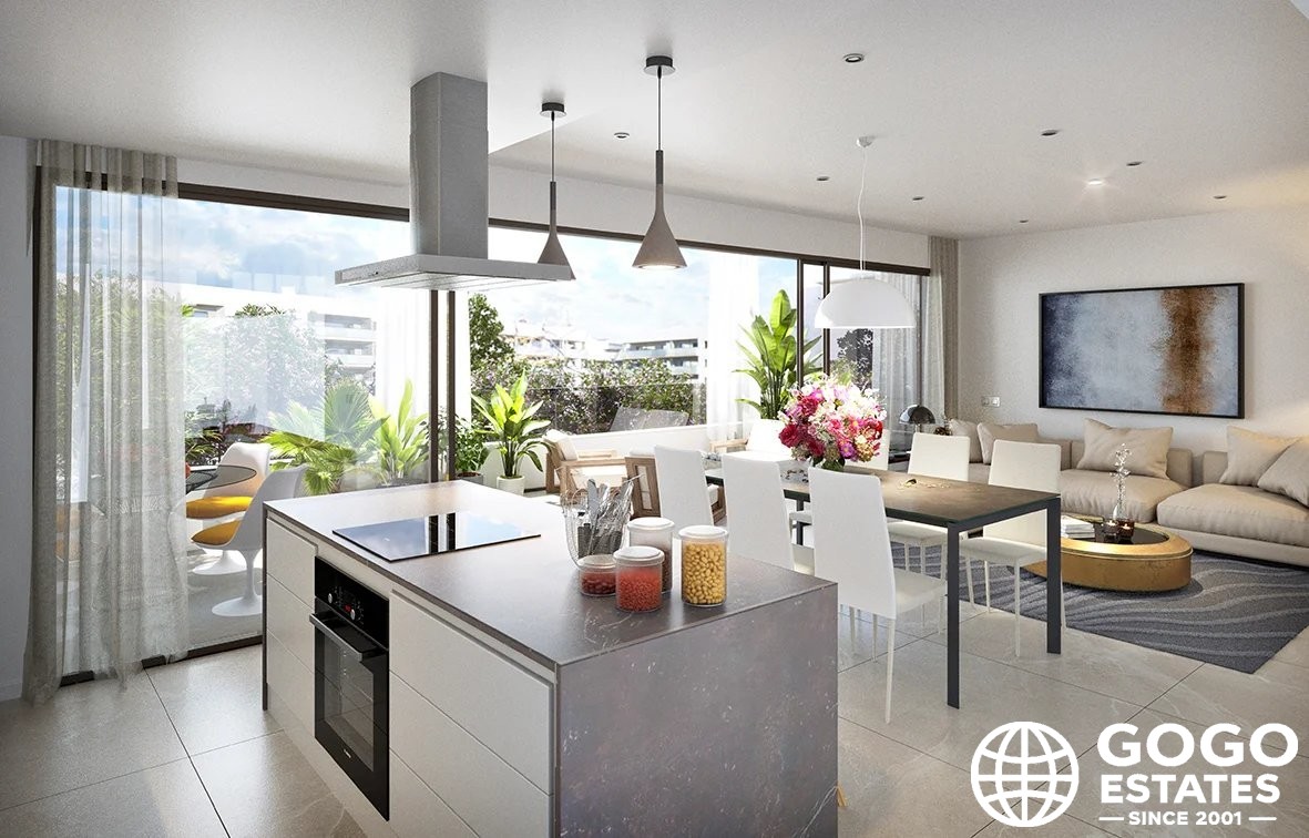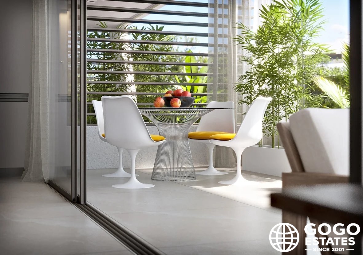 Die Immobilie umfasst eine private Terrasse von 35 m², die perfekt ist, um das mediterrane Klima zu genießen. Die moderne Architektur maximiert das natürliche Licht und die Belüftung und schafft eine einladende Umgebung. Die Innenräume verfügen über Porzellanfliesen, elektrische Rollläden und Klimaanlage.