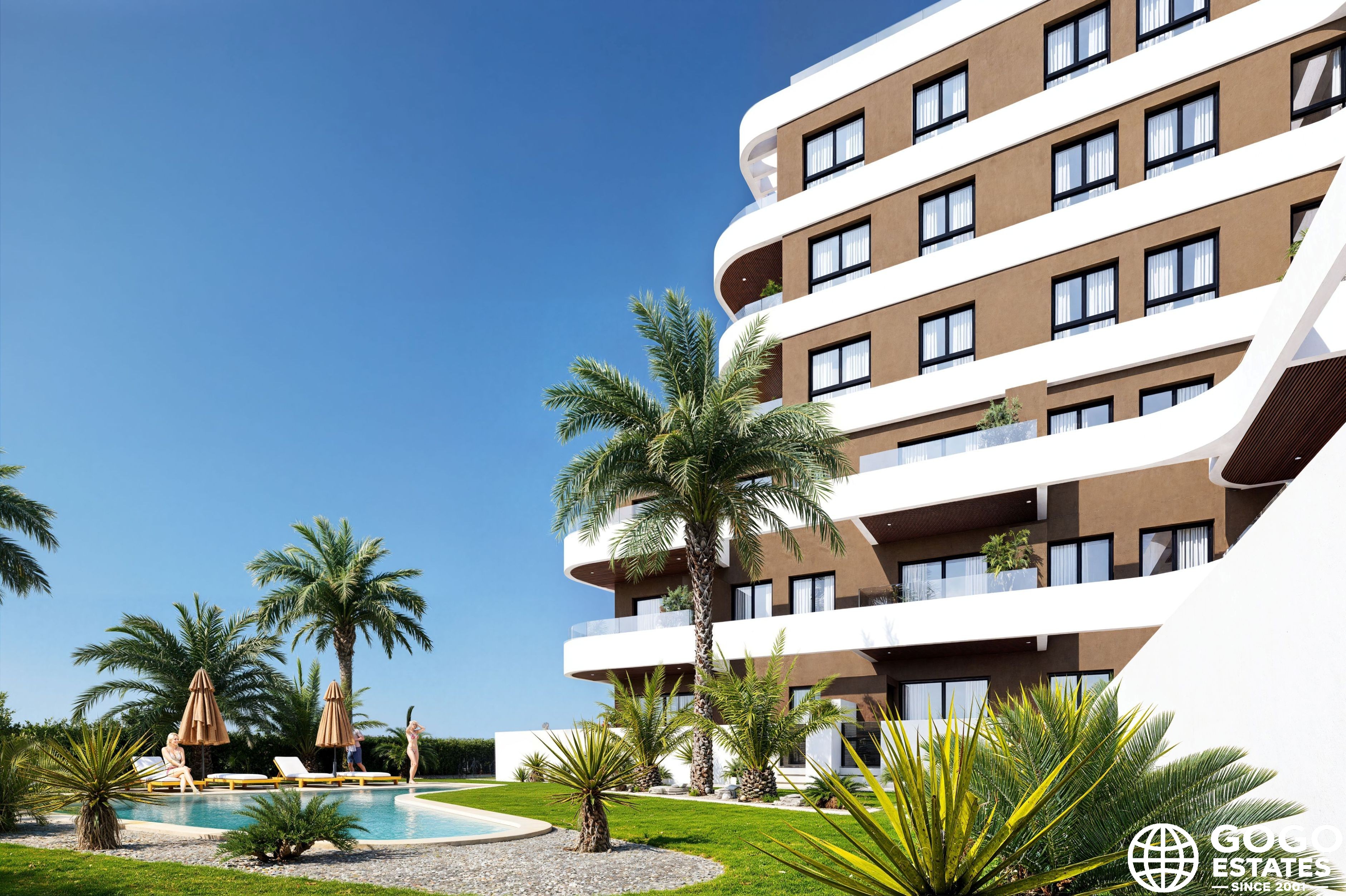 Die Außenbereiche umfassen Terrassen, um das mediterrane Klima zu genießen, wobei einige Einheiten Solariums bieten. Die Gemeinschaftsbereiche verfügen über Gemeinschaftsgärten, einen Pool und eine Garage, die das gemeinschaftliche Wohnen verbessern.