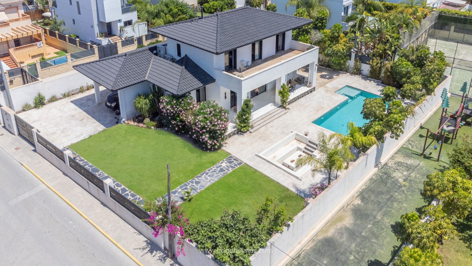 Villa Moderna de Lujo en Ubicación Privilegiada – La Font, Alicante Ubicada en la codiciada zona residencial de La Font, perfectamente situada entre la impresionante Playa de Muchavista y con fácil acceso a la autopista hacia Alicante, esta villa moderna de lujo ofrece un estilo de vida excepcional. Construida sobre una parcela completamente llana, rectangular y privada —casi tres veces más grande que la vivienda—, esta impresionante residencia de 360 m² destaca tanto por su diseño como por su entorno. Gracias a su ubicación estratégica, su arquitectura y su diseño interior contemporáneo, la villa combina espacios amplios y luminosos con materiales y acabados de alta calidad. Entre sus características se incluyen techos altos, una cocina de última generación y amplias zonas de piscina y descanso, lo que la convierte en una oferta verdaderamente única en el mercado. Acceso La propiedad se encuentra en una calle residencial tranquila y de un solo sentido. La entrada es a través de una puerta peatonal o vehicular que conduce a una amplia zona de acceso y garaje, con estacionamiento privado para varios vehículos. Planta Baja Espacio diáfano de salón, comedor y cocina (56,5 m²), con una gran isla central y una cocina moderna y funcional, equipada con electrodomésticos de alta gama. Esta estancia, junto con uno de los dormitorios, se abre a una generosa terraza cubierta con vistas a la piscina, zona de comedor exterior y jardín. Recibidor y aseo de cortesía. Tres dormitorios dobles (uno de ellos actualmente utilizado como despacho), incluyendo una suite principal con baño y vestidor. Amplia zona de lavandería y plancha. Planta Superior Dos dormitorios dobles adicionales con armarios empotrados. Zona de estar con acceso directo a una terraza de 32 m² con tarima de madera, que ofrece vistas panorámicas de los alrededores. Exteriores Piscina en forma de "L" (44 m²) con una zona chill-out contigua de 20 m². Jardines ajardinados con árboles maduros y arbustos mediterráneos. Zona pavimentada de aparcamiento y tránsito de aproximadamente 230 m². La mayor parte de la parcela está acondicionada con terrazas, ofreciendo múltiples espacios para el relax, el entretenimiento y la vida al aire libre. Esta hermosa y moderna casa de lujo es una joya poco común y una oportunidad que no debe dejarse pasar.