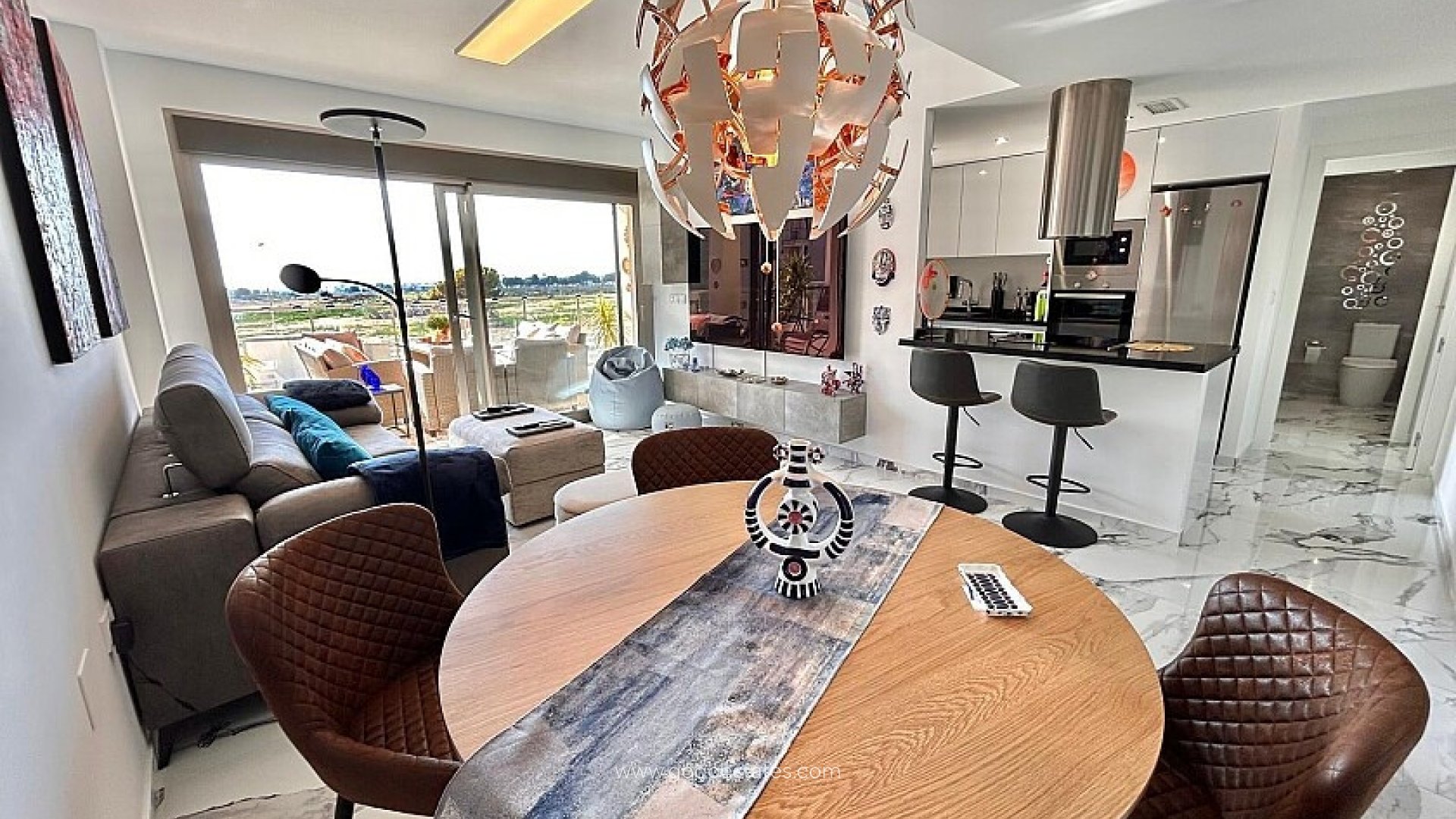 Apartamento de 2 dormitorios en Villamartín . Apartamento de 2 dormitorios y 2 baños en Villamartín. Tiene amplias terrazas, todas orientadas al sur, con vistas de La Zenia y el mar. Se vende totalmente equipado con electrodomésticos, baños completos con muebles, lámparas y luces LED y aire acondicionado completo. La zona comunitaria dispone de amplios jardines, tres piscinas (una climatizada) y zona de juegos infantiles. Dispone además de plaza de garaje y trastero propios. Idealmente situado cerca de los campos de golf (Villamartín, Las Ramblas, Campoamor y Las Colinas), de las playas de bandera azul de Orihuela Costa y del centro comercial Zenia Boulevard.