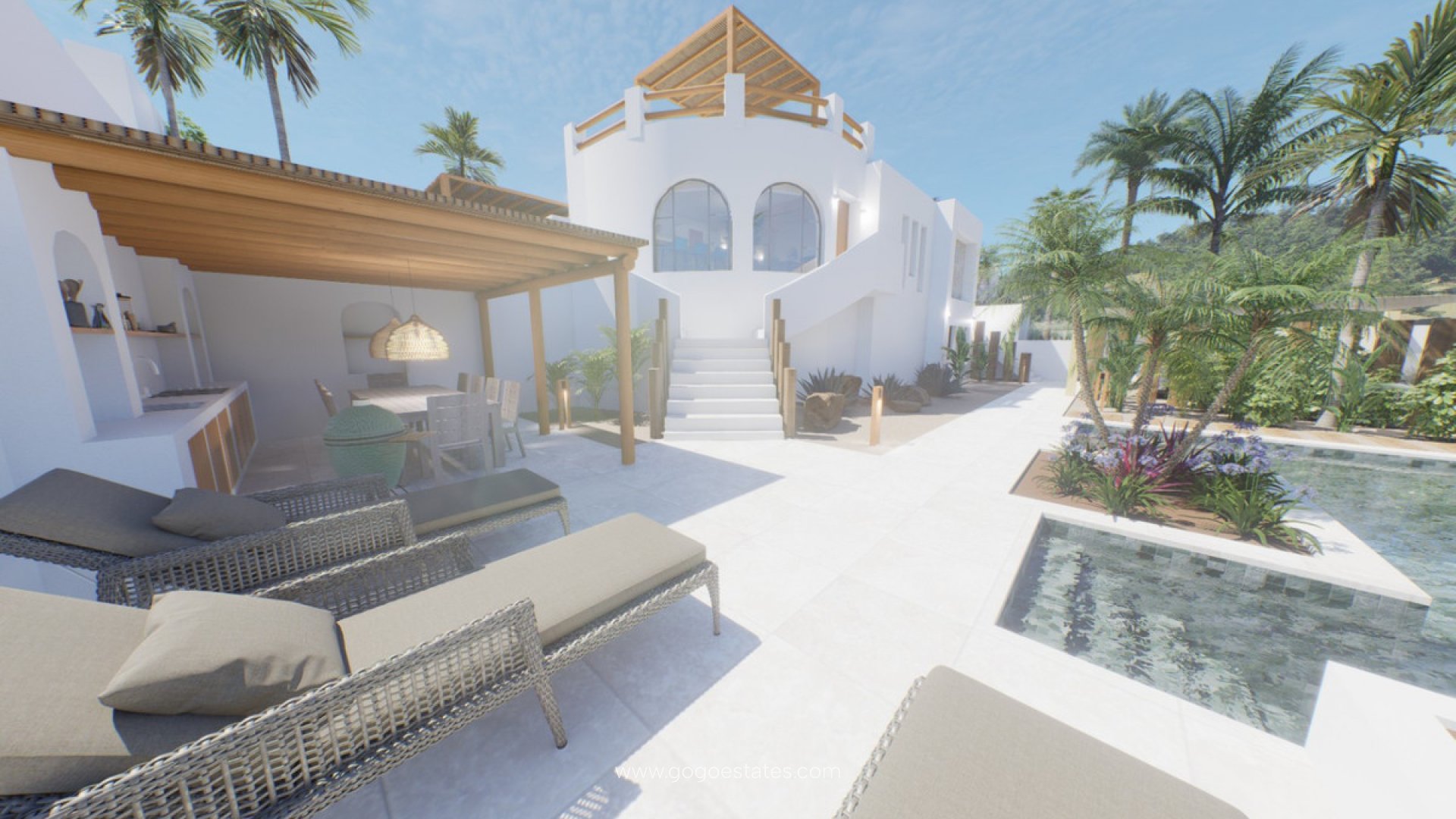 Proyecto de renovación: villa en venta en Montemar, Benissa Del estilo tradicional al estilo ibicenco con carácter, confort y placer de vivir moderno. Ese es el objetivo de este nuevo proyecto de renovación en Benissa. Una propiedad donde la tranquilidad, el confort y el lujo se unen. Situada en el tranquilo y verde barrio de Montemar, esta villa se encuentra en una ubicación central entre la encantadora ciudad costera de Moraira y la más auténtica Benissa - ambas a sólo 10 minutos en coche. Se trata de un proyecto de renovación completa con un énfasis en el detalle y la calidad. En el interior, encontrará un generoso espacio de estar de planta abierta con una transición natural a la lujosa cocina equipada. Gracias a su orientación sureste, disfrutará de mucha luz natural y de un agradable sol de tarde tanto en el interior como en el exterior. La villa cuenta con tres amplios dormitorios, cada uno con su propio cuarto de baño y armarios empotrados. Desde los dormitorios, tendrá vistas a la vegetación circundante, un oasis de tranquilidad. El espacio exterior está diseñado para una vida al aire libre óptima. El precioso jardín paisajista con plantas mediterráneas prepara el escenario para la hermosa piscina. Hay una cocina exterior totalmente equipada y varias zonas para sentarse, donde podrá retirarse un rato o simplemente pasar el tiempo en buena compañía incl. azotea. Habrá una preinstalación para paneles solares, aire acondicionado con bomba de calor, doble acristalamiento y una caldera eléctrica de 200 litros. También se proporcionará un sistema de alarma. Además, la villa cuenta con un amplio camino de entrada para dos coches y un lavadero y trastero independientes. Si deseado se puede hacer un estudio para ofrecer un pack de muebles y decoración según el gusto del cliente. A sólo 3 km de distancia se encuentra la hermosa bahía de Baladrar, y la playa de arena de Moraira también se puede llegar en 10 minutos. Para sus compras, se puede llegar a un pequeño supermercado en 4 minutos; supermercados más grandes están a 10 minutos en Benissa. Este es otro proyecto divertido que recomendamos encarecidamente. Haga una cita con uno de nuestros asesores hoy mismo. El precio mostrado no incluye impuestos ni gastos de compra / La oferta está sujeta a errores, cambios de precio, disponibilidad, omisión y/o retirada del mercado sin previo aviso / Muebles y contenidos según acuerdo personalizado y no según las fotos de la presentación