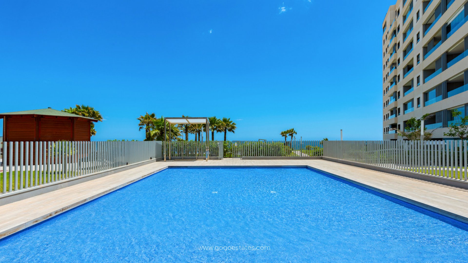 Fantástico y exclusivo apartamento de lujo en primera línea de mar, con 2 dormitorios, en la quinta planta y vistas al mar, situado en la popular zona de Punta Prima, Alicante. Este proyecto de diseño vanguardista se encuentra en una ubicación única, con amplias zonas comunes ajardinadas y unas vistas al mar inmejorables. El apartamento se vende completamente amueblado y consta de un amplio y luminoso salón-comedor, una moderna cocina totalmente equipada, dos dormitorios con armarios empotrados, dos baños con suelo radiante, portero automático, aire acondicionado (frío/calor) en toda la vivienda, una plaza de aparcamiento subterráneo asignada y un trastero. Dispone de un precioso jardín comunitario con varias piscinas, una piscina climatizada, una piscina infantil, una piscina infinita y un jacuzzi.