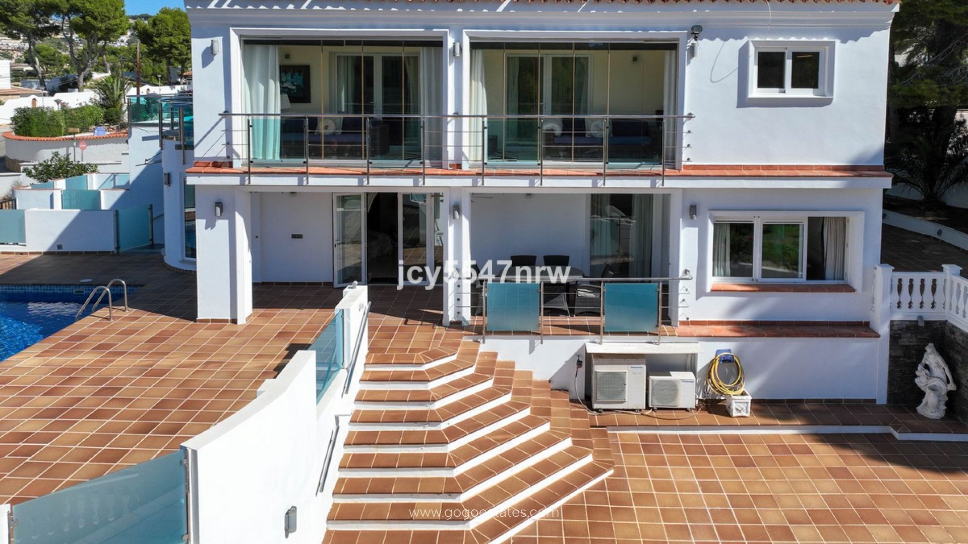 Villa de Ensueño en San Jaime: Lujo, Privacidad y Cercanía al Mar Ubicada en la popular urbanización de San Jaime, en la frontera entre Moraira y Benissa, se encuentra esta impresionante villa. En primer lugar, la parcela esquinera sobre la que se encuentra la villa está equipada con dos portones eléctricos de acceso para coches y una puerta peatonal, lo que facilita un acceso cómodo. La villa se distribuye en dos plantas. Debajo de la piscina, hay una amplia zona que se puede convertir en una cocina exterior o un gimnasio, según tus deseos. Además, hay una zona de aparcamiento privado accesible desde el lado de la calle y un garaje ubicado debajo de la terraza de la piscina, accesible desde el otro lado. Debajo de la piscina y la terraza, encontrarás una gran sala técnica para las instalaciones de la piscina, y en la parte trasera de la villa, también hay una sala técnica más pequeña. La villa cuenta con varias terrazas que ofrecen hermosas vistas de los terrenos y la naturaleza circundante. Además, no solo dispone de una atractiva piscina con ducha exterior, sino también de una encantadora zona para el jacuzzi. La parcela adyacente está incluida en la venta y tiene su propio portón eléctrico de acceso. Actualmente se utiliza como jardín, pero también se puede emplear para construir, por ejemplo, una casita o una pista de tenis (se deberá solicitar un permiso de construcción). El tamaño de la parcela es único dentro de la urbanización, ya que normalmente se construyen dos villas en una parcela de este tamaño. La villa está a solo unos minutos a pie de tiendas, restaurantes, un campo de golf y las playas. Esto ofrece la combinación perfecta de proximidad al mar, sin renunciar a la privacidad y tranquilidad. Además, la seguridad de la urbanización proporciona un ambiente seguro. Al entrar en la villa, inmediatamente experimentarás su ambiente lujoso y luminoso. En la planta baja, encontrarás el salón con puertas dobles que dan acceso a la terraza y la piscina. Esta zona de estar fluye hacia el comedor y una amplia y bien equipada cocina. En la parte trasera de la villa, tendrás acceso a la terraza, perfecta para comer al aire libre. Además, en la planta baja, hay un aseo de cortesía con ducha y dos dormitorios con baños en suite (uno con ducha y el otro con ducha y bañera). Uno de estos dormitorios tiene acceso a su propia terraza, y ambos están equipados con hermosos armarios empotrados con iluminación. Una elegante escalera te lleva a la planta superior, donde encontrarás espacio adicional de almacenamiento y acceso a un balcón estrecho que rodea la parte trasera y lateral de la villa. Este balcón es accesible desde dos dormitorios. Aquí también encontrarás un dormitorio con armarios empotrados y baño en suite con bañera, así como un dormitorio con armarios empotrados y baño en suite con ducha. Este dormitorio también da acceso a una amplia terraza. Finalmente, está el espacioso dormitorio principal, nuevamente equipado con armarios empotrados y acceso a una gran terraza. Este dormitorio principal tiene baño en suite con bañera y ducha. Un verdadero bonus es la terraza con vistas al mar, completamente equipada con cortinas de cristal, lo que la convierte en un lugar encantador para disfrutar incluso en períodos más fríos. Para mayor comodidad, la villa puede ser calentada por la chimenea del salón, las unidades de aire acondicionado (que también pueden enfriar) y radiadores en todas las habitaciones, incluidos los radiadores para toallas en los baños. ¡Te invitamos cordialmente a experimentar esta hermosa villa por ti mismo y descubrir el lujo que esta propiedad tiene para ofrecer!