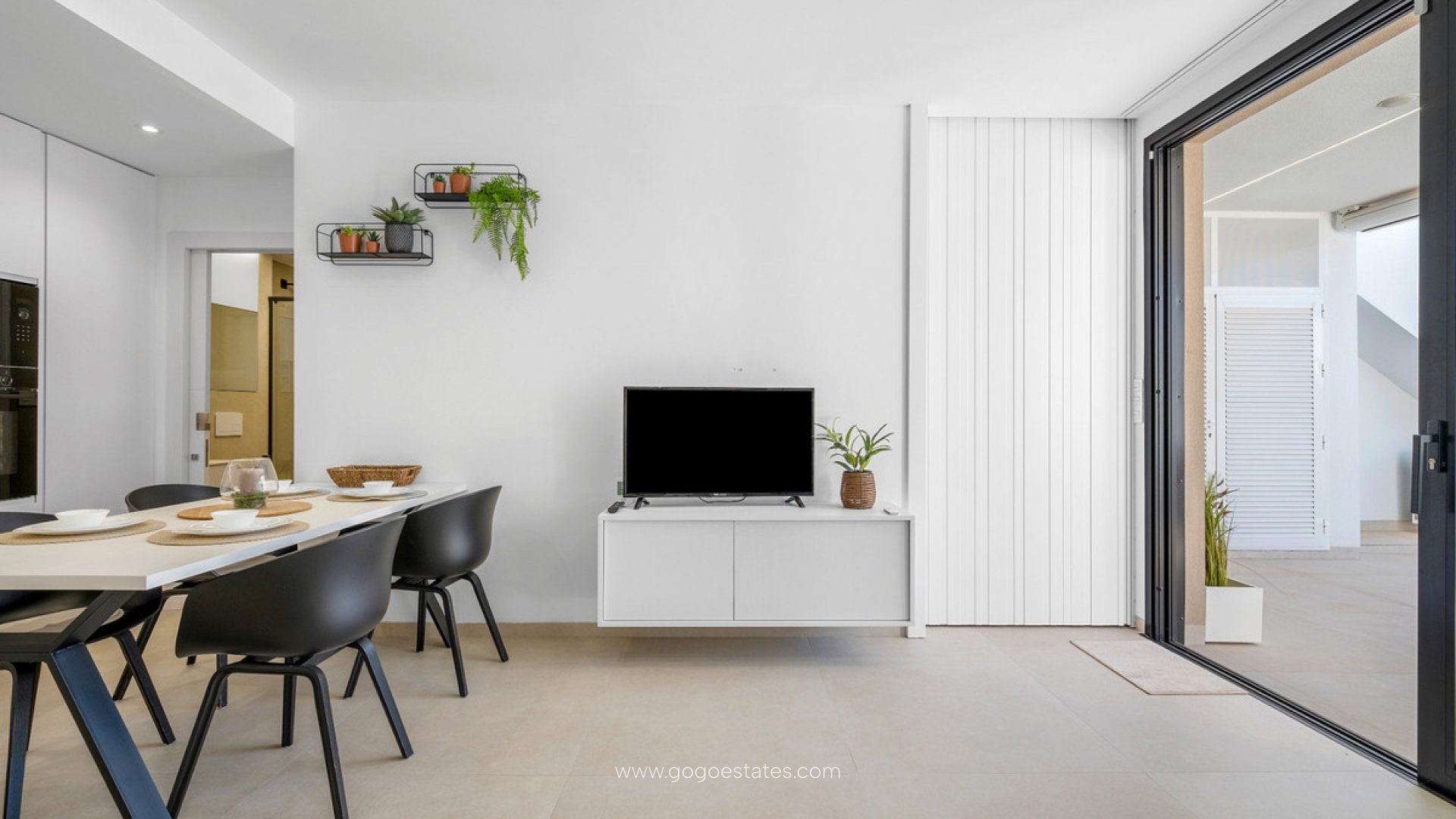 Este elegante apartamento en planta baja en San Pedro del Pinatar ofrece la combinación perfecta de confort, lujo y comodidad. Ubicado a poca distancia del supermercado Consum, el mercado semanal y el vibrante centro de la ciudad, es ideal para quienes buscan disfrutar de lo mejor de la región. Al entrar, los acabados de alta calidad se hacen evidentes de inmediato. El apartamento está completamente amueblado y decorado con buen gusto, lo que facilita una mudanza sin complicaciones. Con dos amplios dormitorios, dos lujosos baños y un salón abierto y luminoso, este espacio es perfecto para relajarse y disfrutar. Los amplios ventanales permiten que la luz natural inunde el espacio, creando un ambiente cálido y acogedor. Hay una gran terraza, parcialmente cubierta, donde podrá disfrutar del clima español con total privacidad. Las instalaciones comunes son de la más alta calidad, incluyendo una piscina climatizada y un jacuzzi para una relajación total. Gracias a los paneles solares instalados, que reducen los costes de energía comunitaria, el apartamento también es una opción energéticamente eficiente. Construido a finales de 2023, el apartamento ofrece numerosas comodidades modernas, como aire acondicionado, persianas eléctricas, suelo radiante en los baños y amplio espacio de almacenamiento con armarios empotrados. Está listo para entrar a vivir, con todo lo necesario, desde muebles hasta lavadora. ¡Aproveche las ventajas de un apartamento seminuevo y pague un impuesto de transmisiones patrimoniales más bajo que en las obras nuevas! Esta es la oportunidad perfecta para disfrutar del lujo, la comodidad y una excelente ubicación en la costa española a un precio asequible.