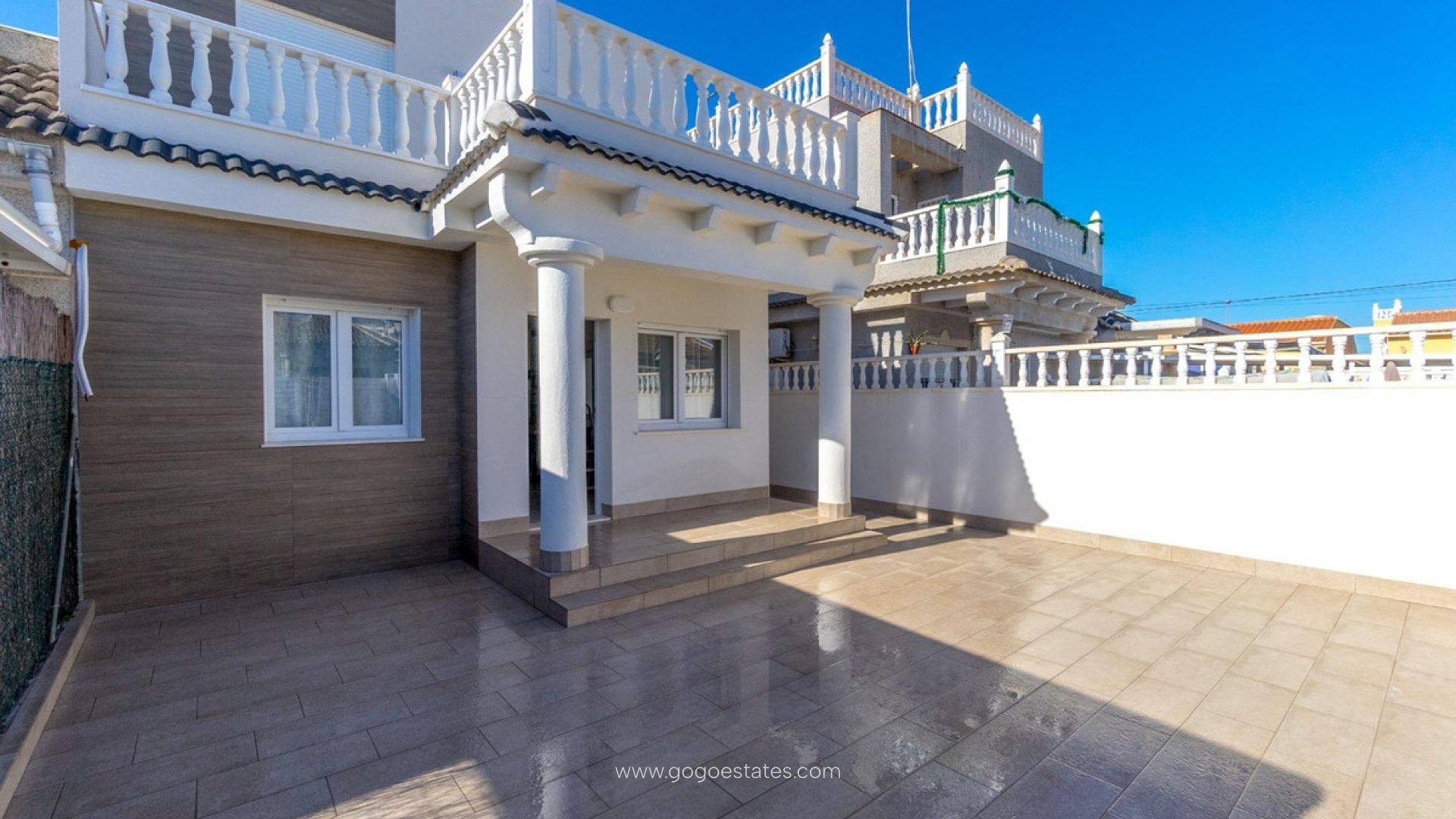 Chalet pareado recién reformado en El Chaparral, situado a poca distancia en coche de tiendas, bares, restaurantes, supermercados y la ciudad de Torrevieja. Esta separado en dos viviendas con los accesos independientes. En la planta baja tenemos una vivienda de 54m2 de área, que consta de 2 dormitorios, un baño, salón-comedor, cocina americana. En la planta primera un apartamento con su entrada independiente de unos 35m2, que consta de 1 dormitorio doble, salón, tiene su propia cocina y baño; con una amplia terraza con las vistas a los alrededores. La reforma integral realizada recientemente con los materiales de calidad y moderno diseño interior. Suelo radiante en los baños. Se vende con muebles y electrodomésticos a estrenar. Sitio para aparcar el coche en la parcela. Este chalet ofrece una armoniosa combinación de comodidad y estilo.