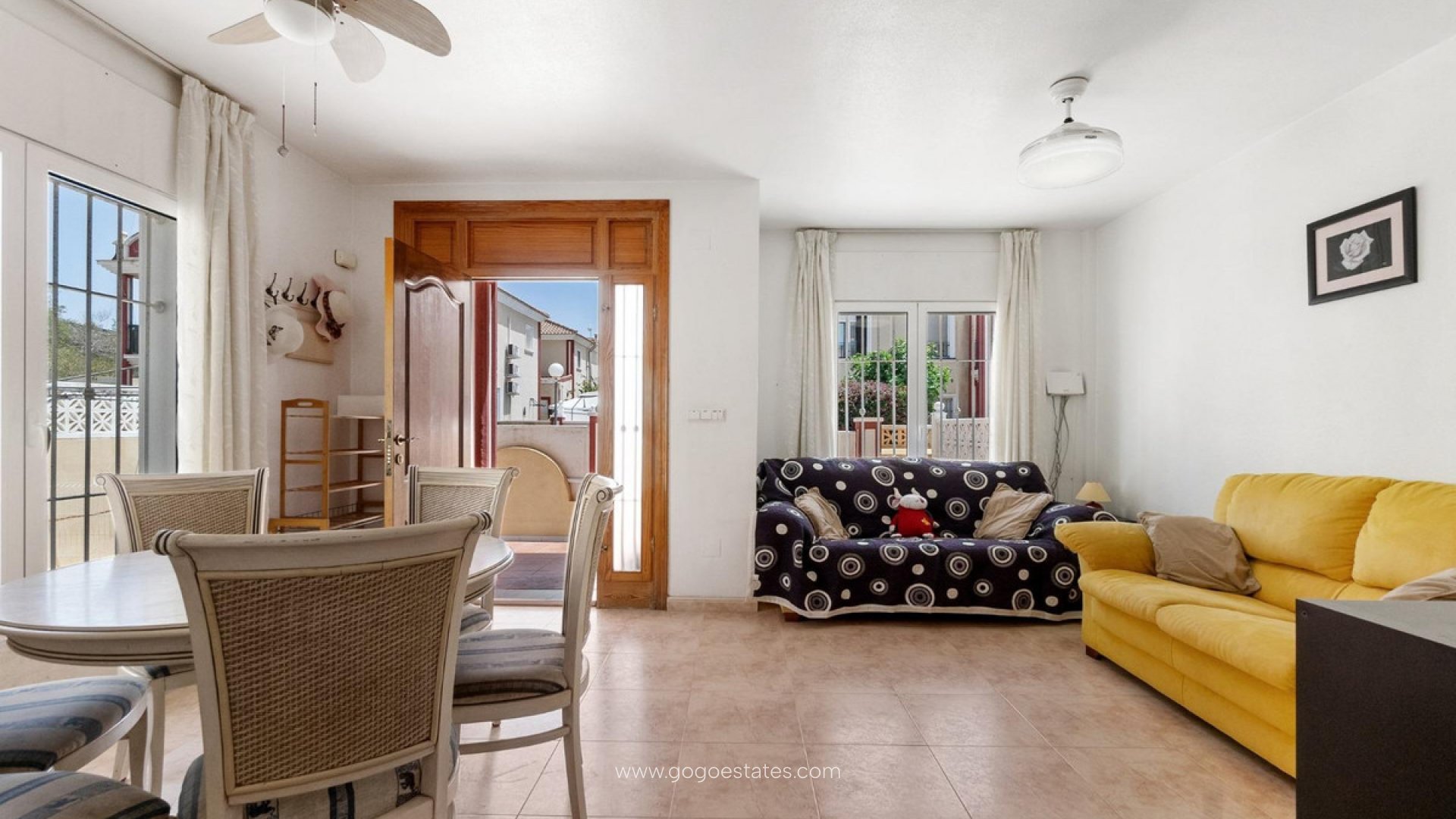 Chalet adosado con piscina propia, ubicado en Campoamor, un entorno verde y tranquilo, solamente a 600m de la playa. La vivienda de 92m2, con 3 dormitorios, 2 baños, salón -comedor, una cocina independiente equipada, con un grande patio/lavadero. La planta baja consta de una terraza delantera, salón, un baño y la cocina con el lavadero. En la primera planta encontramos 3 dormitorios dobles, y un cuarto de baño. El dormitorio principal tiene una terraza con las vistas al residencial. Se vende amueblada. A/A instalado en cada habitación. Gran selección de servicios y el puerto deportivo están a poca distancia.~