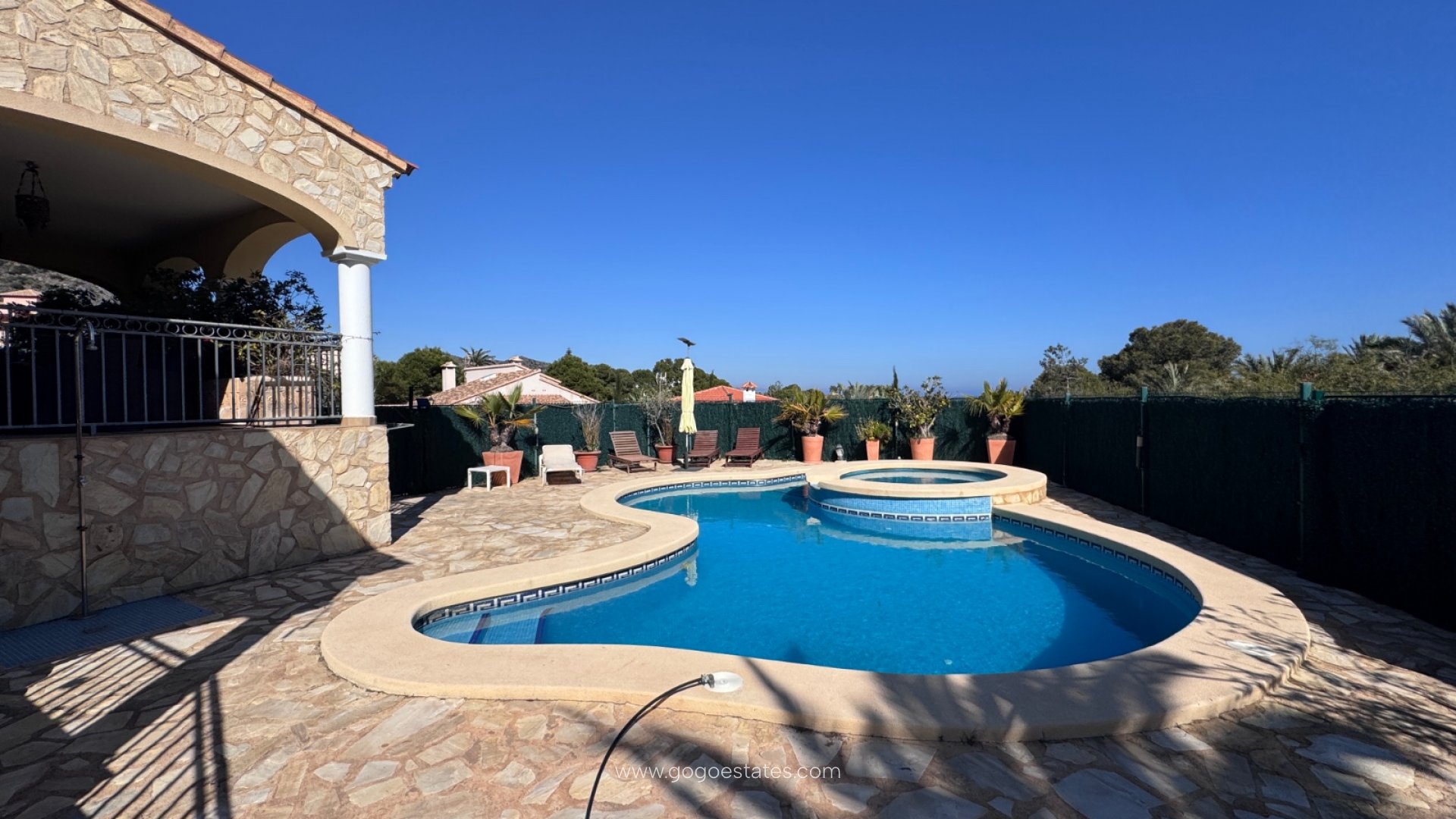 En el corazón del jardín se encuentra una impresionante piscina con cascada, revestida con azulejos de estilo clásico Roman decoration. Fabricada en una sola pieza, alcanza una profundidad de 1,9 metros en su punto más profundo. No es solo decorativa, sino una piscina diseñada para nadar y disfrutar plenamente.