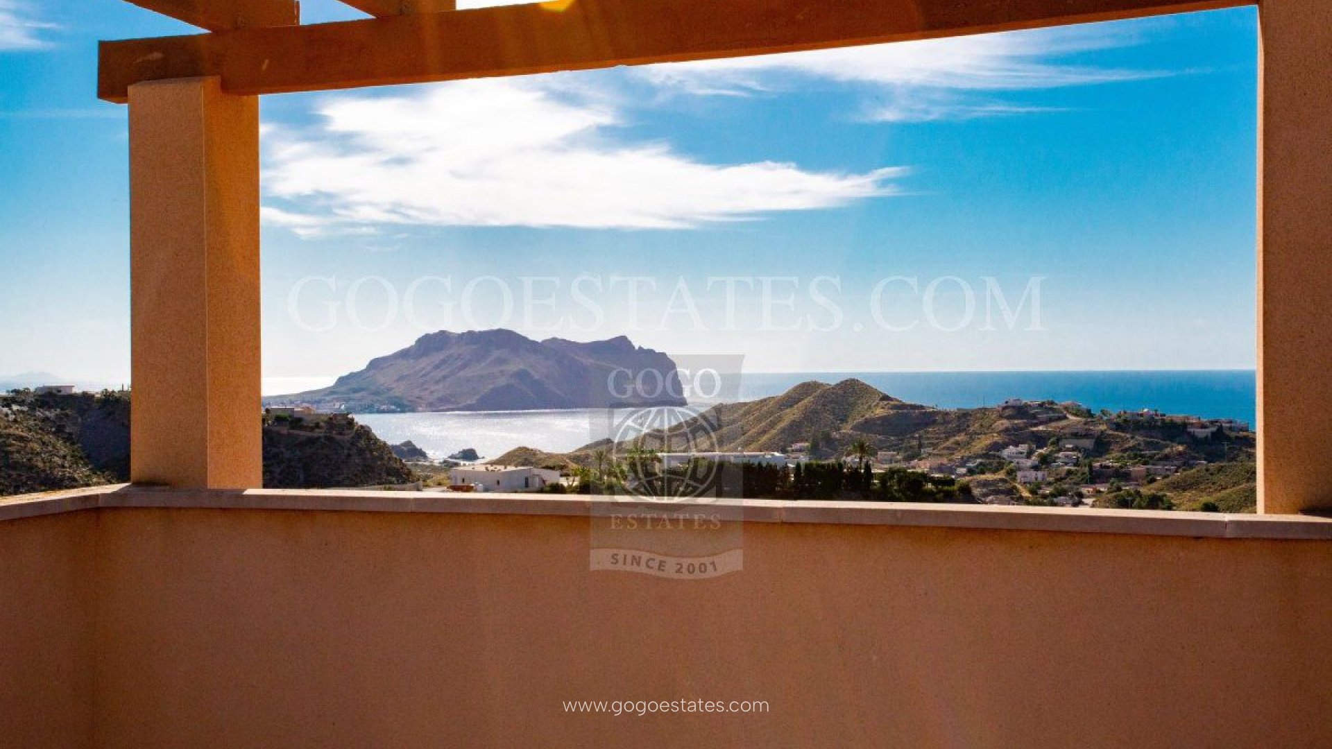 Terraza del apartamento y vista excepcional al mar y paisaje de montaña.
