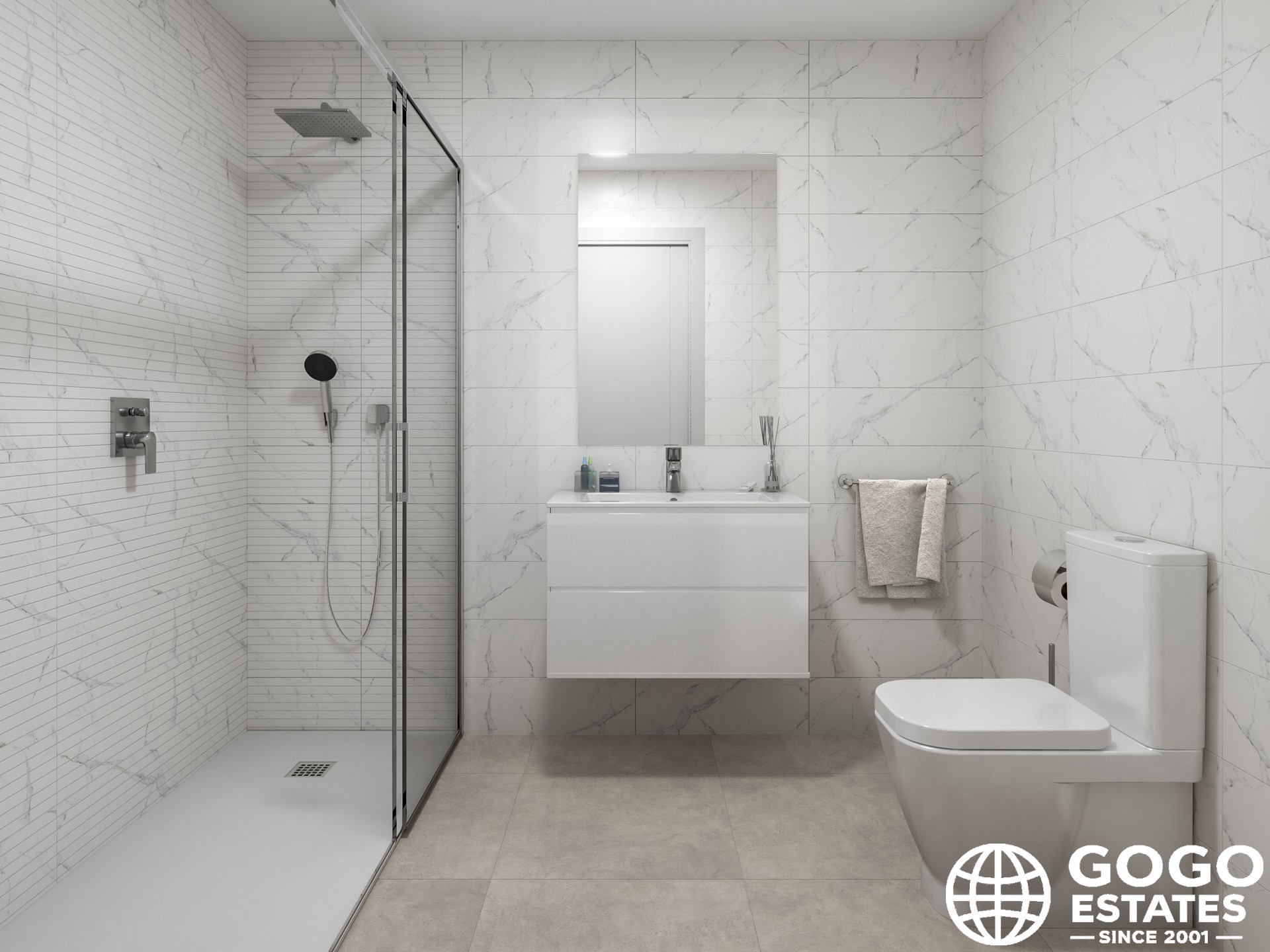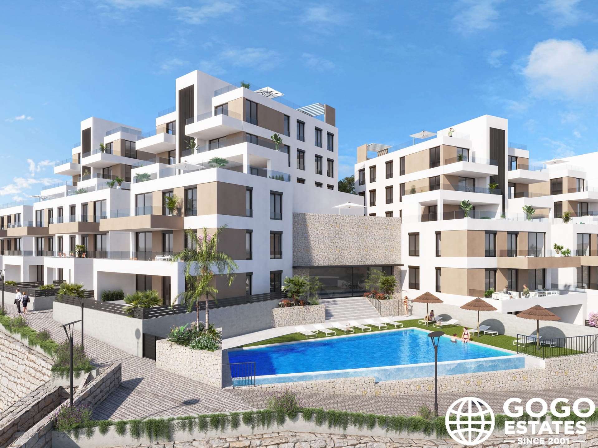 El apartamento cuenta con una terraza privada, ideal para disfrutar del clima mediterráneo. En el interior, los suelos de porcelana y las persianas eléctricas añaden un toque moderno, mientras que el aire acondicionado preinstalado garantiza comodidad. La cocina está equipada con electrodomésticos y los armarios empotrados ofrecen un amplio espacio de almacenamiento.