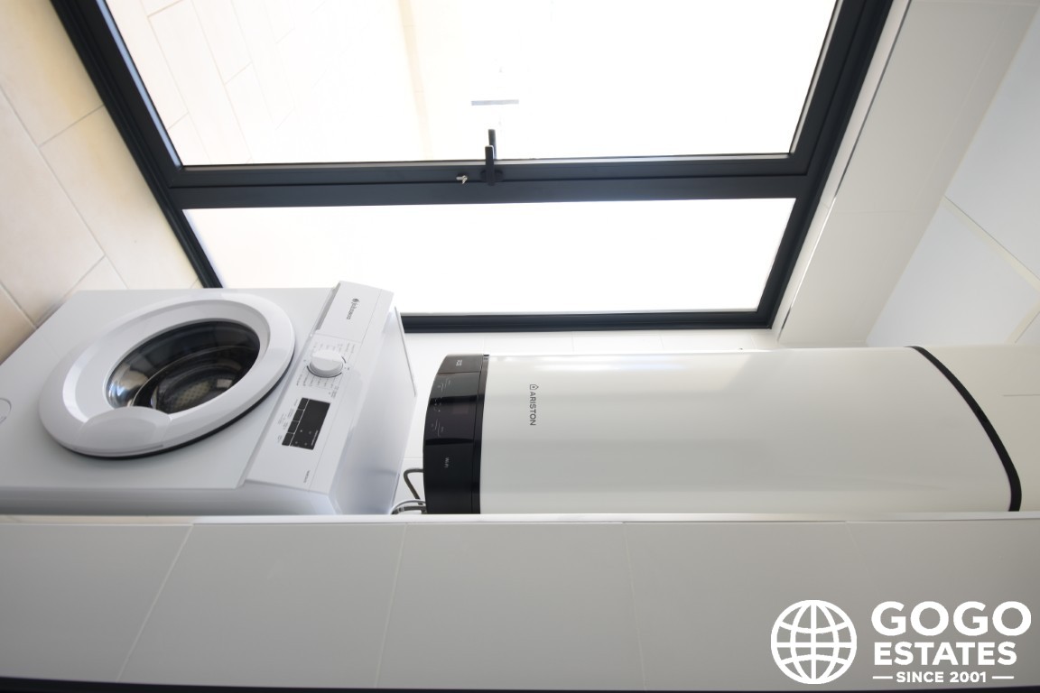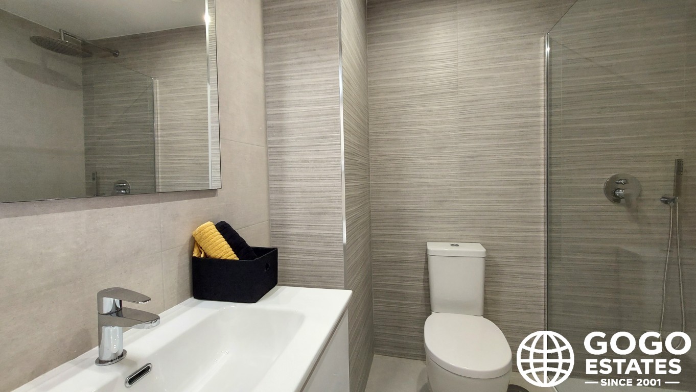 El apartamento cuenta con una superficie construida de 96 m² y una generosa terraza de 25 m², perfecta para disfrutar del clima mediterráneo. En el interior, encontrarás aire acondicionado, armarios empotrados y electrodomésticos modernos, complementados por elegantes suelos de porcelanato.