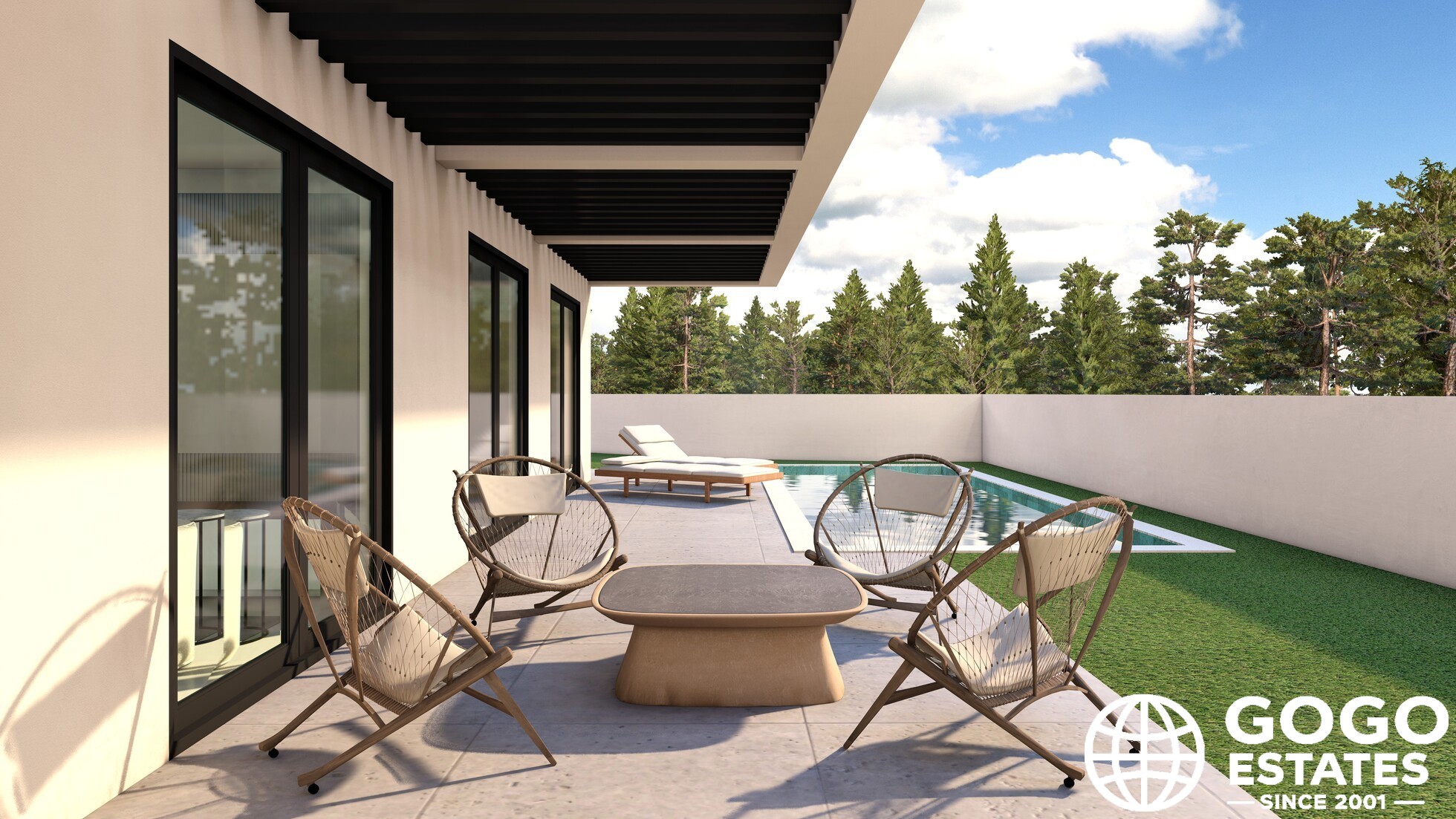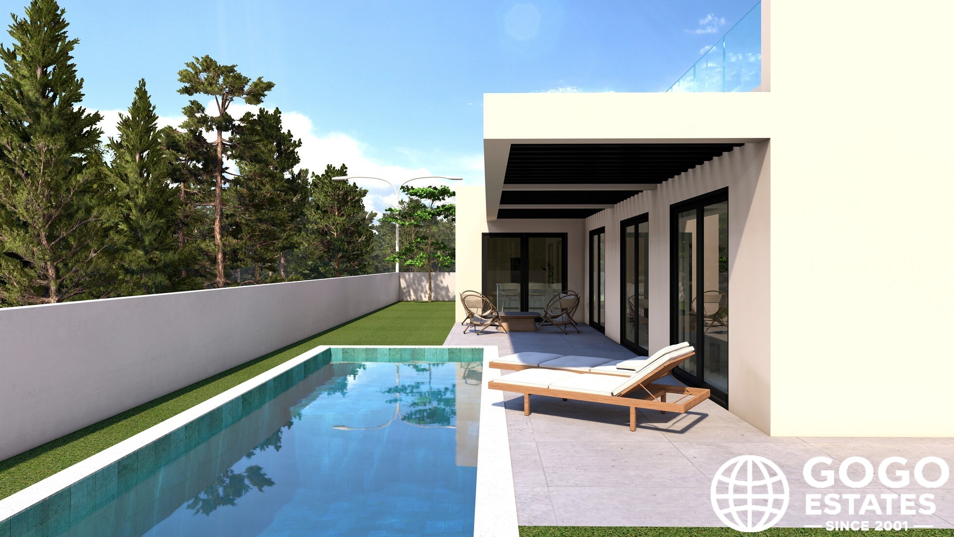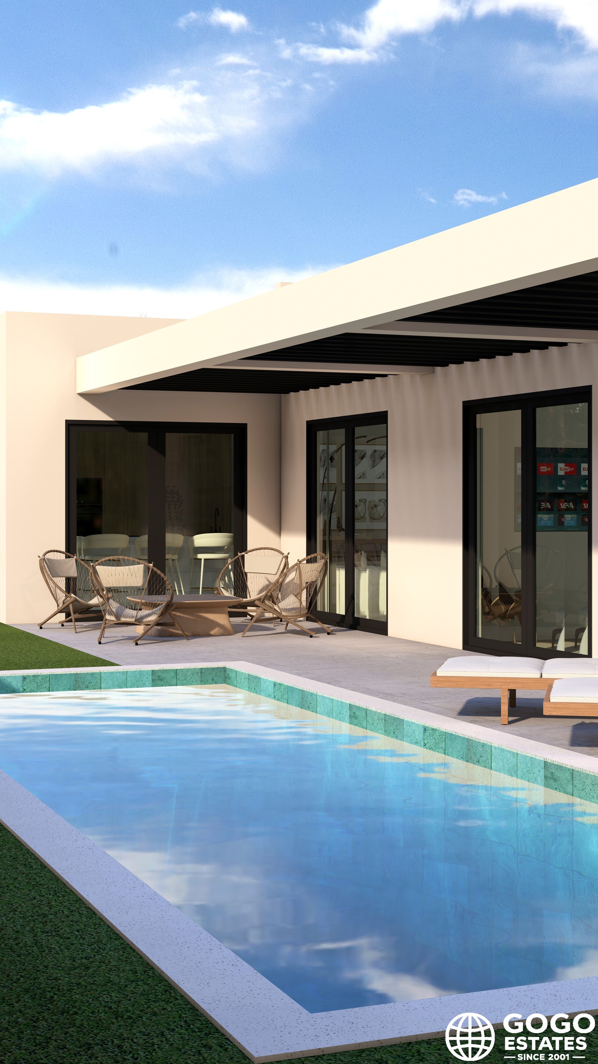 El diseño exterior integra la arquitectura moderna con el entorno natural. Cada hogar cuenta con una piscina privada y solárium, perfectos para disfrutar del clima mediterráneo. Un garaje privado garantiza comodidad y seguridad.