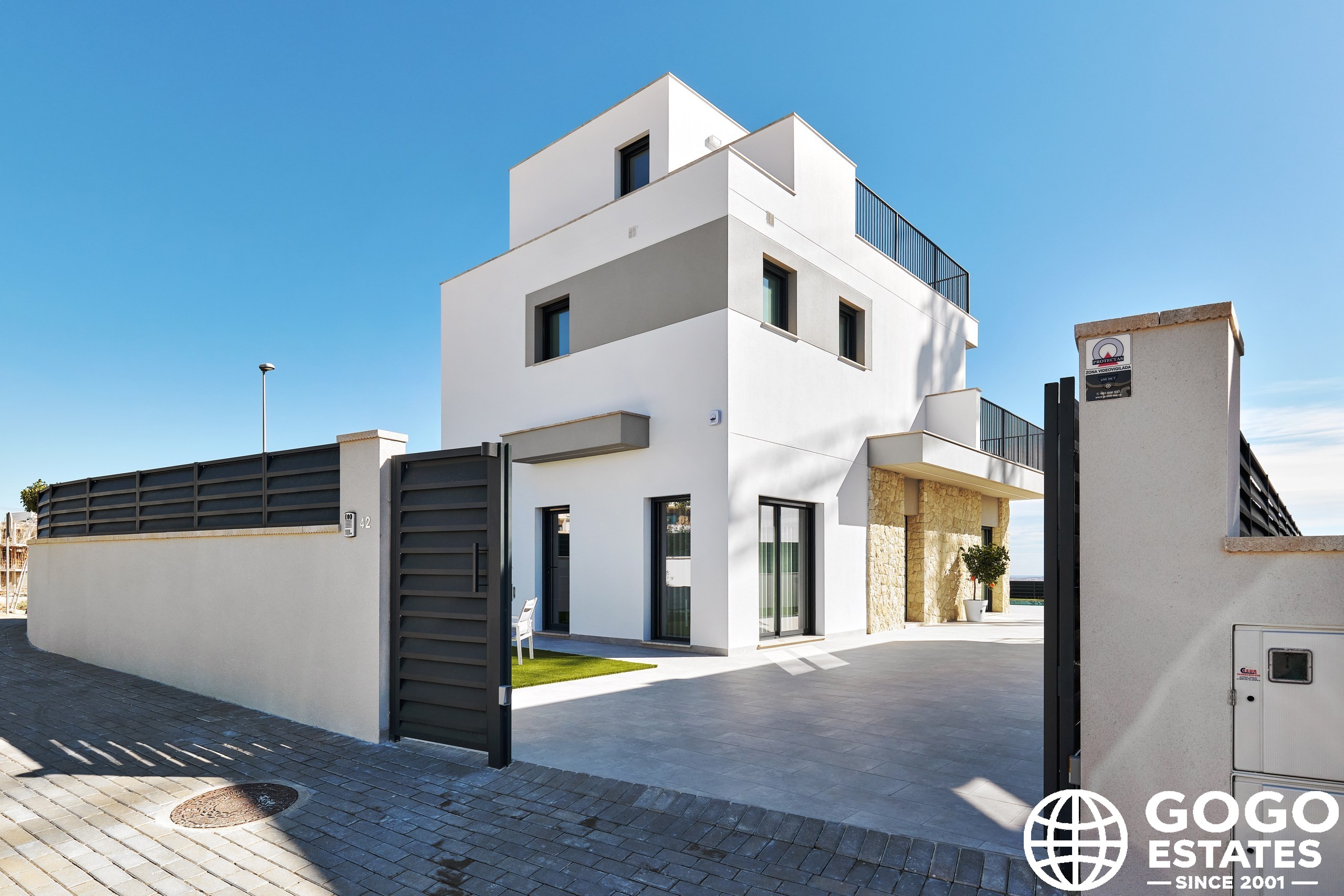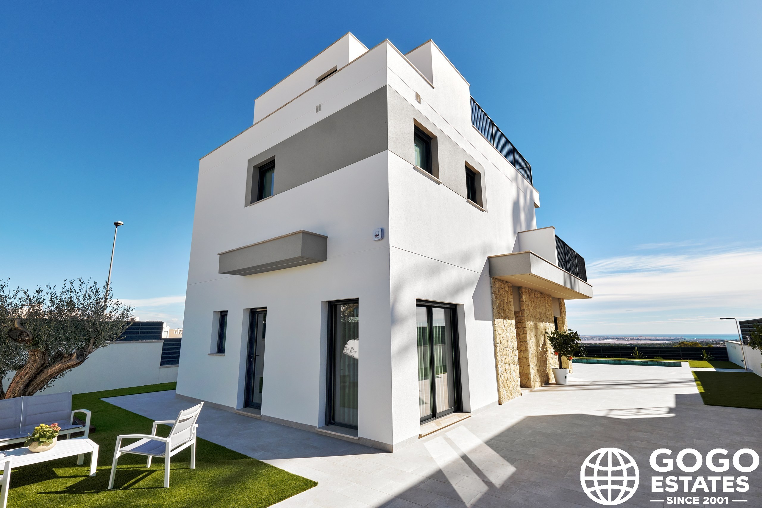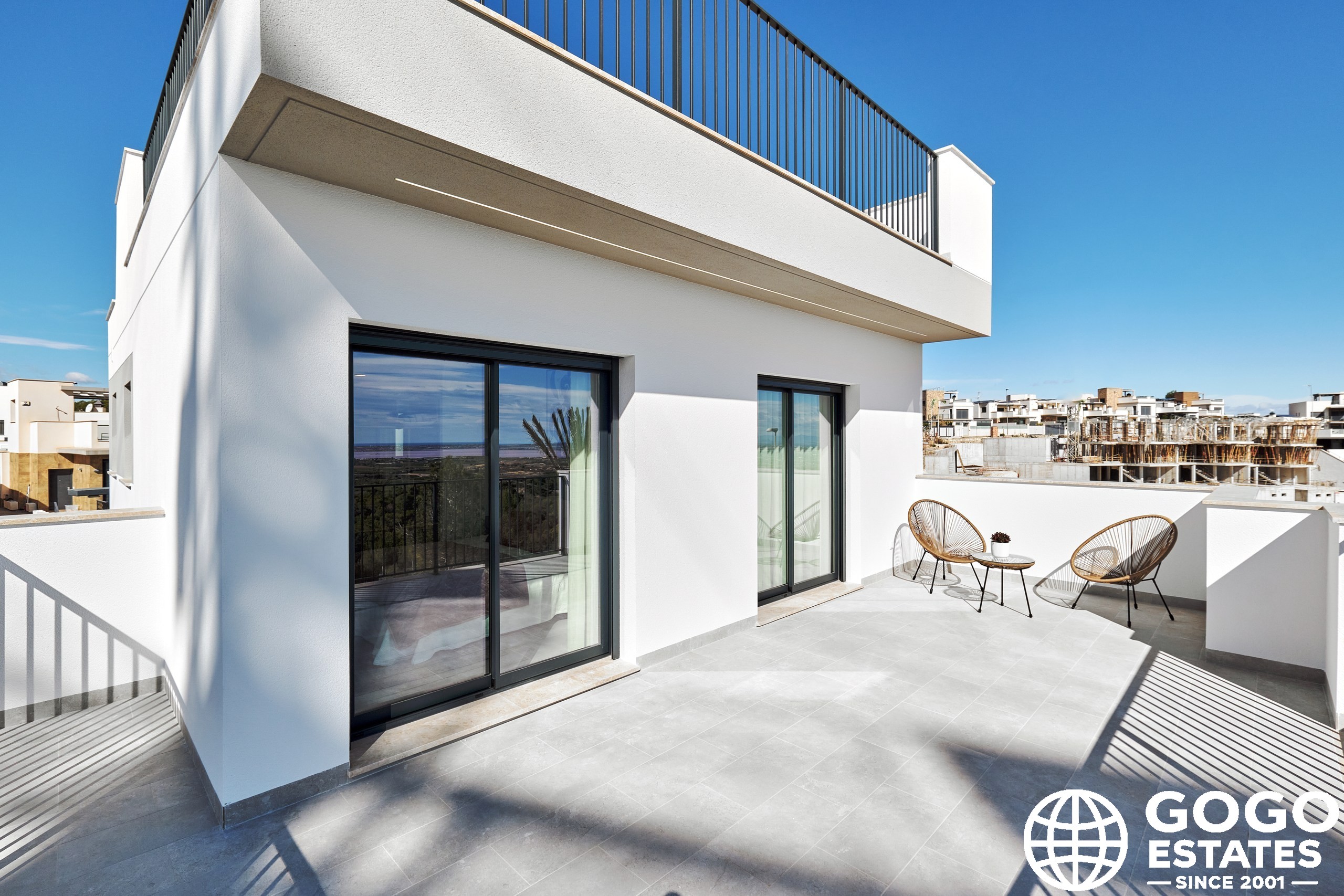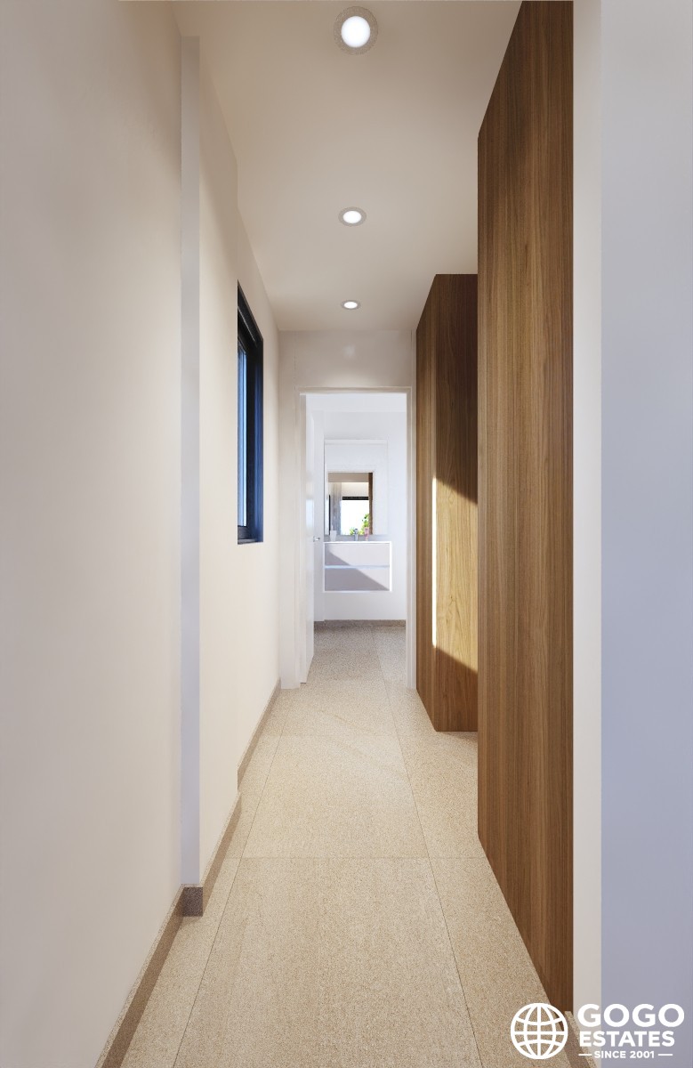 La villa incluye una terraza, perfecta para disfrutar del clima mediterráneo, y hay una opción para un solárium para espacio exterior adicional. Los interiores están diseñados para la comodidad y funcionalidad, equipados con aire acondicionado, persianas eléctricas y armarios empotrados.