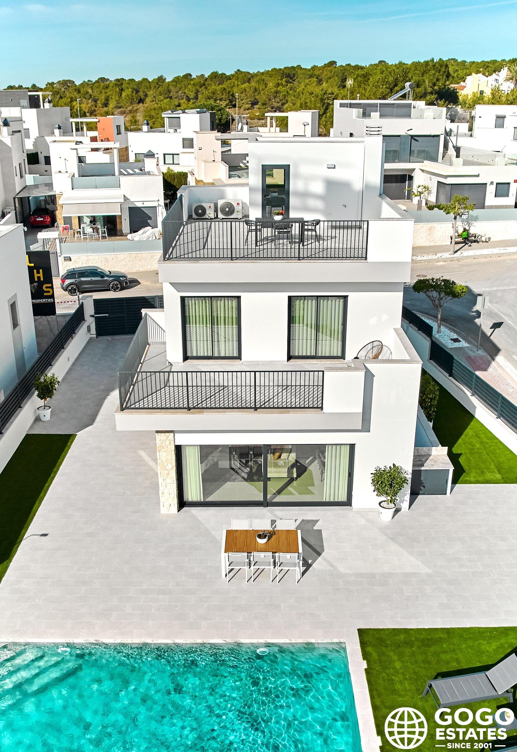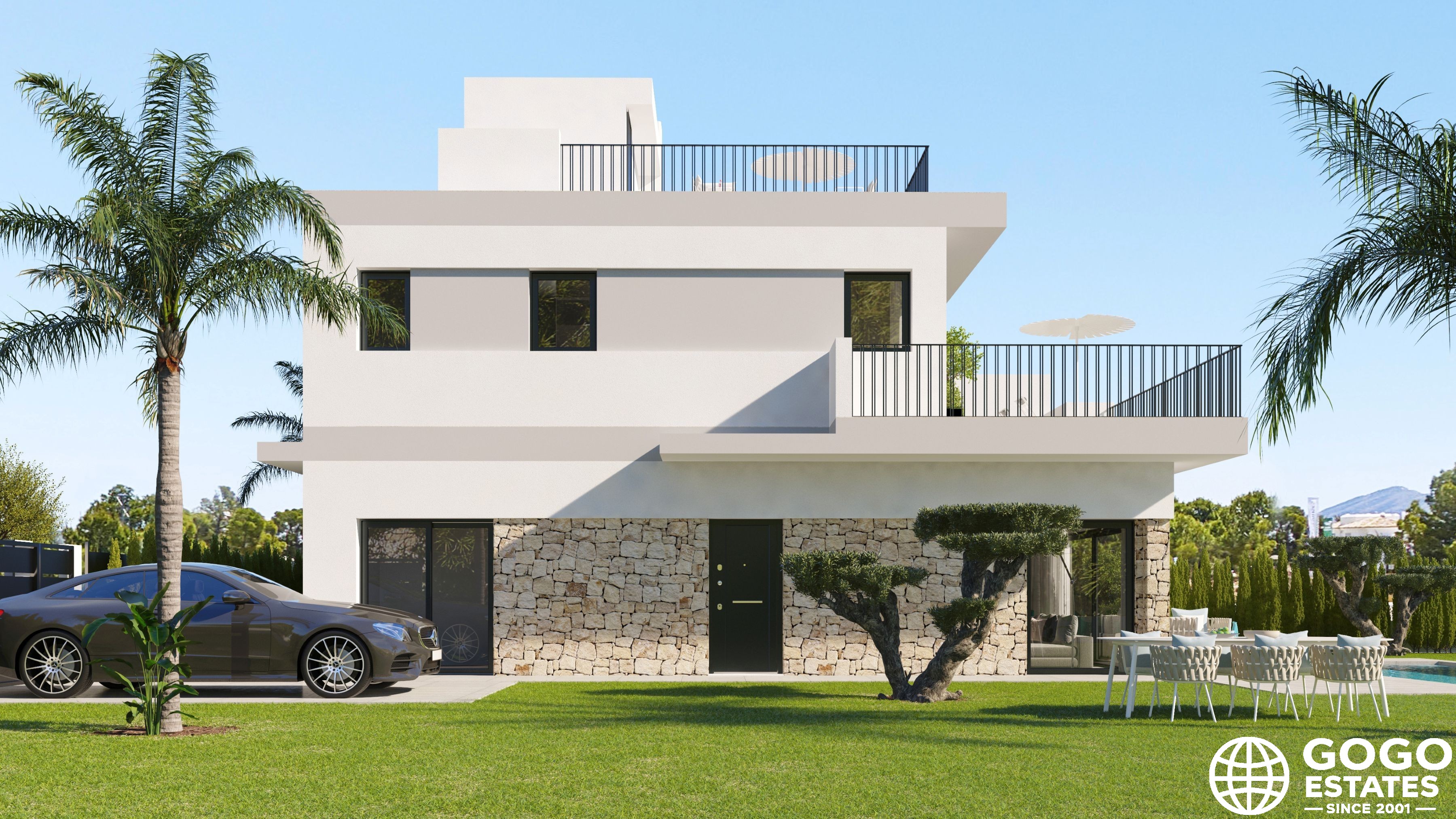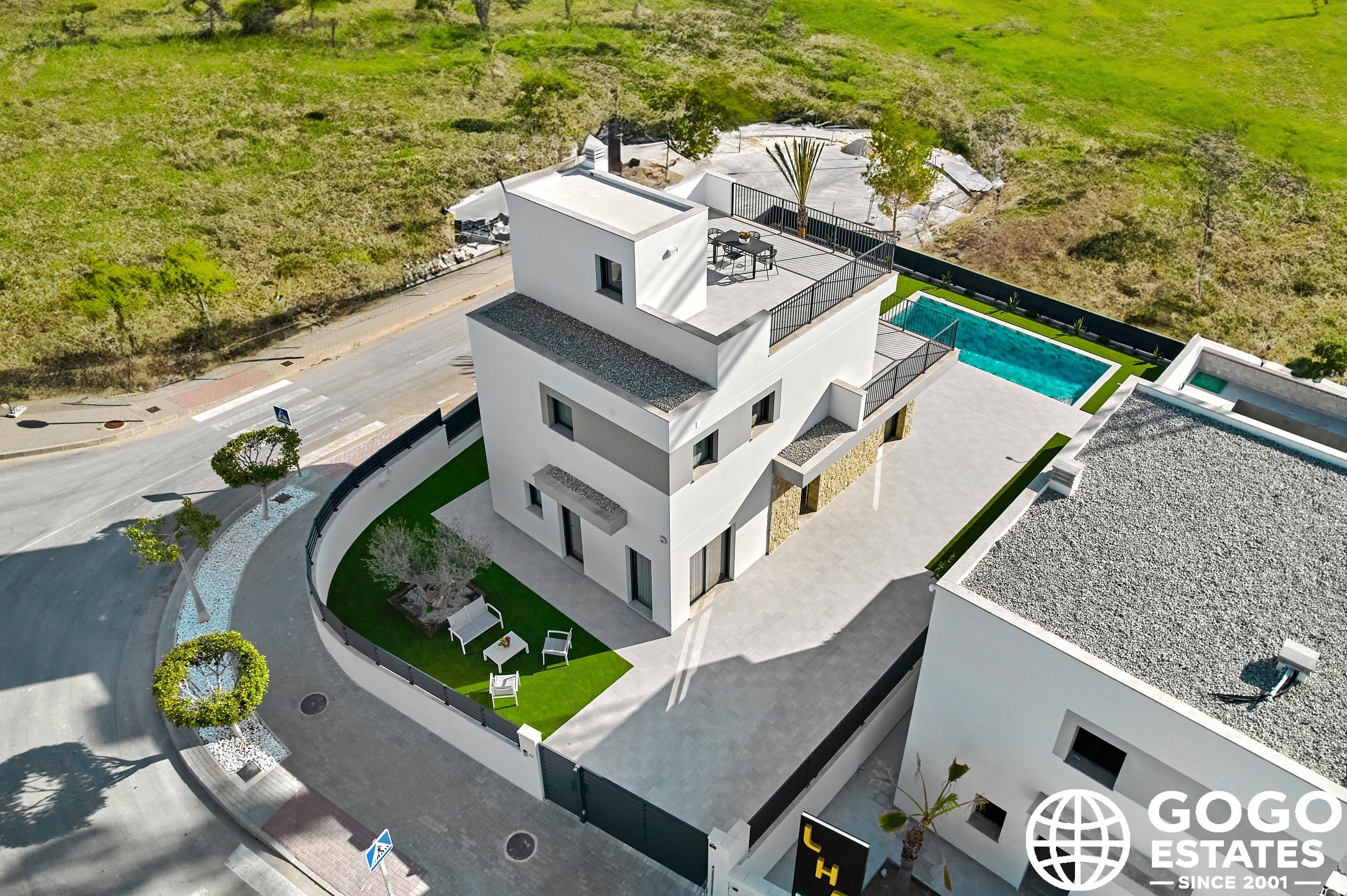 La villa incluye una terraza, perfecta para disfrutar del clima mediterráneo, y hay una opción para un solárium para espacio exterior adicional. Los interiores están diseñados para la comodidad y funcionalidad, equipados con aire acondicionado, persianas eléctricas y armarios empotrados.
