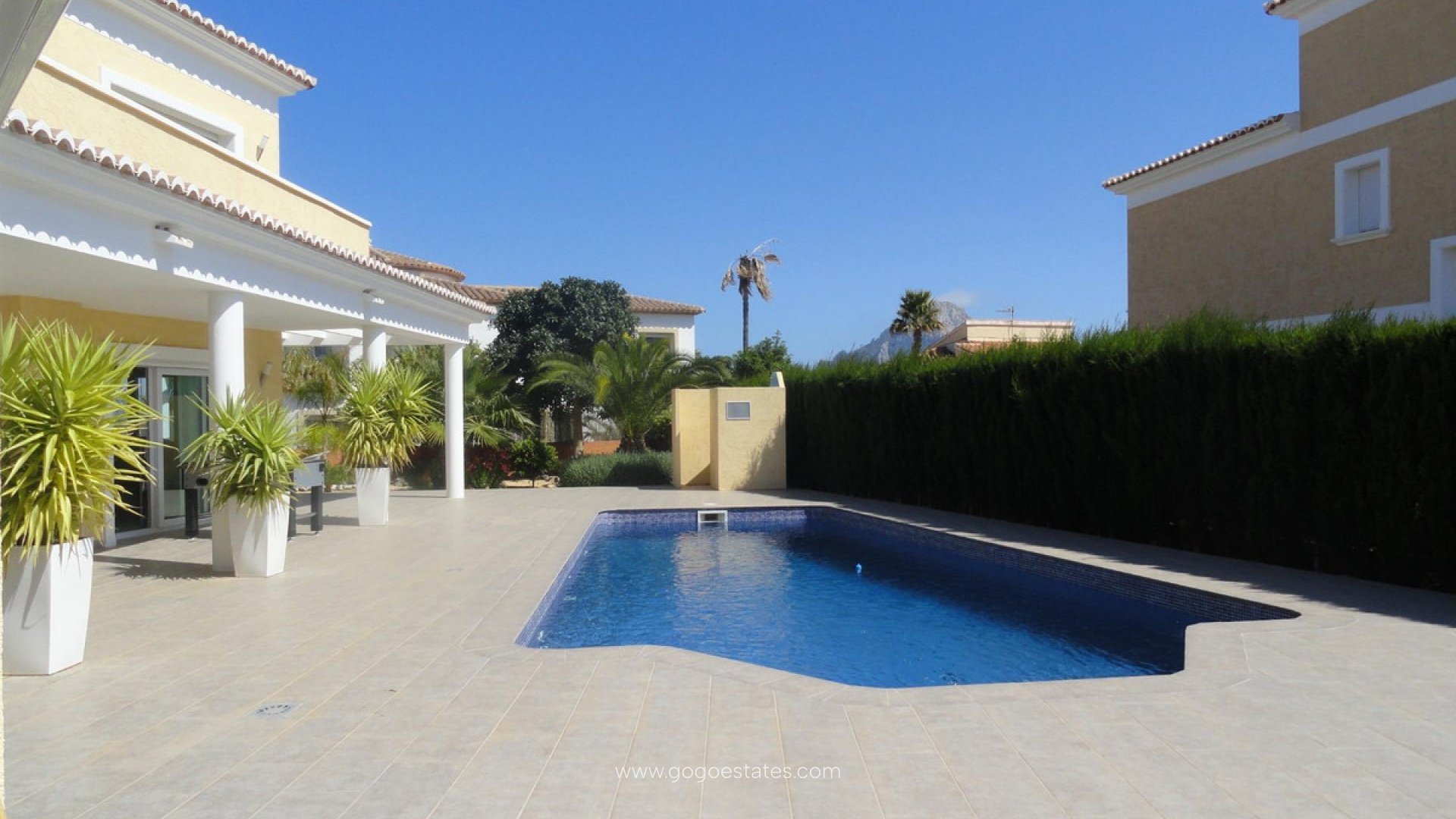 La villa se compose de 2 étages. Le rez-de-chaussée comprend un spacieux salon / salle à manger avec cuisine ouverte équipée, une chambre avec dressing et une salle de bain en suite. De cet étage, vous avez accès à la grande terrasse couverte avec cuisine extérieure avec espace barbecue, terrasse ouverte et piscine avec douche extérieure. A l'étage supérieur se trouvent 2 chambres avec salles de bains privatives, dressing et accès à une terrasse avec vue sur la montagne. De plus, la villa dispose d'un magnifique jardin paysager, d'un garage et d'une place de parking. L'emplacement de la maison est idéal pour ceux qui veulent être proches de tout (le centre historique de Calpe, les magasins, les restaurants, les supermarchés et les plages de Calpe).