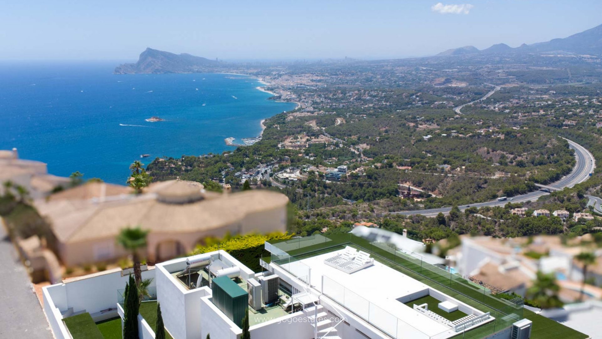 Cette belle villa moderne est située dans l'urbanisation ALtea Hills à Altea. Il s'agit d'une urbanisation entièrement clôturée et sécurisée 24/7 avec une surveillance pour assurer votre sécurité. Ce n'est pas nécessaire ici, mais c'est un sentiment de sécurité. La villa a été construite en 2009 et entièrement rénovée et modernisée en 2024. La villa se compose de 3 étages plus une terrasse sur le toit où vous pouvez profiter de l'environnement fantastique et des couchers de soleil spectaculaires. Elle dispose d'un double garage au sous-sol, de 2 grandes chambres, d'une salle de bain, d'une salle de stockage et d'un local technique. Il y a également un portail automatique au rez-de-chaussée avec un parking pour environ 3 voitures. La porte d'entrée mène à un hall d'entrée avec des toilettes pour invités et une troisième chambre avec salle de bains attenante. Le couloir mène à l'immense salle de séjour avec une vue imprenable sur la mer et les montagnes. À droite se trouve un salon spacieux avec cheminée à gaz, à gauche la grande cuisine ouverte et la salle à manger, juste devant vous la terrasse spacieuse avec piscine à débordement et jacuzzi séparé, une cuisine extérieure complète en acier inoxydable avec barbecue, avec une salle de stockage adjacente. Le magnifique escalier ouvert mène à l'étage supérieur avec une salle de sport, là encore avec une vue imprenable, la chambre principale avec dressing et salle de bains, il est agréable de se réveiller ainsi avec une vue à couper le souffle ! À l'arrière du lit, vous trouverez un confortable poêle à gaz transparent. Plus loin dans le couloir se trouvent deux autres chambres spacieuses, toutes deux avec salle de bains, terrasse et vue. Le couloir permet d'accéder à la terrasse sur le toit, qui offre des vues encore plus magnifiques. Il y a également un ascenseur en verre pour votre confort. Cette villa est prête à être emménagée, prête à commencer à profiter de cette belle région !