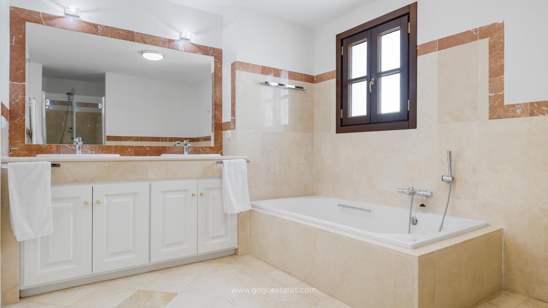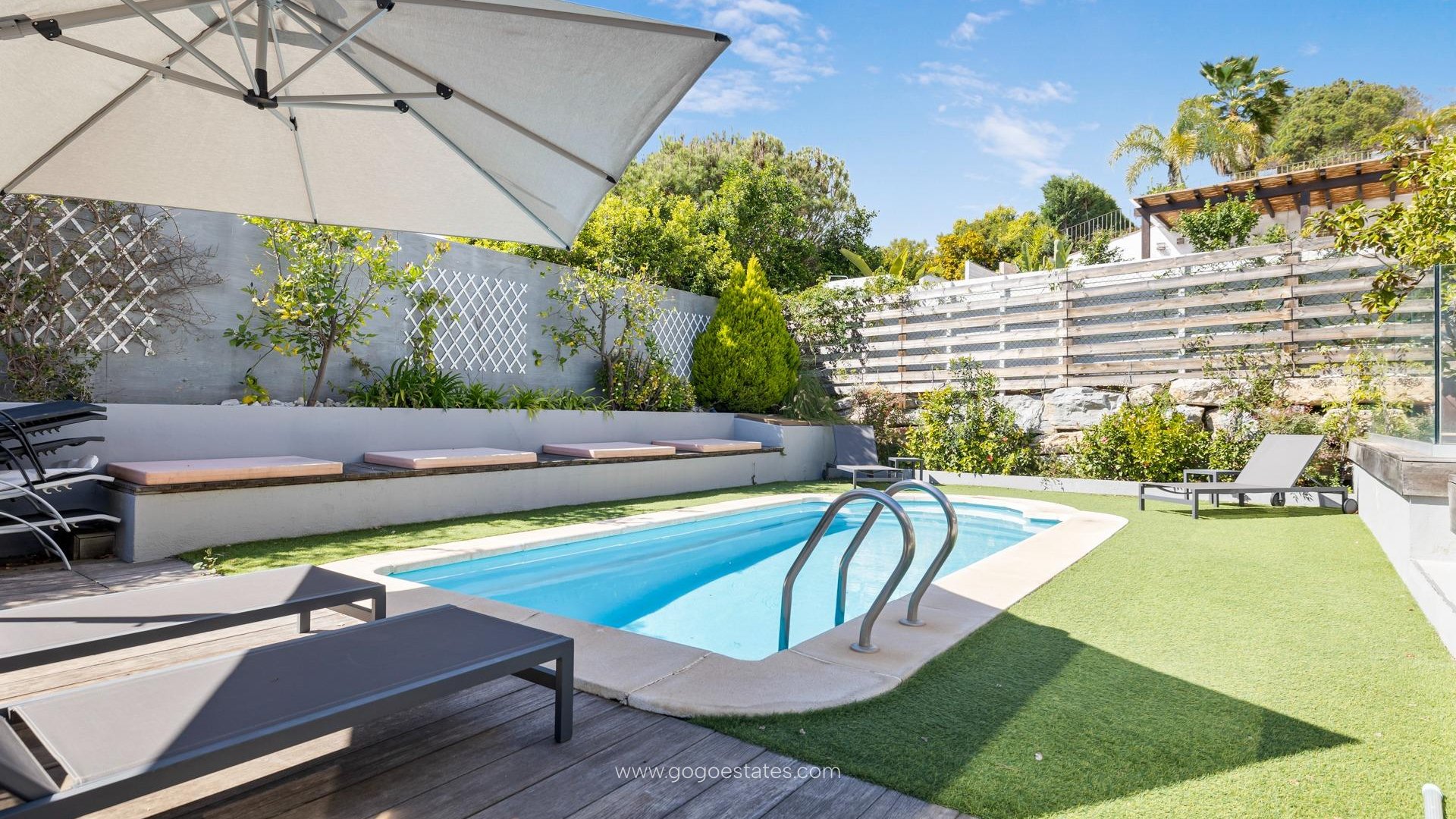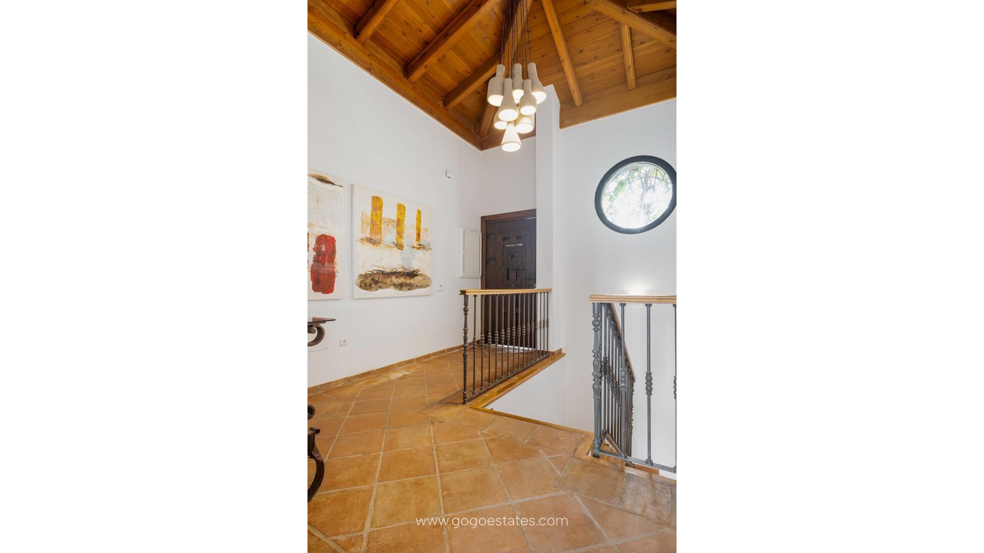 Située dans le quartier recherché de La Perla de la Heredia, sur la route de Ronda, près de Marbella, cette exceptionnelle maison de ville de cinq chambres allie confort, style et commodités. Orientée sud-ouest, elle bénéficie d'un ensoleillement optimal tout au long de la journée. Récemment partiellement rénovée, elle offre une atmosphère moderne et chaleureuse dans un emplacement privilégié, à proximité de toutes les commodités, des golfs et du centre-ville de San Pedro, la plage étant à seulement 10-15 minutes en voiture.~~Avec une surface habitable généreuse de 312 m², plus terrasses et piscine privée, la maison est bien répartie sur trois niveaux :~• Étage supérieur : L'entrée comprend un hall d'entrée accueillant, un garage simple et une chambre principale séparée avec salle de bains et dressing. Une chambre d'amis avec salle de bains privative est également disponible.~~• Étage principal : Un escalier mène au spacieux salon-salle à manger, agrémenté d'une cheminée. La cuisine ouverte est entièrement équipée d'appareils électroménagers Bosch et Liebherr de haute qualité, ainsi que d'une cuisinière à gaz. Ce niveau comprend également des toilettes invités. Depuis le séjour, on accède directement à une terrasse couverte et ouverte, qui se prolonge par un confortable salon et un espace barbecue, ainsi que par le jardin et la piscine privée.~• Étage inférieur : Ce niveau comprend trois chambres d'amis avec une salle de bain attenante et une salle de bain commune, ainsi qu'une buanderie.~Les équipements supplémentaires comprennent la climatisation et le chauffage, ainsi que le chauffage au sol aux étages supérieurs et principaux.~Le mobilier est négociable.~