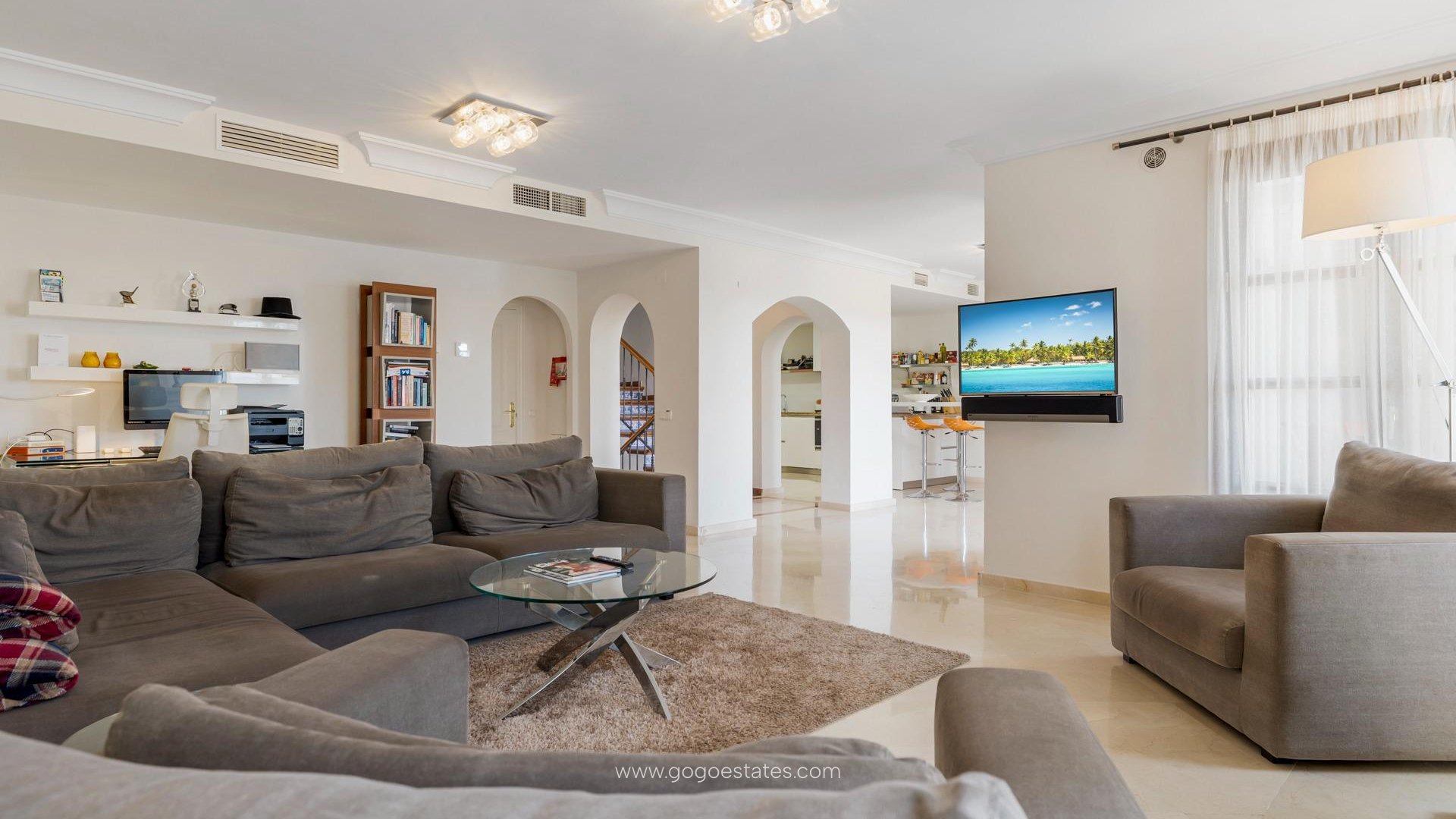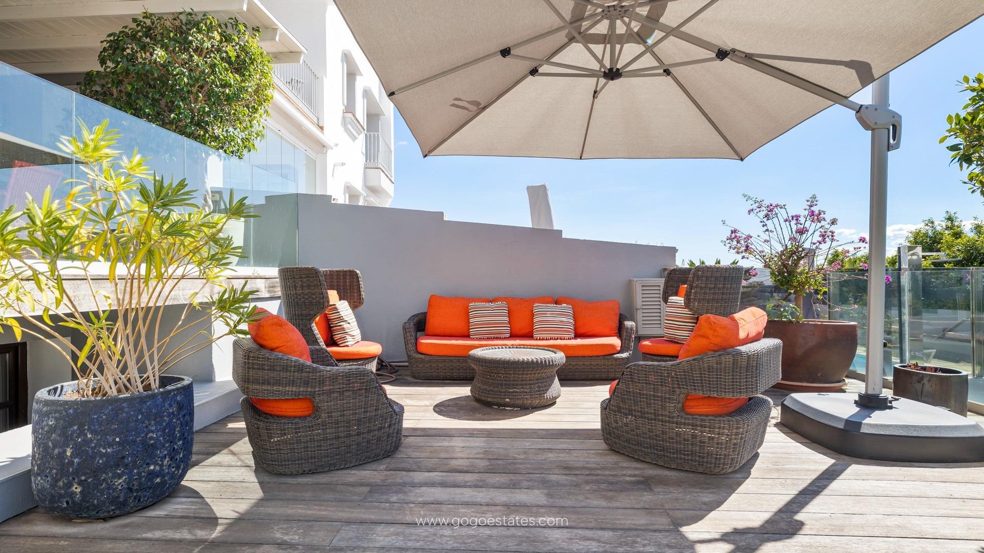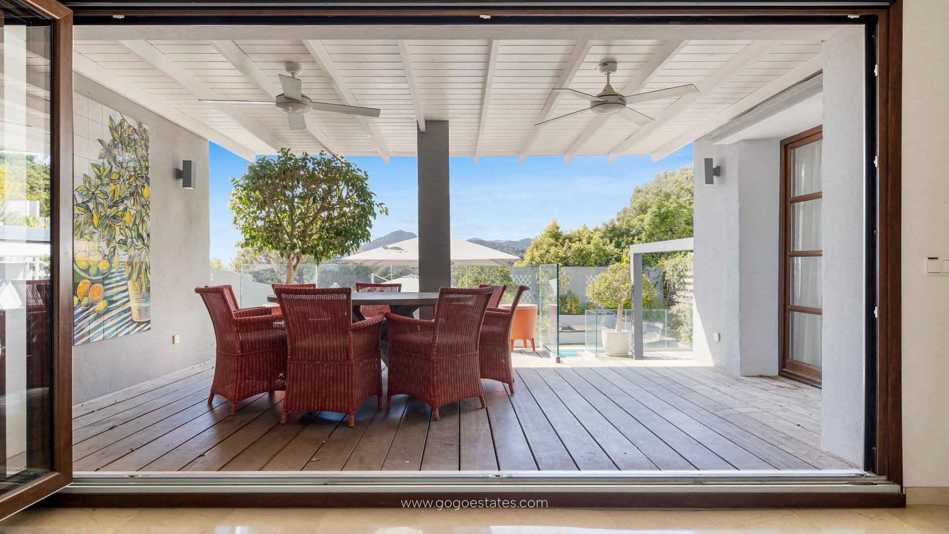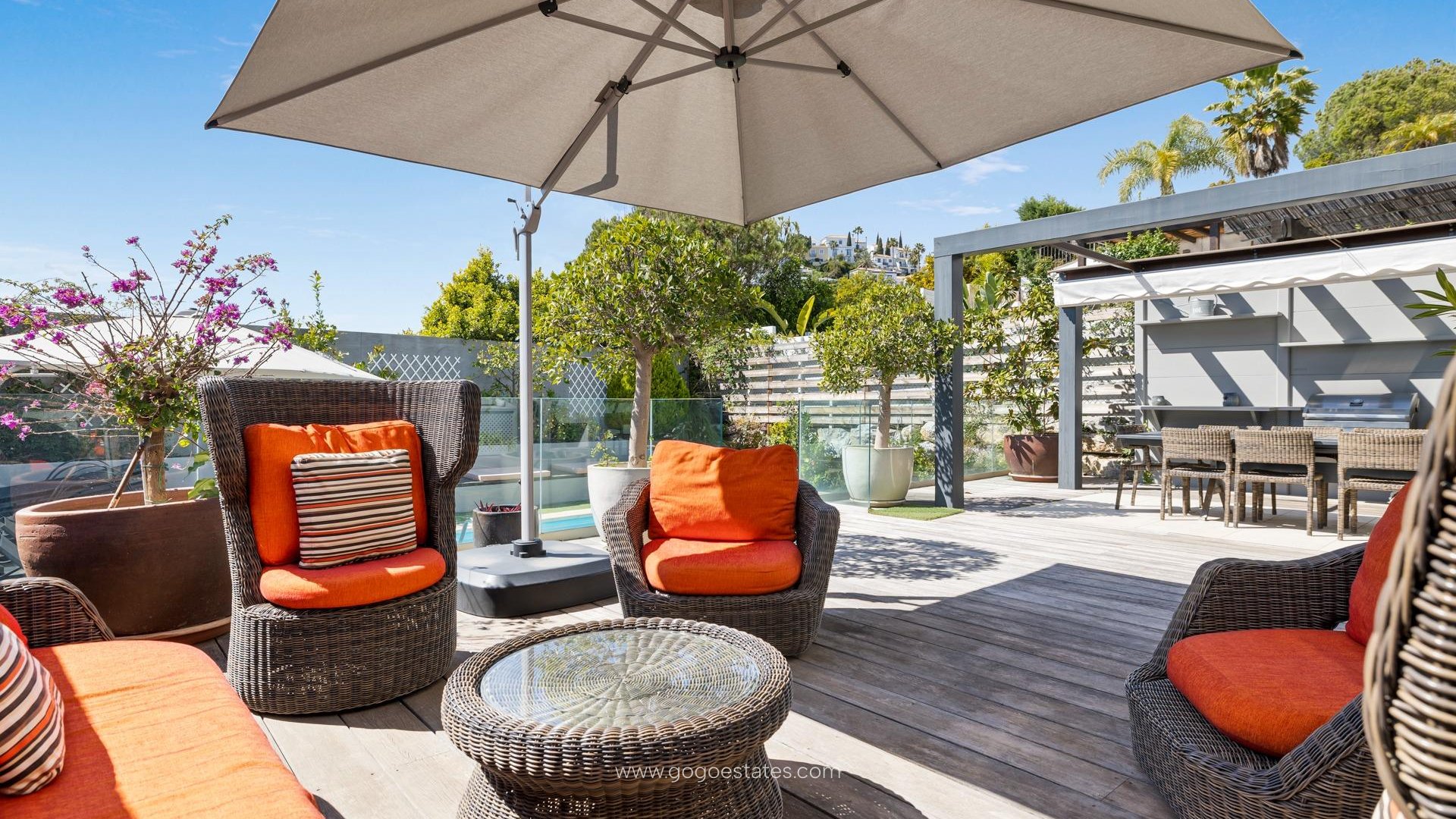 Située dans le quartier recherché de La Perla de la Heredia, sur la route de Ronda, près de Marbella, cette exceptionnelle maison de ville de cinq chambres allie confort, style et commodités. Orientée sud-ouest, elle bénéficie d'un ensoleillement optimal tout au long de la journée. Récemment partiellement rénovée, elle offre une atmosphère moderne et chaleureuse dans un emplacement privilégié, à proximité de toutes les commodités, des golfs et du centre-ville de San Pedro, la plage étant à seulement 10-15 minutes en voiture.~~Avec une surface habitable généreuse de 312 m², plus terrasses et piscine privée, la maison est bien répartie sur trois niveaux :~• Étage supérieur : L'entrée comprend un hall d'entrée accueillant, un garage simple et une chambre principale séparée avec salle de bains et dressing. Une chambre d'amis avec salle de bains privative est également disponible.~~• Étage principal : Un escalier mène au spacieux salon-salle à manger, agrémenté d'une cheminée. La cuisine ouverte est entièrement équipée d'appareils électroménagers Bosch et Liebherr de haute qualité, ainsi que d'une cuisinière à gaz. Ce niveau comprend également des toilettes invités. Depuis le séjour, on accède directement à une terrasse couverte et ouverte, qui se prolonge par un confortable salon et un espace barbecue, ainsi que par le jardin et la piscine privée.~• Étage inférieur : Ce niveau comprend trois chambres d'amis avec une salle de bain attenante et une salle de bain commune, ainsi qu'une buanderie.~Les équipements supplémentaires comprennent la climatisation et le chauffage, ainsi que le chauffage au sol aux étages supérieurs et principaux.~Le mobilier est négociable.~