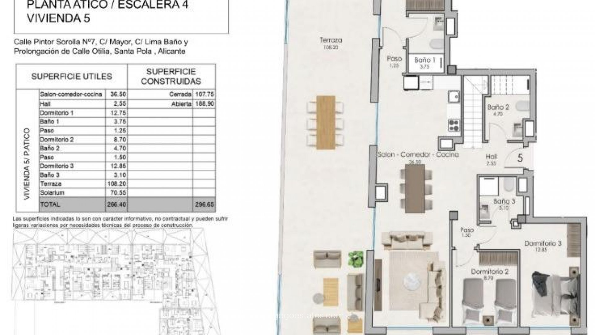 NOUVEAU COMPLEXE RÉSIDENTIEL A SANTA POLA Nouveau complexe résidentiel moderne fermé comprenant des appartements et des penthouses de 1, 2 et 3 chambres à coucher avec 2 salles de bains complètes. Le complexe se compose de 4 escaliers d'appartements avec de vastes espaces communs paysagers, y compris une piscine, un espace de détente et un gymnase. Toutes les propriétés ont été soigneusement conçues pour vous offrir une expérience de vie exceptionnelle, avec des finitions de haute qualité et un style moderne. Profitez des vastes terrasses, où vous pourrez vous détendre, manger en plein air et admirer les couchers de soleil les plus spectaculaires. L'emplacement est tout simplement imbattable : à côté du centre de Santa Pola et de la palmeraie, et à seulement quelques minutes de la promenade, vous serez à proximité d'un large éventail de restaurants, de bars et de supermarchés. Excellente connexion avec la route nationale 332, qui relie tout le sud de la Costa Blanca, et avec l'aéroport en seulement 15 minutes.