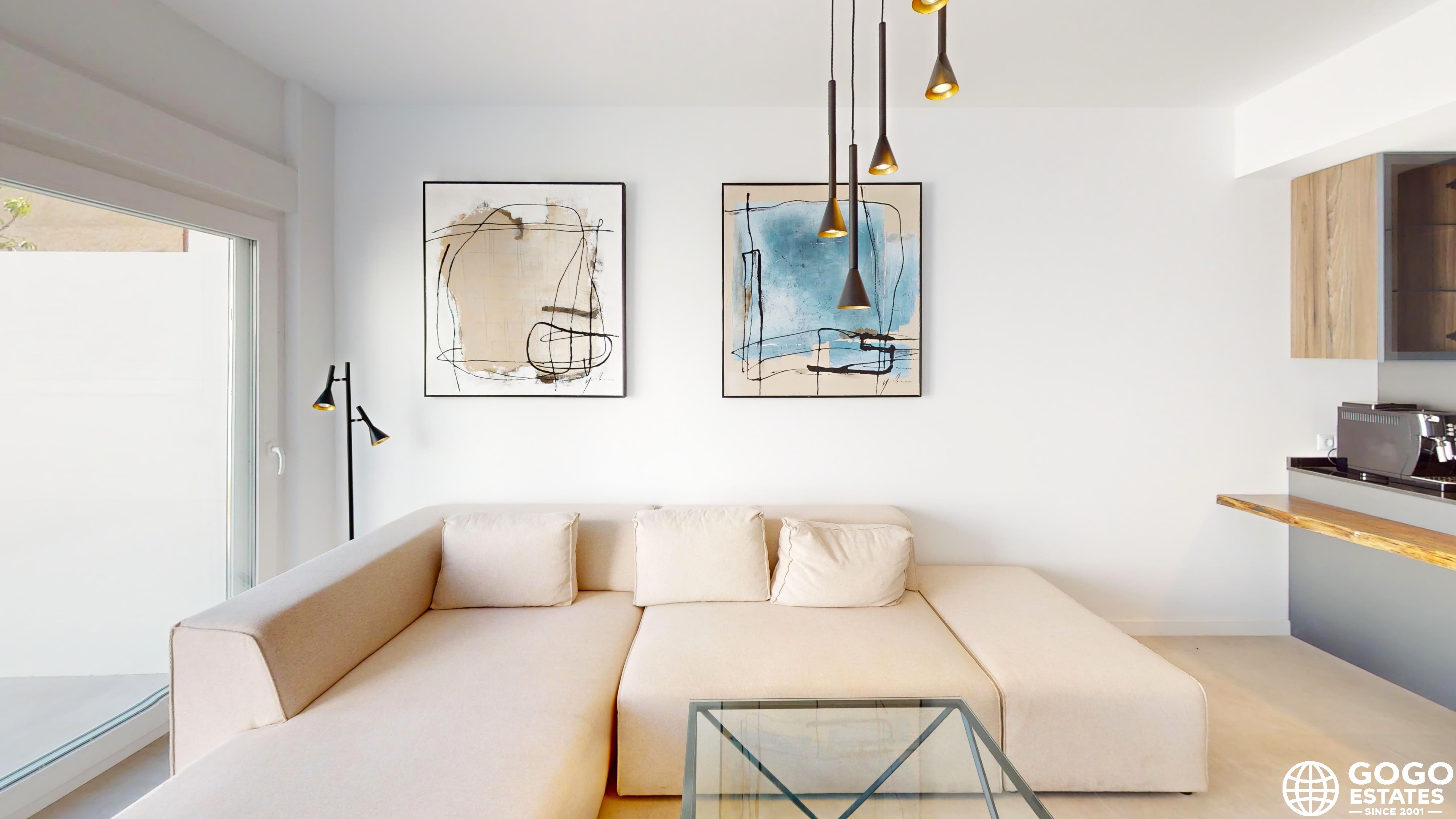 À l'intérieur, l'appartement est soigneusement conçu avec des placards intégrés et des meubles inclus, garantissant une expérience d'emménagement sans faille. L'agencement optimise l'espace et la lumière naturelle, créant une atmosphère accueillante.