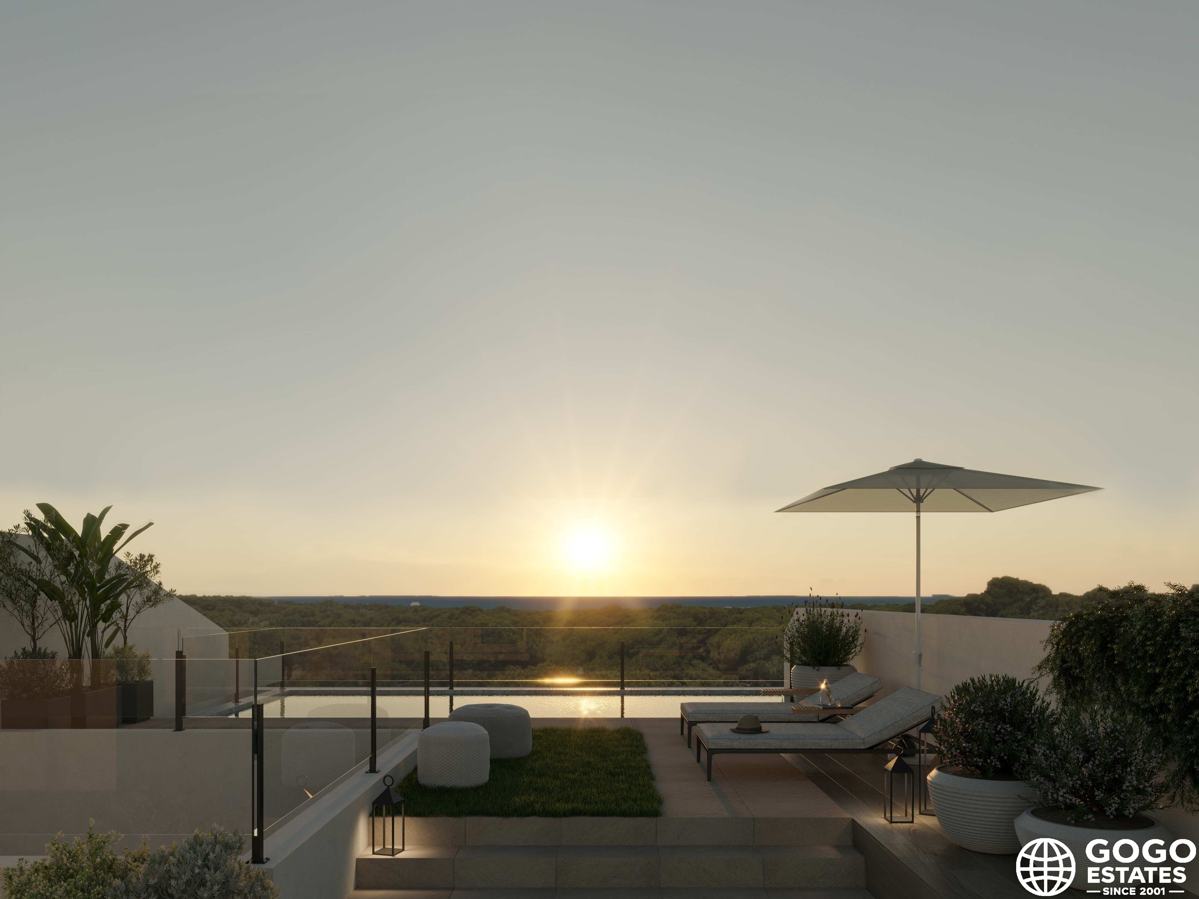 Les extérieurs de ces maisons sont conçus pour maximiser le plaisir du climat méditerranéen. Toutes les propriétés disposent de terrasses, parfaites pour se détendre tout en admirant la mer. De plus, le complexe résidentiel offre un solarium commun, idéal pour bronzer et profiter de vues panoramiques.