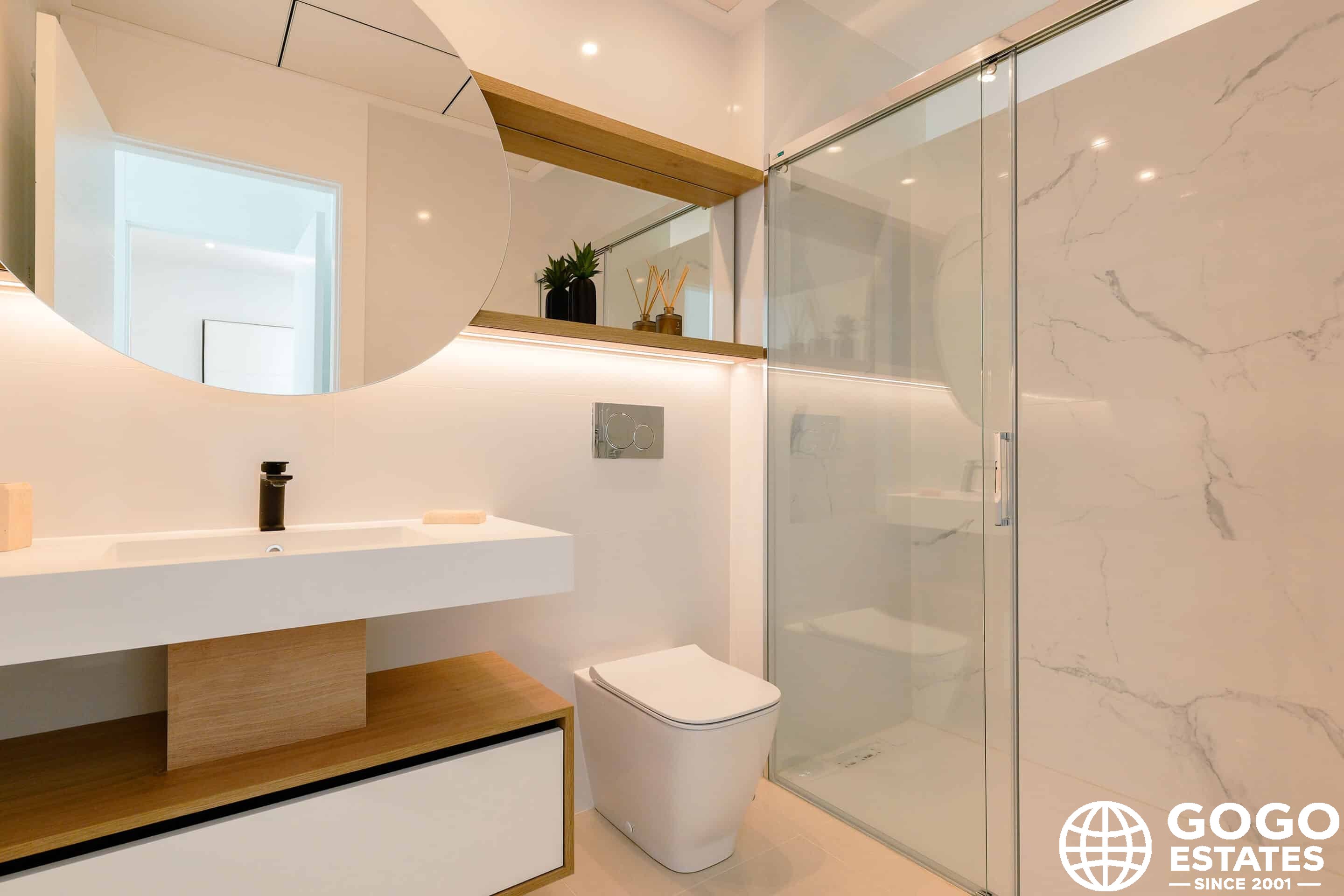 À l'intérieur, les bungalows disposent de sols en grès cérame, de volets électriques et d'appareils intégrés. Des placards encastrés et un jacuzzi rehaussent le confort et le luxe.