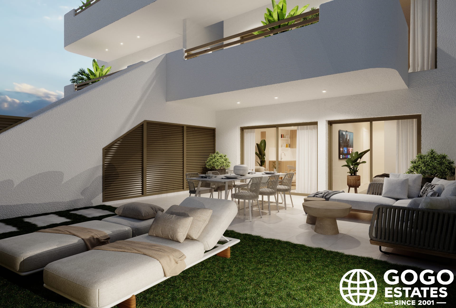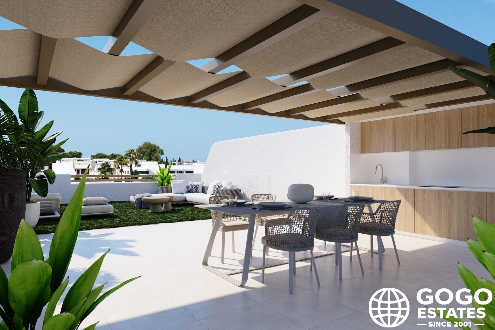Les extérieurs de ces bungalows sont conçus pour maximiser le plaisir du climat méditerranéen. Chaque propriété dispose d'un jardin privé, idéal pour la détente en plein air ou les activités familiales. De plus, les terrasses offrent un espace supplémentaire pour les loisirs, permettant de dîner en plein air ou simplement de se détendre avec un bon livre. Le solarium offre un espace exclusif pour bronzer en toute intimité.