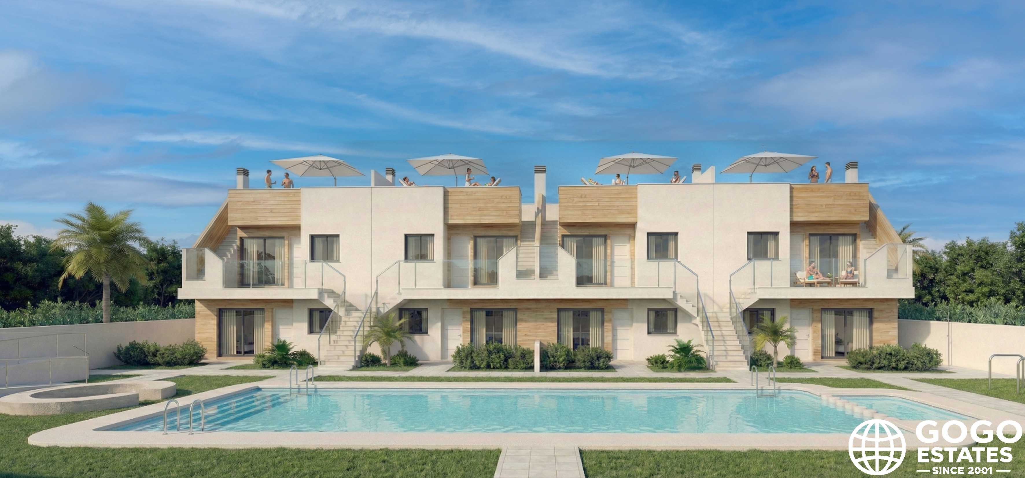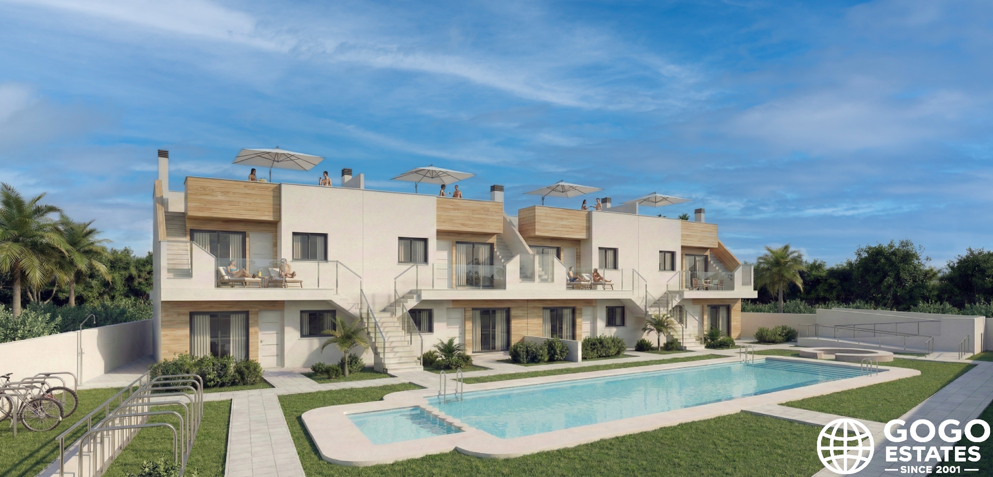 Les extérieurs de ces bungalows à San Javier sont conçus pour profiter du climat méditerranéen toute l'année. Chaque propriété dispose d'un jardin privé et d'un solarium, parfaits pour se détendre et pratiquer des activités de plein air. Les terrasses offrent un espace supplémentaire pour se détendre ou dîner en plein air.