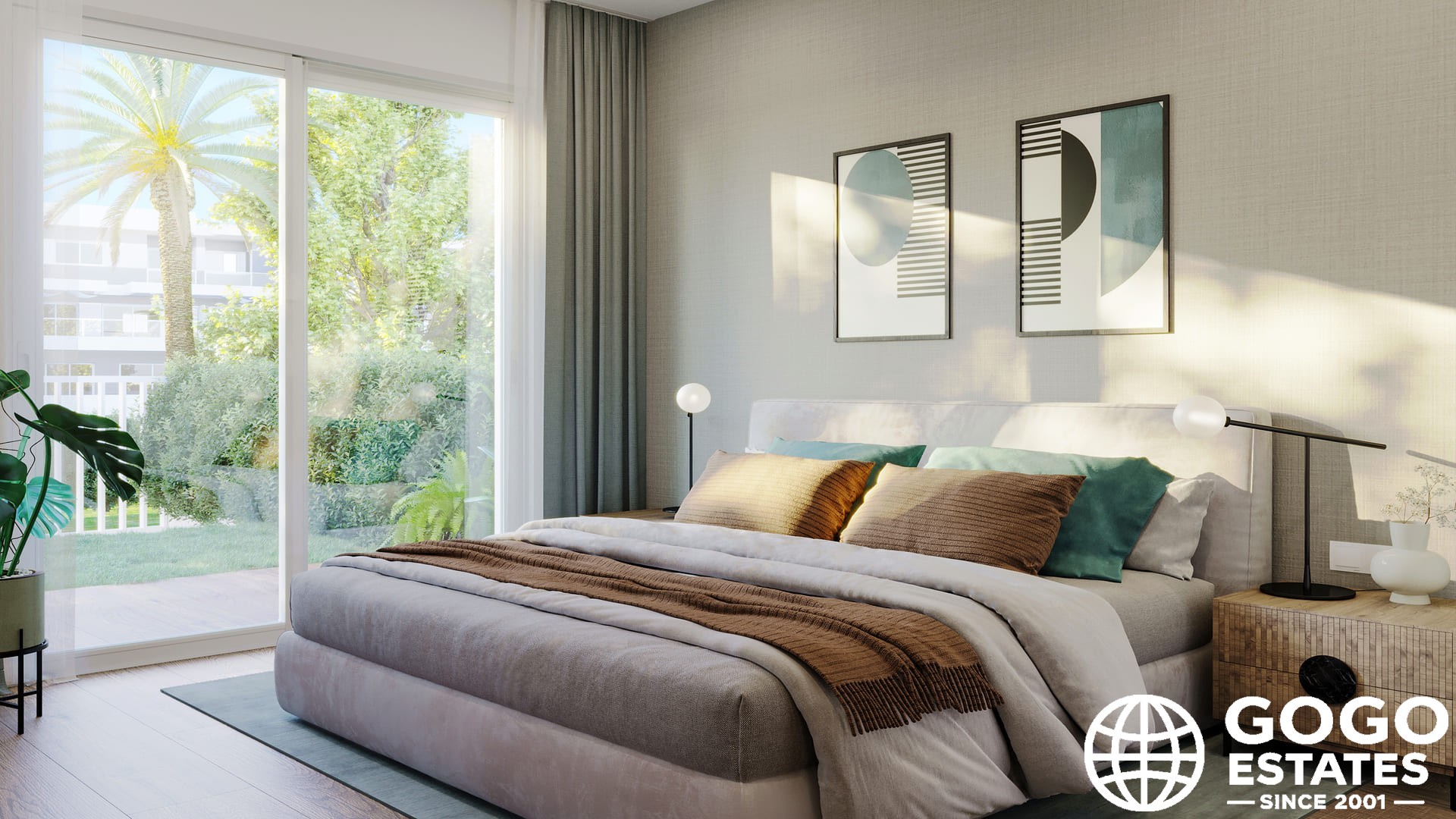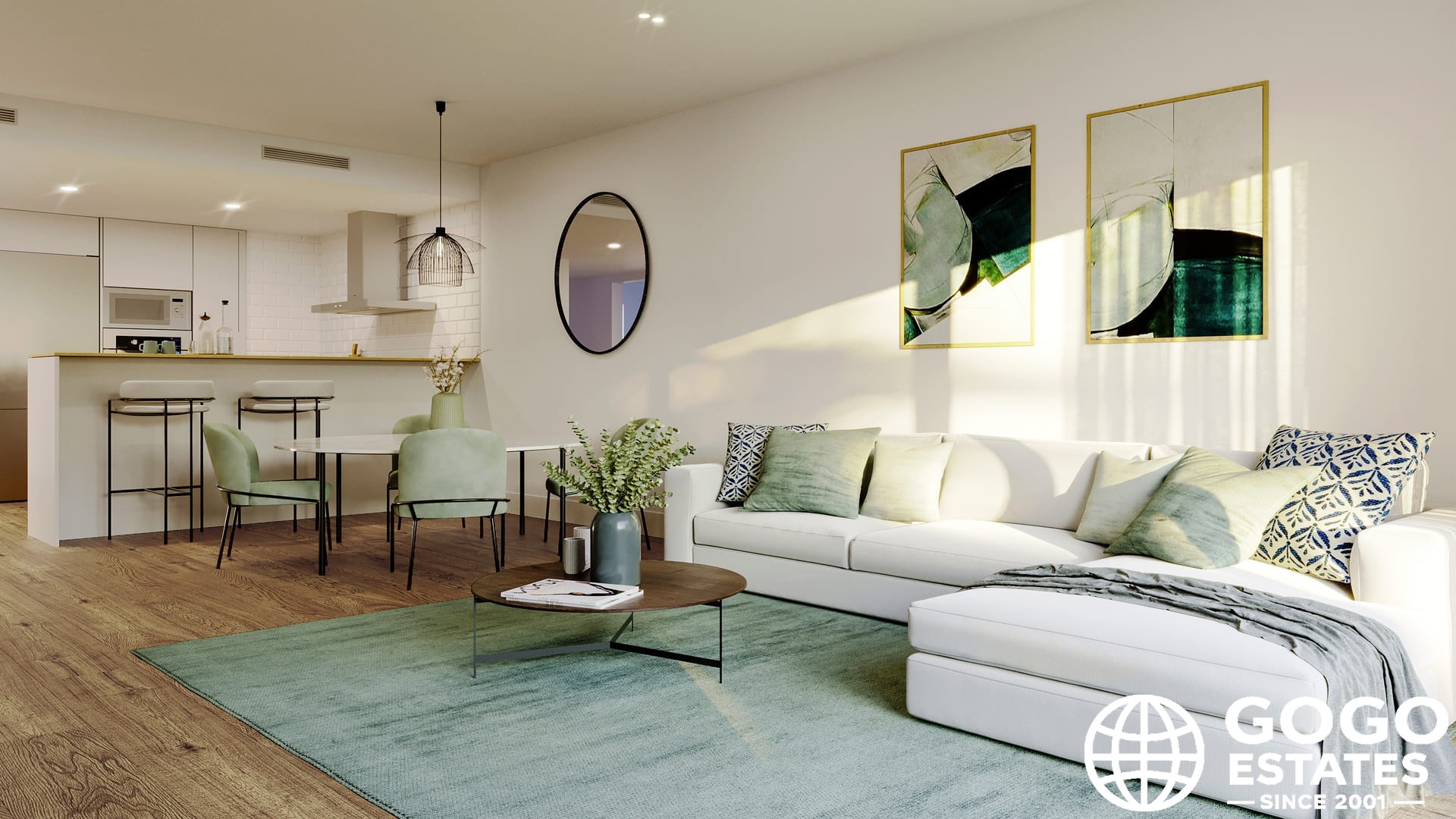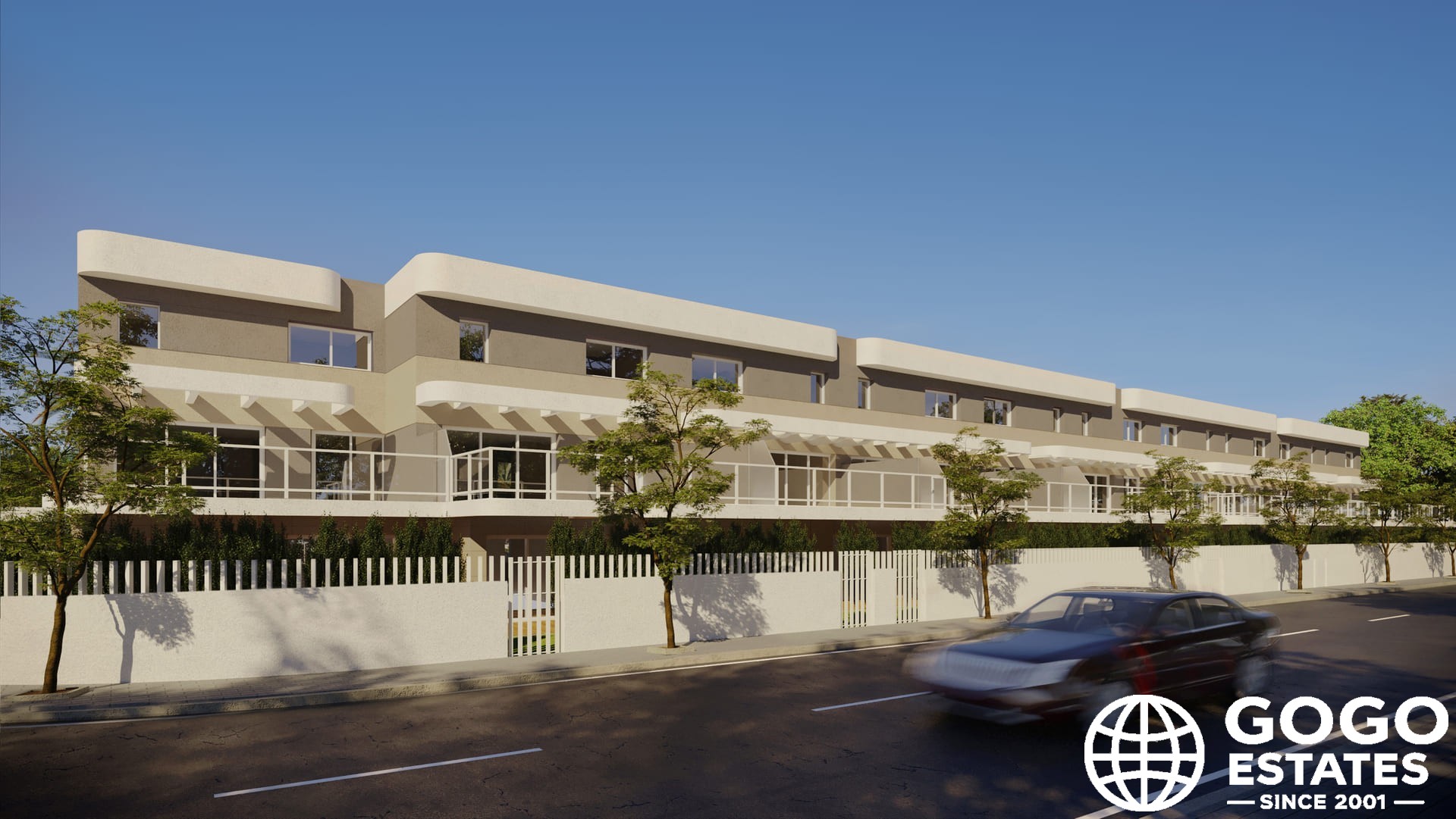 Les intérieurs sont modernes avec des sols flottants et des placards intégrés. La propriété comprend un garage privé, garantissant commodité et sécurité.