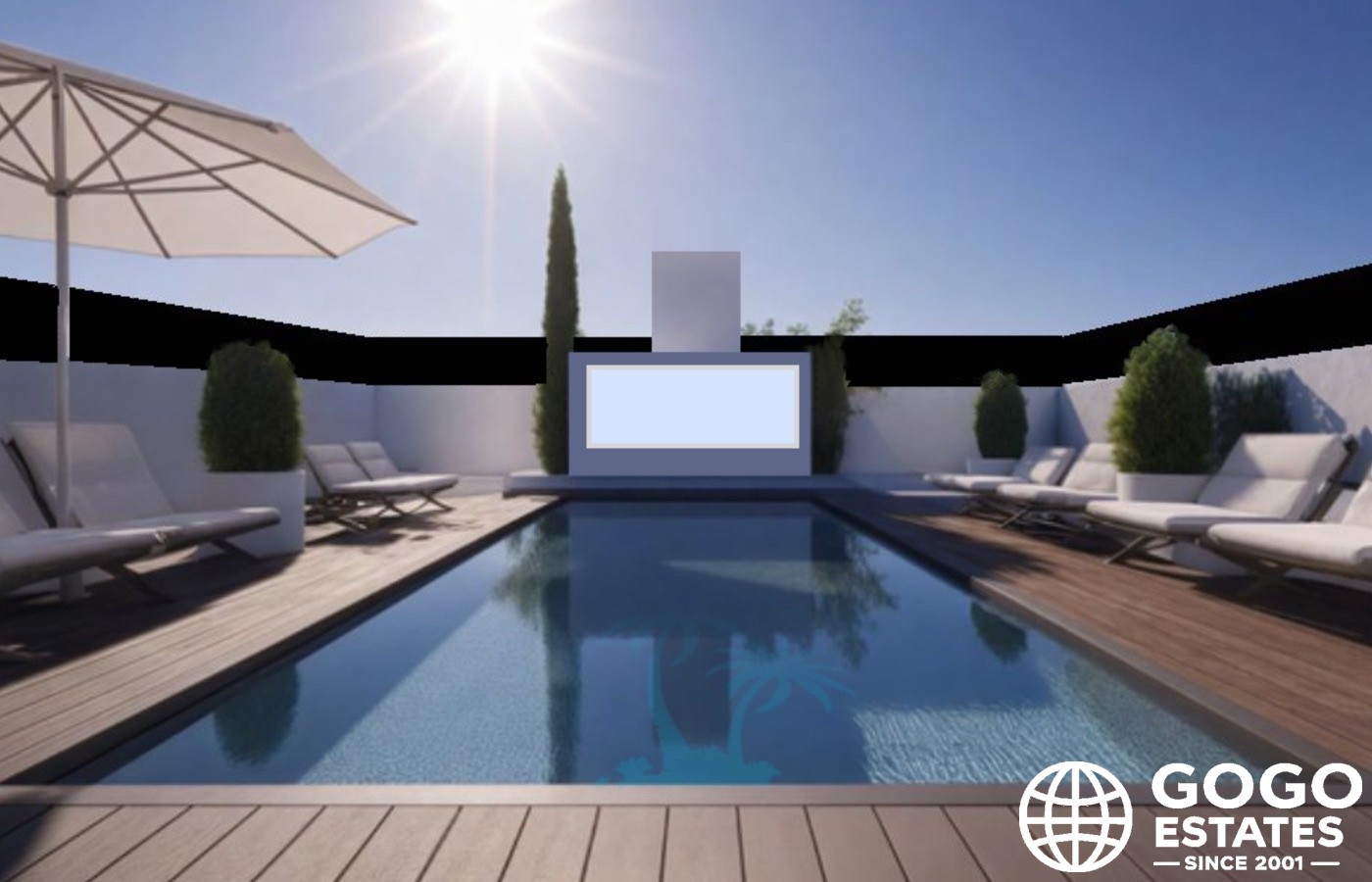 Les extérieurs comprennent des jardins privés et de spacieuses terrasses, parfaits pour la détente en plein air. Un solarium et des pergolas ajoutent élégance et fonctionnalité. À l'intérieur, des sols en carrelage en porcelaine et des placards intégrés rehaussent le design moderne. La climatisation pré-installée et un interphone vidéo offrent confort et sécurité.