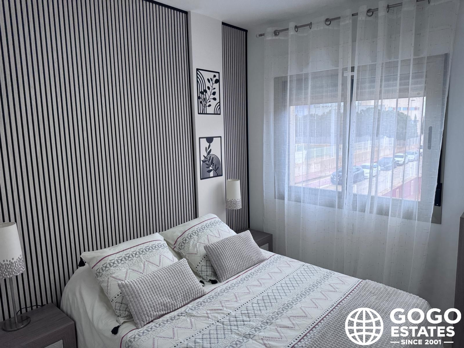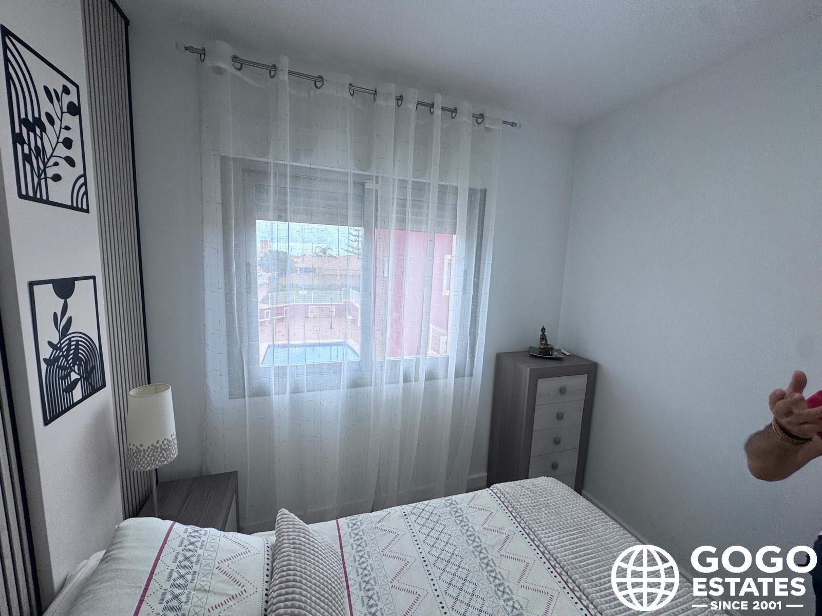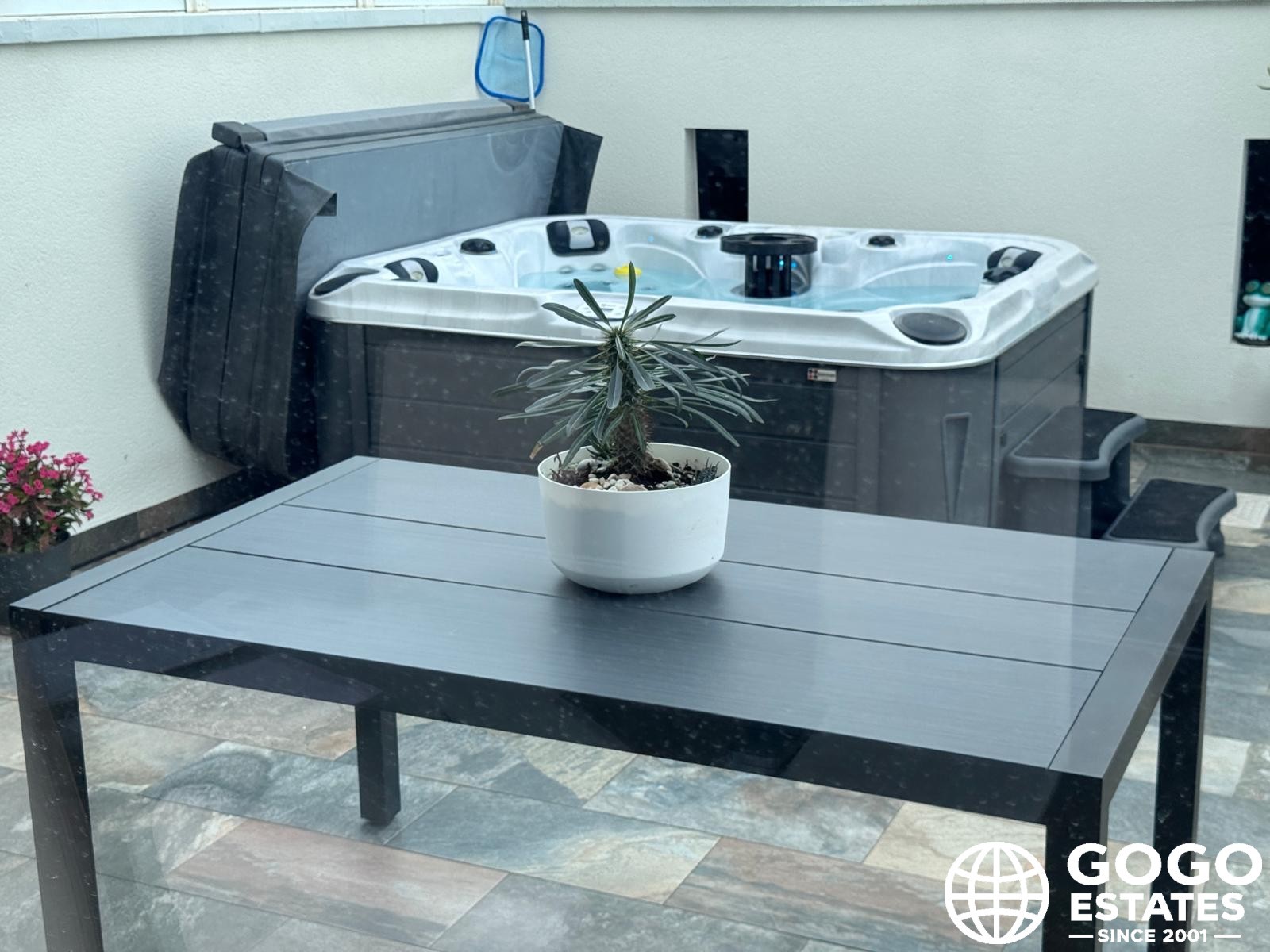 Présentation d'une charmante maison jumelée située à Santiago de la Ribera, Murcia, comprenant trois chambres et deux salles de bains. Cette résidence est baignée de lumière naturelle, grâce à de nombreuses fenêtres qui mettent en valeur la cuisine moderne et spacieuse ainsi que le salon généreux, créant une ambiance accueillante. Les résidents peuvent profiter d'un accès direct à la piscine commune et à une grande terrasse, équipée d'un jacuzzi. De grandes portes coulissantes créent une connexion harmonieuse entre les espaces intérieurs et extérieurs. Cette propriété comprend également une place de parking privée et une cuisine extérieure pour plus de commodité. La chambre principale dispose de son propre balcon avec des escaliers menant à une terrasse sur le toit/solarium, offrant un espace extérieur supplémentaire. En tant que propriété d'angle, elle offre plus d'espace sur la terrasse. Pour votre tranquillité d'esprit, des vitres sécurisées et des volets automatiques ont été installés. La maison est équipée de la climatisation et est proposée semi-meublée. Un poêle à granulés assure chaleur pendant les jours plus frais, tandis que des placards intégrés offrent un espace de rangement suffisant.