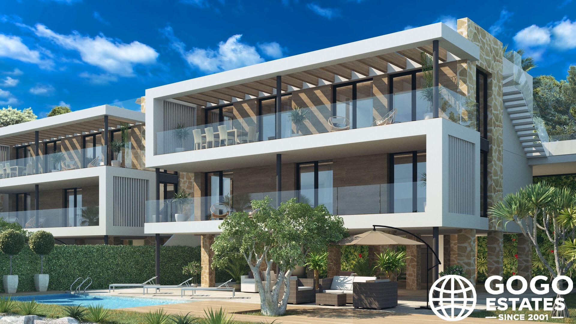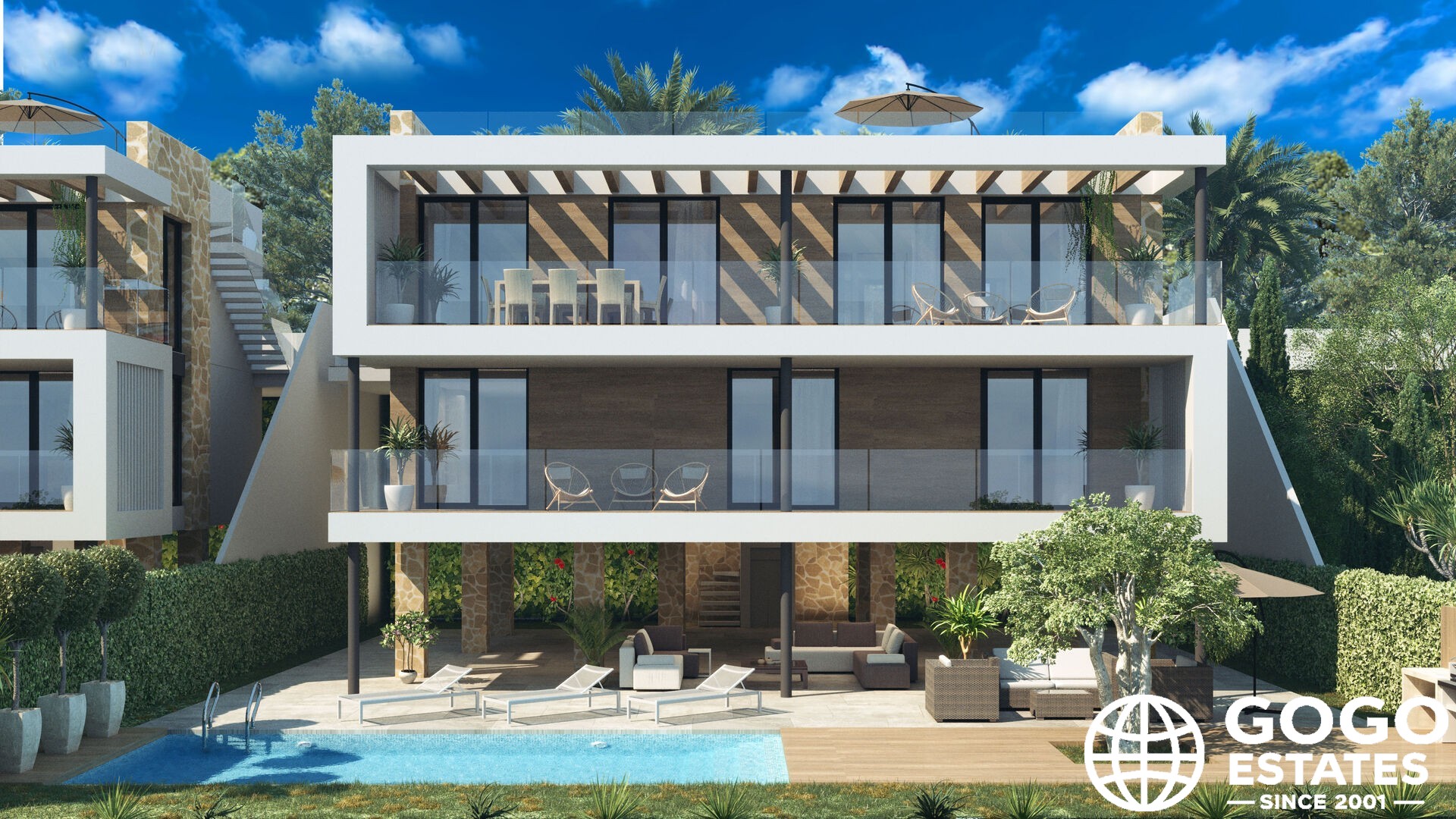 Les espaces extérieurs comprennent un jardin privé et une terrasse idéale pour profiter du climat méditerranéen. Un solarium offre un espace supplémentaire pour bronzer ou profiter de vues panoramiques, tandis que la piscine privée est parfaite pour se rafraîchir pendant les chaudes journées d'été.