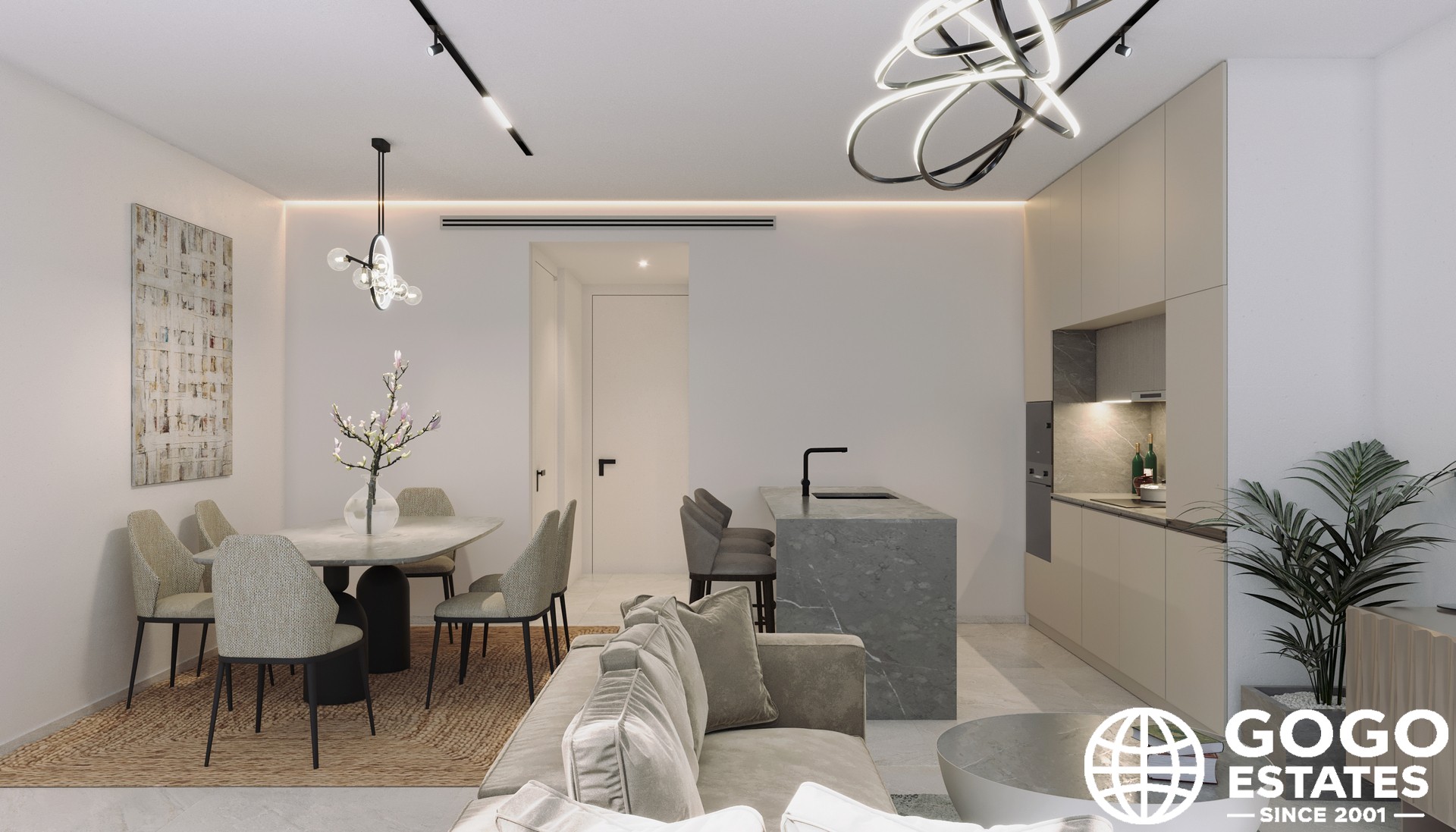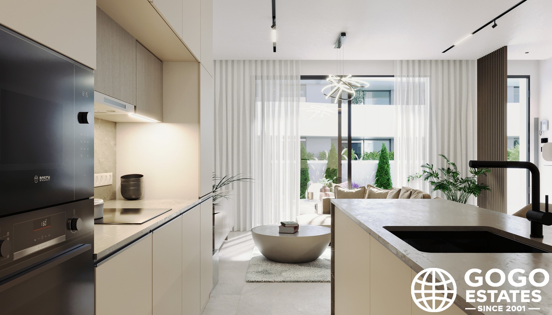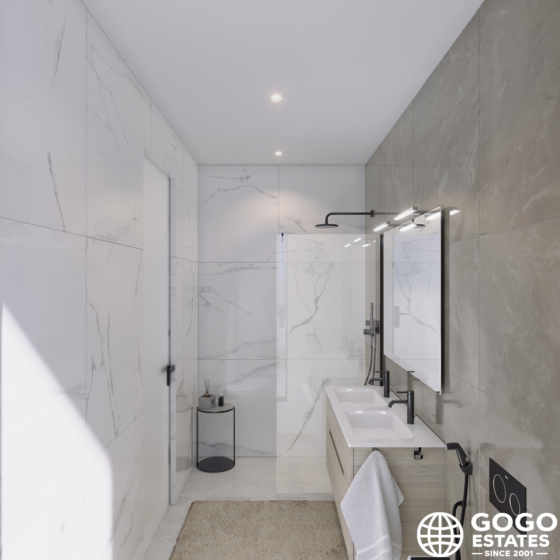 L'intérieur est conçu pour le confort et la fonctionnalité, avec trois chambres et deux salles de bains. Les sols en carrelage en porcelaine ajoutent de l'élégance, tandis que la domotique améliore la sécurité et l'efficacité énergétique. Les placards intégrés offrent des solutions de rangement pratiques.