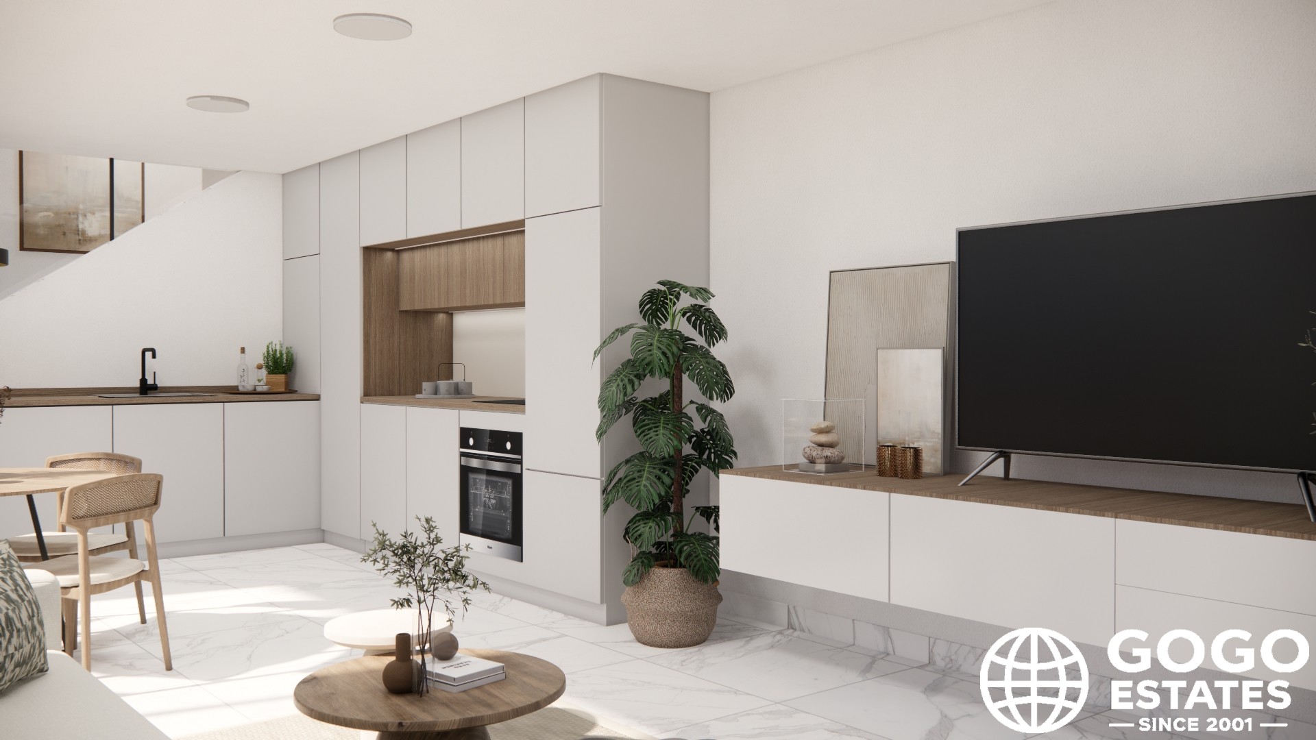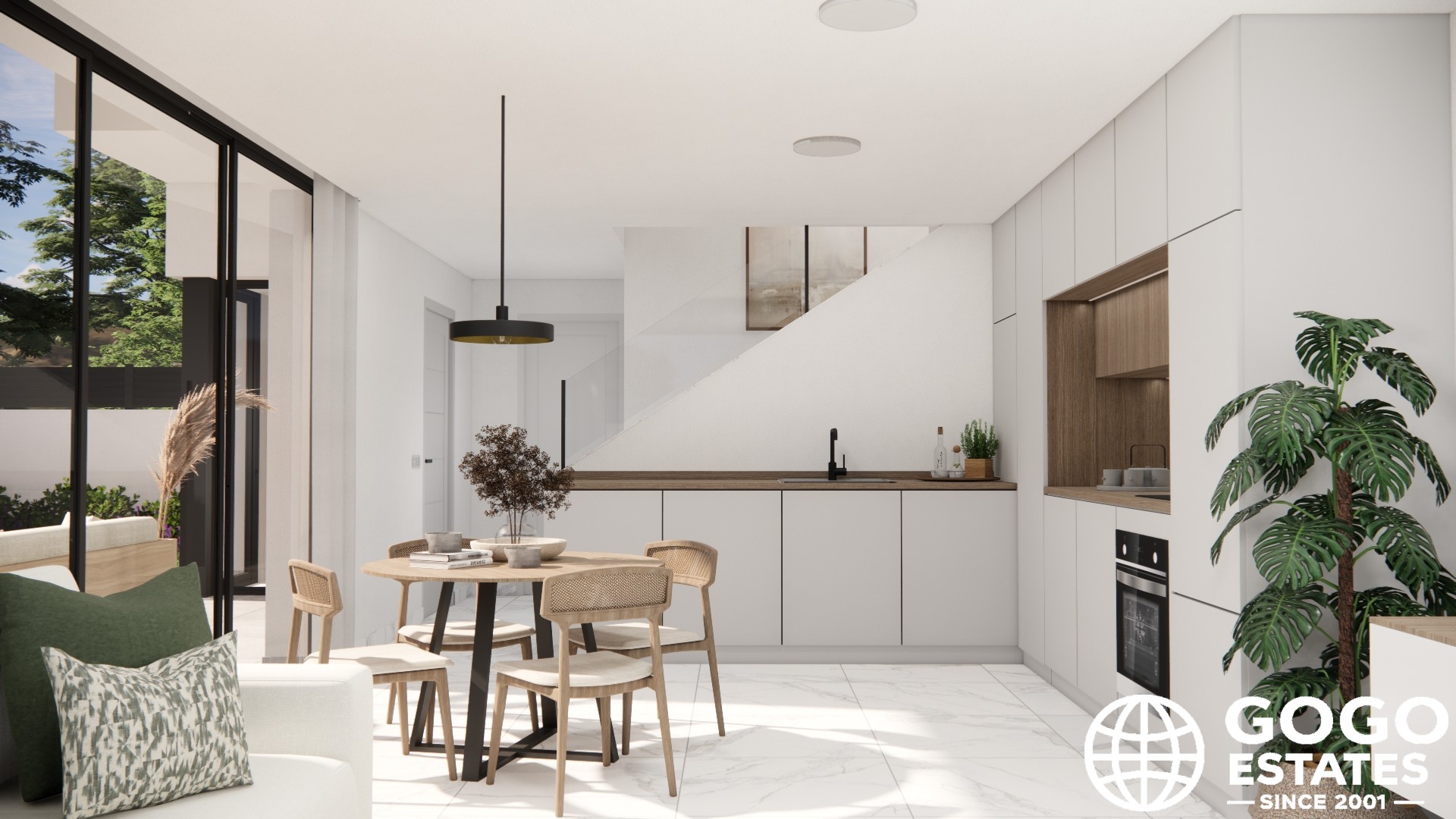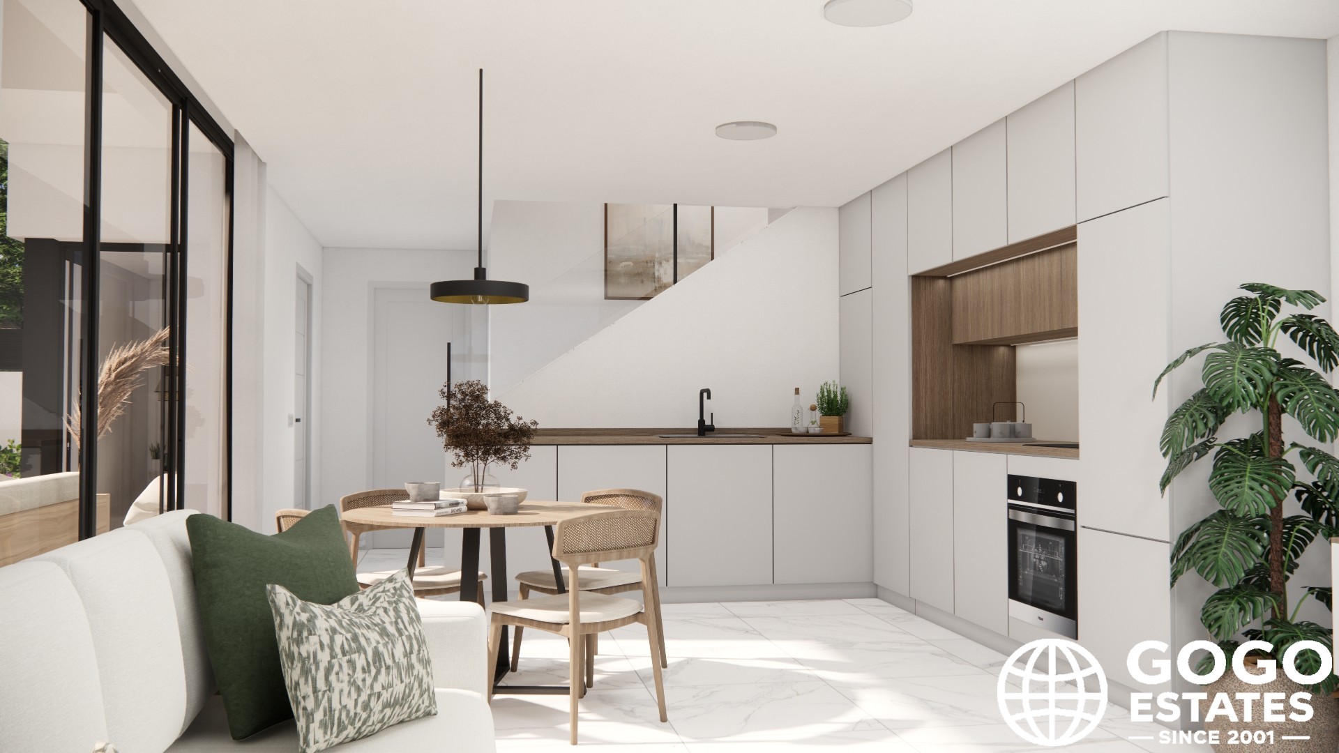 À l'intérieur, les maisons mettent l'accent sur le confort et la modernité avec des sols en céramique, des volets électriques et la climatisation préinstallée. Les cuisines sont entièrement équipées d'appareils modernes, et les placards intégrés offrent un espace de rangement suffisant. Les configurations incluent 3 chambres et l'option de 2 ou 3 salles de bains.