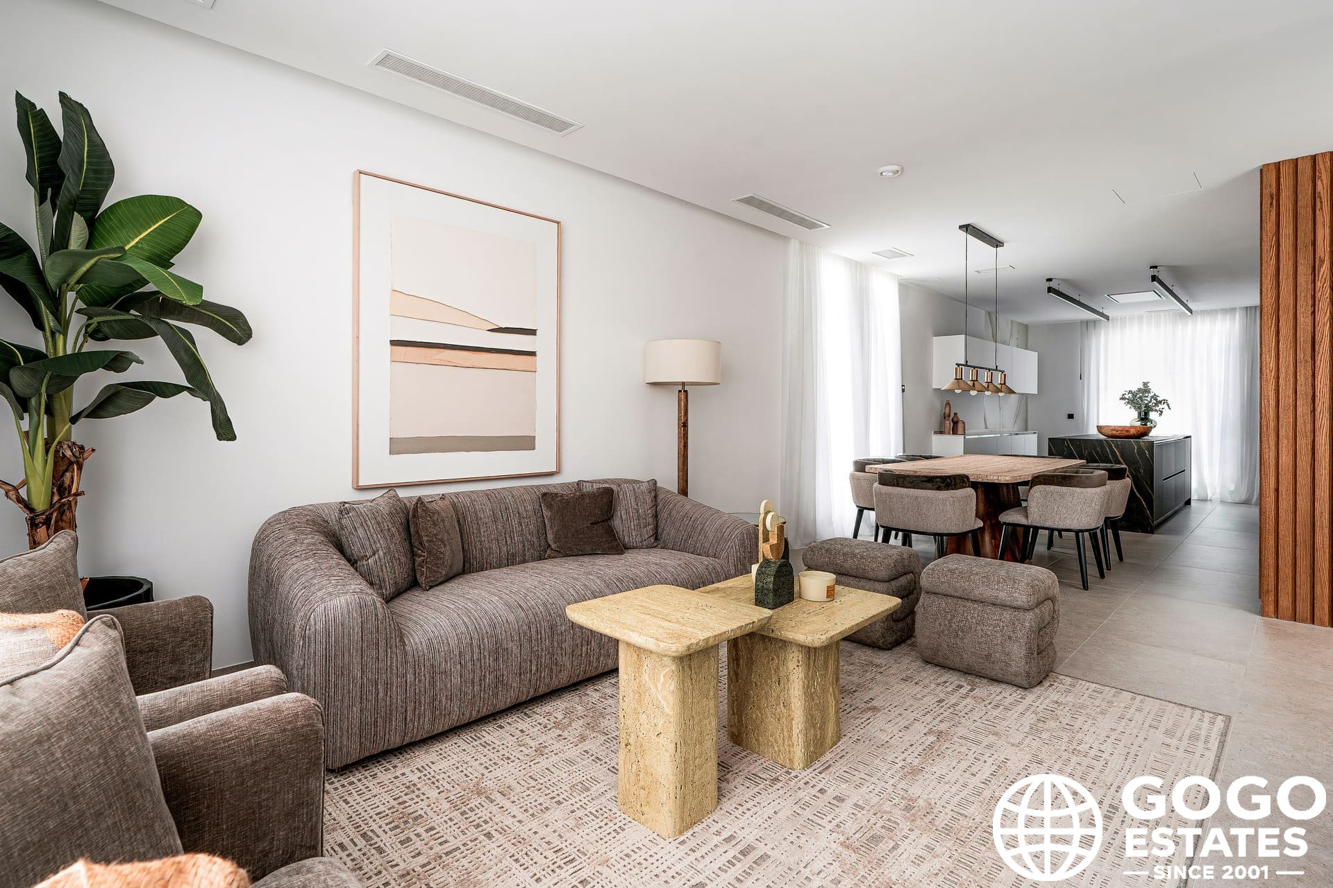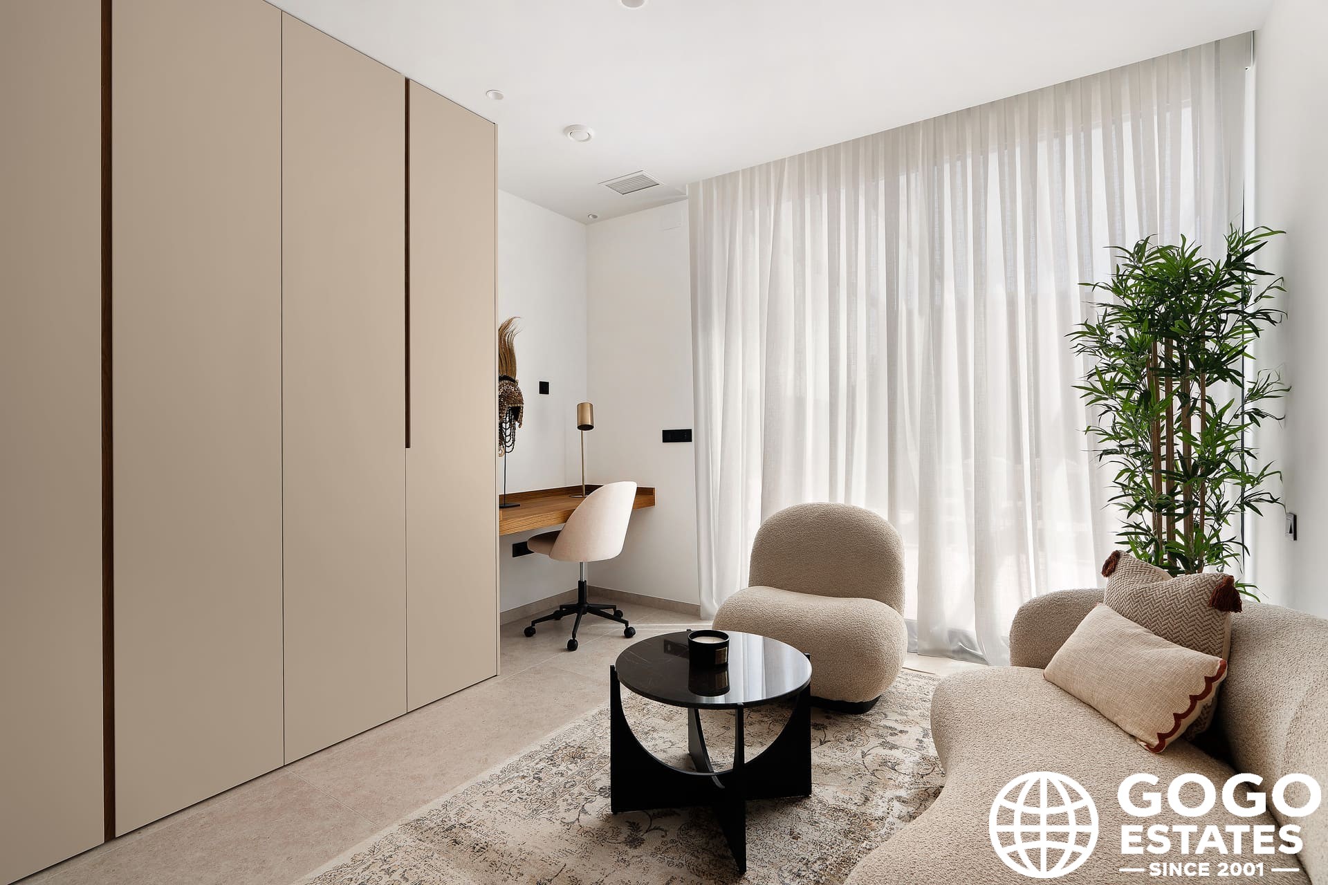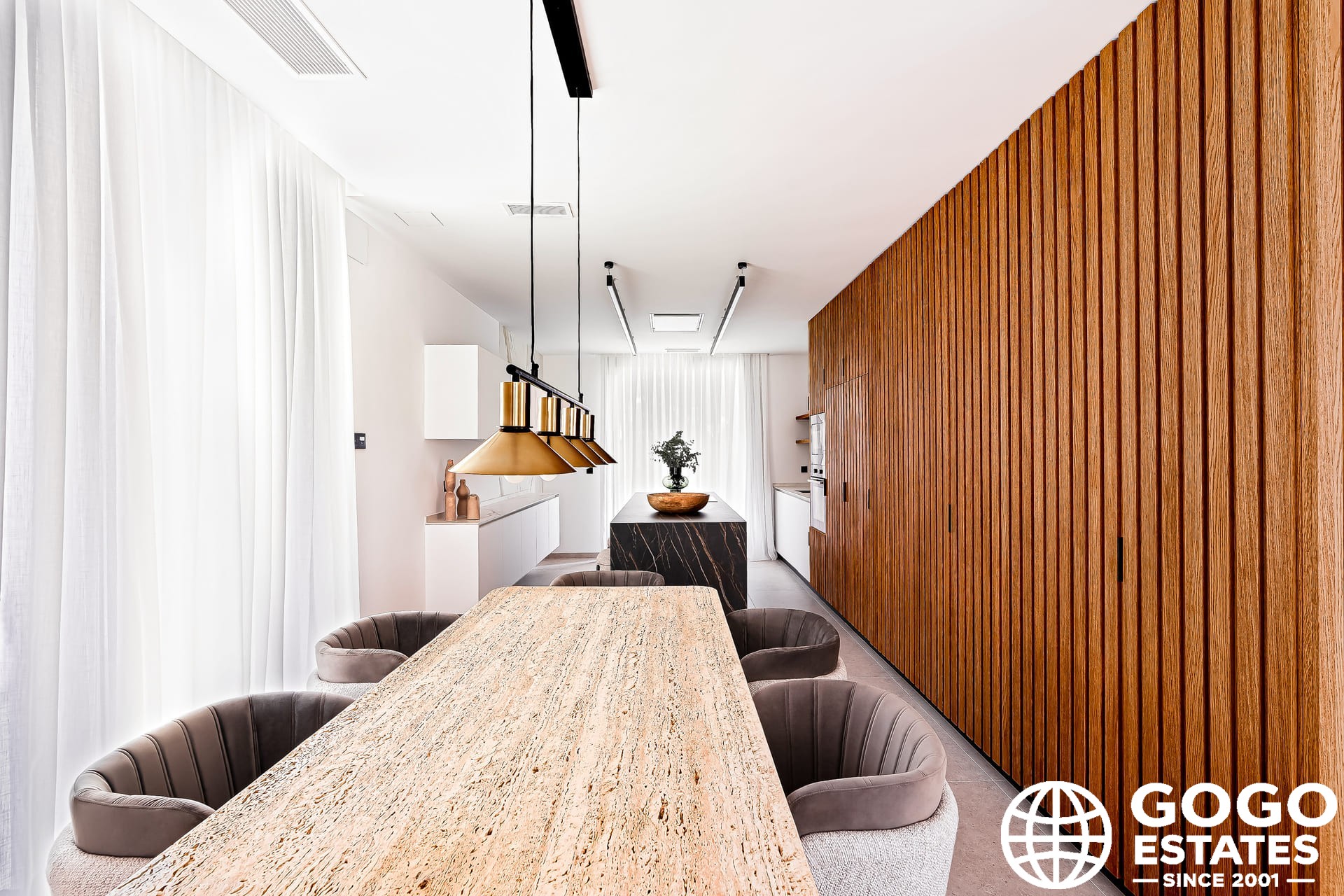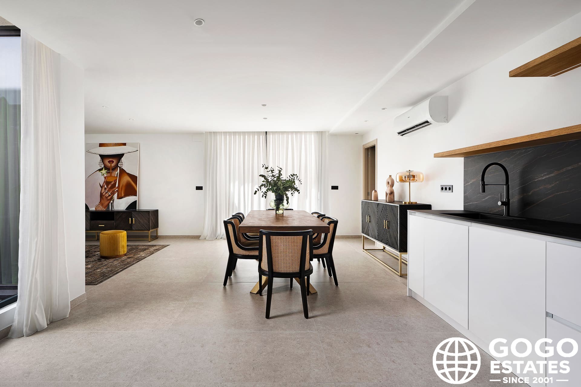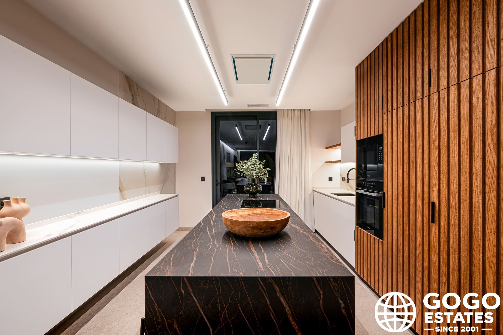 À l'intérieur, la villa est conçue avec un accent sur le confort et la modernité. Les sols en grès cérame ajoutent de l'élégance, tandis que des appareils électroménagers de haute qualité garantissent que la cuisine est prête à l'emploi. L'automatisation domestique intégrée, les volets électriques et un interphone vidéo améliorent la sécurité et la commodité.