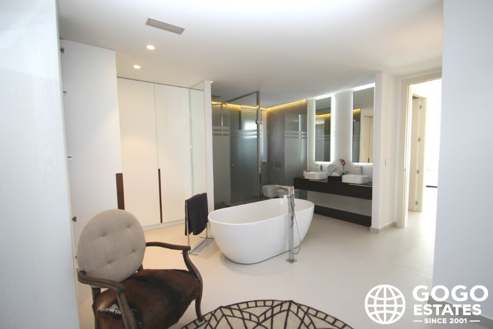 Le design extérieur maximise le plaisir du climat méditerranéen. La villa dispose d'une terrasse privée et d'un solarium, parfaits pour la détente en plein air. Une piscine privée et une pergola ajoutent élégance et fonctionnalité.