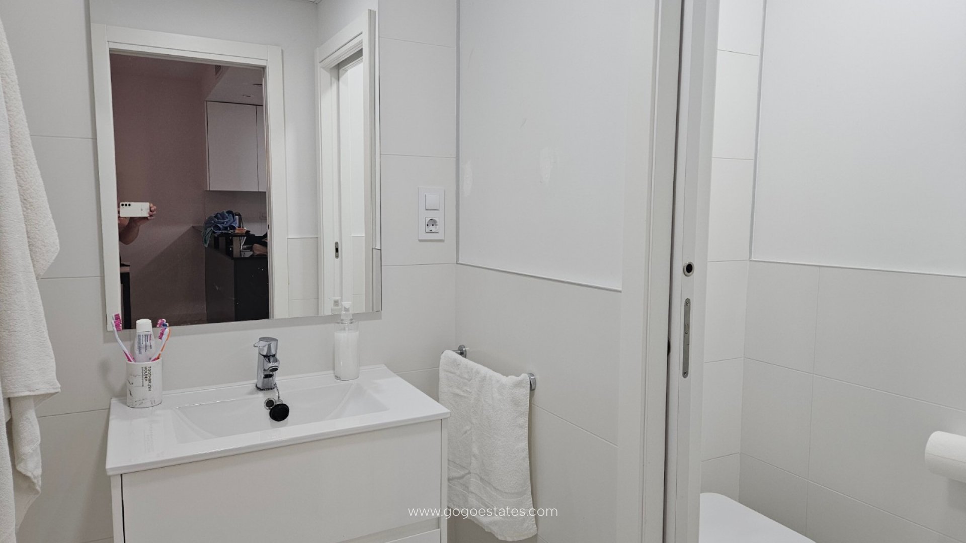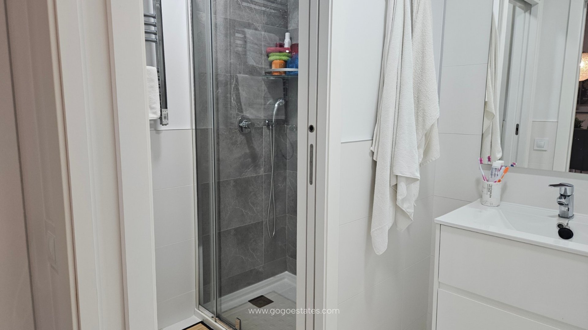 - Badkamer met enkele wastafel, douche, toilet en föhn