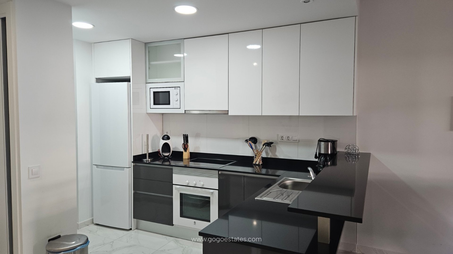 - Open keuken met elektrische kookplaat, elektrische oven, magnetron, vaatwasser, koel-vriescombinatie, koffiezetapparaat, blender en broodrooster