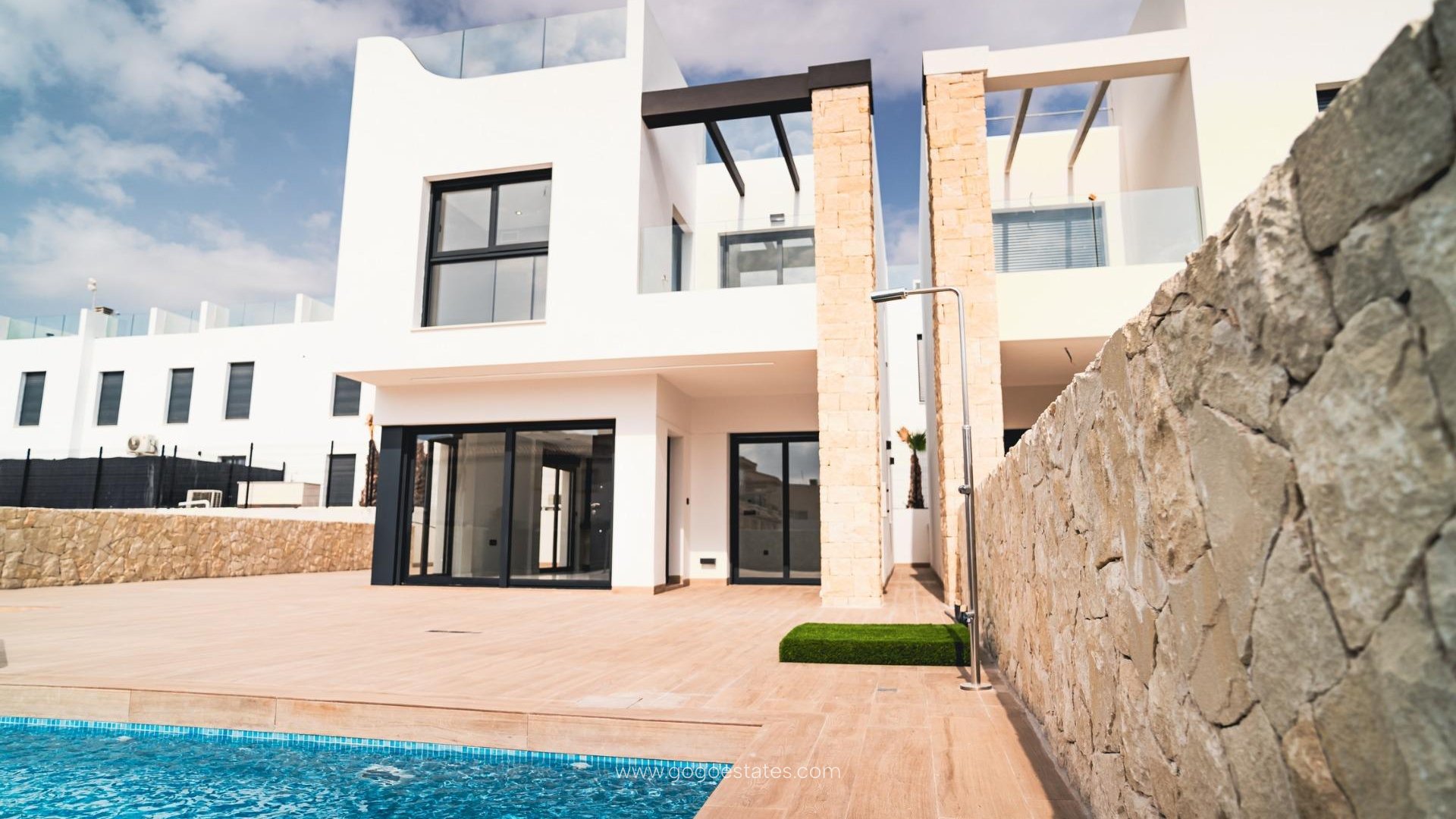 NIEUWBOUW WOONCOMPLEX IN PUNTA PRIMA Nieuwbouw wooncomplex van bungalow appartementen en 7 vrijstaande villa's in Punta Prima. Nieuwbouw villa's zijn verdeeld over twee verdiepingen, plus het zonnige dakterras. Op de begane grond is er een lichte en ruime woonkamer met open keuken, 1 slaapkamer met inbouwkast en 1 badkamer. Op de eerste verdieping bevinden zich nog 3 slaapkamers met inbouwkasten en 2 badkamers, waarvan één en-suite met de hoofdslaapkamer. Vanuit de hoofdslaapkamer heeft u toegang tot een terras. Via een trap naar boven bereikt u het privé solarium. De urbanisatie biedt mooie groene zones met een speeltuin voor kinderen, een fitnessruimte en twee gemeenschappelijke zwembaden. Complex gelegen op een paar meter van het centrum van Punta Prima waar u alle voorzieningen vindt die u nodig kunt hebben. In de omgeving vindt u een breed scala aan leuke restaurants, cafes, supermarkten, apotheken en alle voorzieningen die u nodig kunt hebben. Punta Prima, gelegen op slechts 5 km van Torrevieja, wordt gekenmerkt door goede communicatie- en gezondheidsinfrastructuren, de nabijheid van de luchthaven van Alicante, en het aantal diensten die het hele jaar door geopend zijn. Op slechts 10 km afstand vinden we de golfbanen van Villamartín, Campoamor, Las Ramblas, Las Colinas en Lo Romero, evenals de commerciële centra van La Zenia en Habaneras.