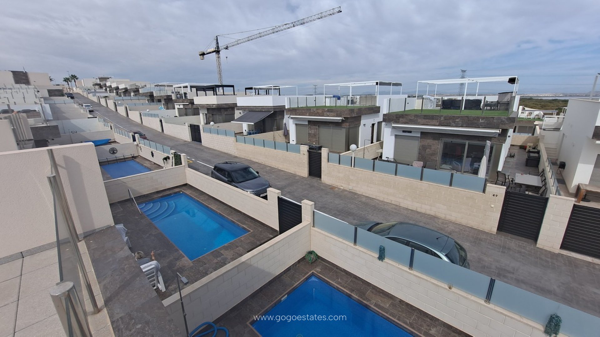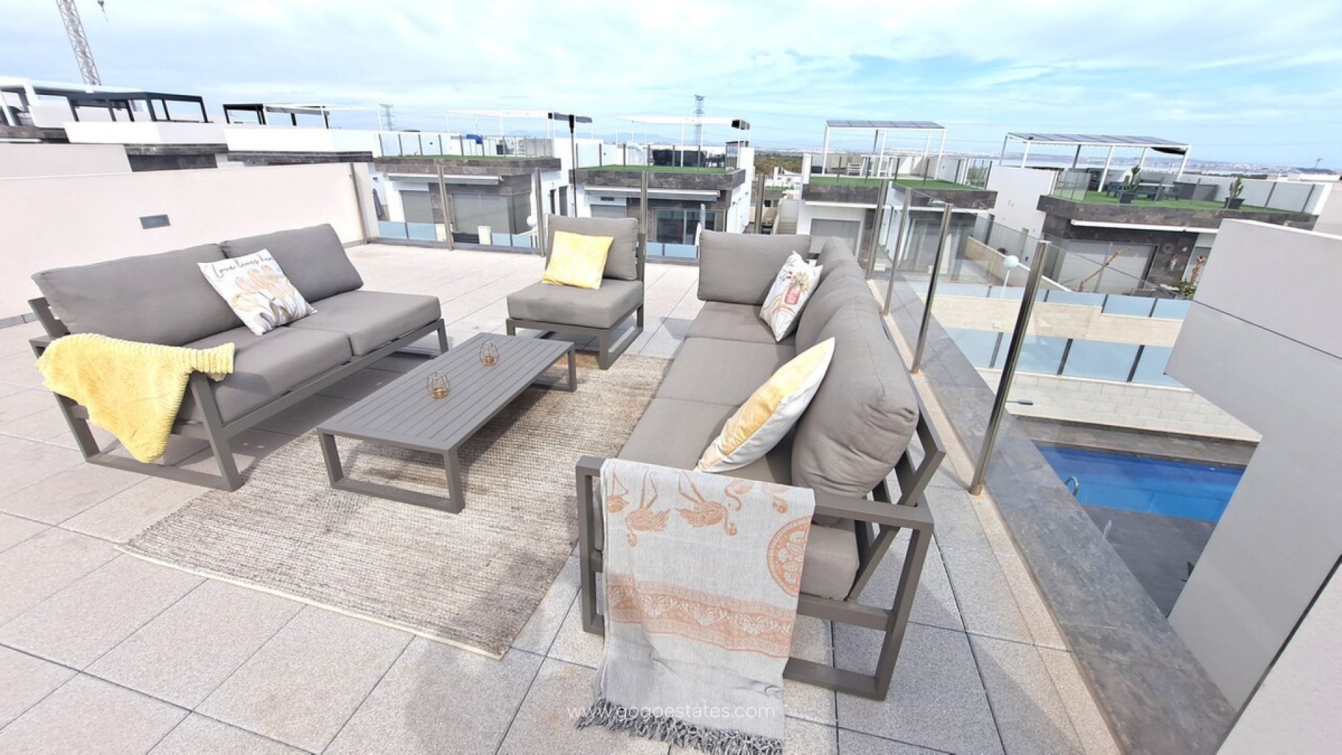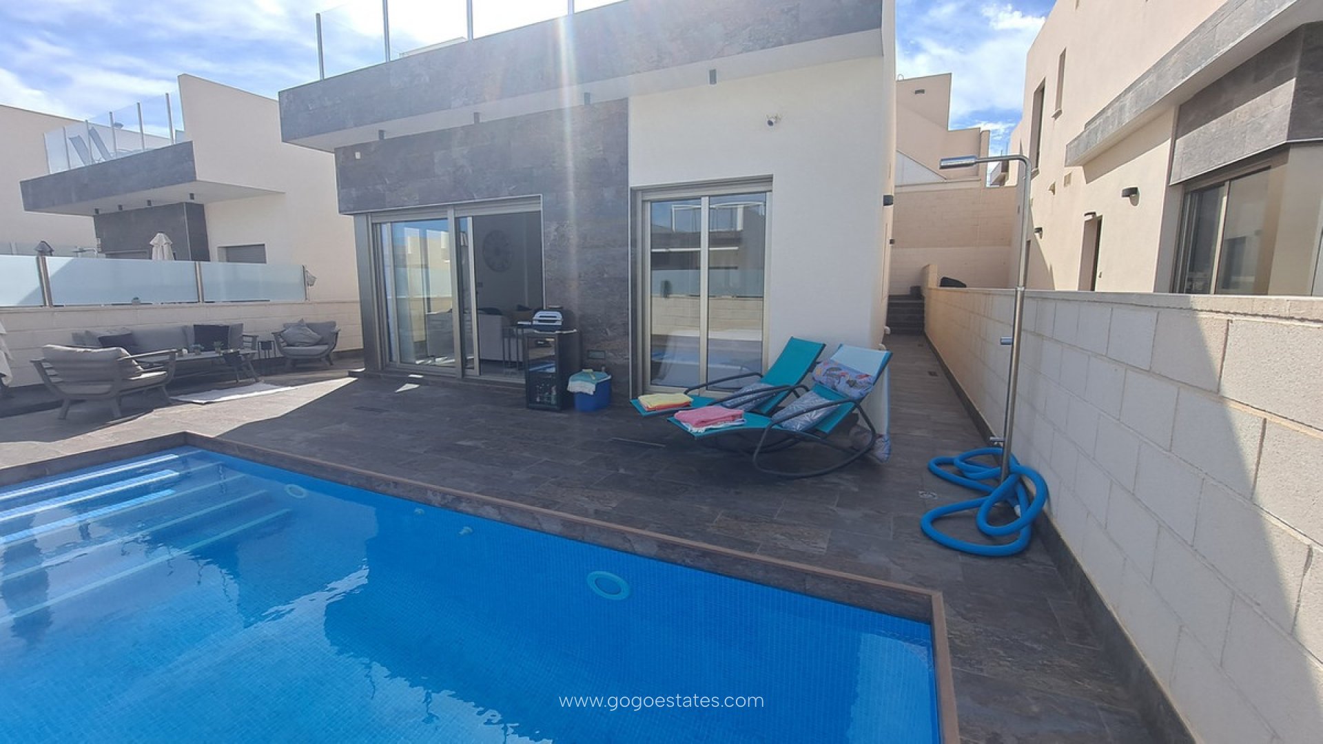 Prachtige moderne vrijstaande villa in Pink Paradise, Villamartin. Maak kennis met deze nieuw gebouwde, vrijstaande villa, geheel gelijkvloers, gelegen in de populaire wijk Pink Paradise in Villamartin. Deze woning combineert modern comfort en stijl en is ideaal voor wie op zoek is naar een luxe maar praktische leefruimte. Belangrijkste kenmerken: Buiten: Tuin op het noorden. Een prachtig aangelegde tuin met een privézwembad, perfect om te genieten van zonnige dagen en buiten te ontspannen. - Groot privésolarium: Biedt extra buitenruimte met adembenemend uitzicht op het meer, ideaal om gasten te ontvangen of te ontspannen in de serene omgeving. Elektrische rolluiken: Handige en veilige elektrische rolluiken voor extra privacy en gemoedsrust. Interieur: Ruime woonkamer: Een lichte en luchtige woonkamer met airconditioning voor optimaal comfort het hele jaar door. Open keuken: Volledig ingerichte en geïntegreerde keuken, perfect voor modern wonen en gemakkelijk gasten ontvangen. Drie slaapkamers: Alle slaapkamers zijn voorzien van airconditioning, inbouwkasten en directe toegang tot de tuin. De hoofdslaapkamer is voorzien van een plafondventilator en een eigen badkamer met douche, wat zorgt voor een privé en comfortabel toevluchtsoord. - Extra doucheruimte: bedient de andere twee slaapkamers, wat zorgt voor gemak voor zowel het gezin als gasten. Extra's: - De villa wordt gedeeltelijk gemeubileerd verkocht, wat een solide basis biedt voor nieuwe eigenaren om de villa te personaliseren en naar eigen wens in te richten. Waarom deze villa? Deze woning is perfect voor wie op zoek is naar een moderne, gelijkvloerse woning met uitzonderlijke leefruimtes binnen en buiten. Het doordachte ontwerp omvat ruime slaapkamers, een open woonkamer en handige voorzieningen zoals airconditioning en elektrische rolluiken, wat zorgt voor een comfortabele en veilige omgeving. Het privézwembad, het solarium met uitzicht op het meer en de gemakkelijke toegang tot lokale voorzieningen maken deze villa een ideale keuze voor zowel permanente bewoning als een vakantieverblijf. Mis deze fantastische kans niet! Neem vandaag nog contact met ons op om een bezichtiging te regelen en de luxe en het comfort van deze prachtige villa in Pink Paradise te ervaren.