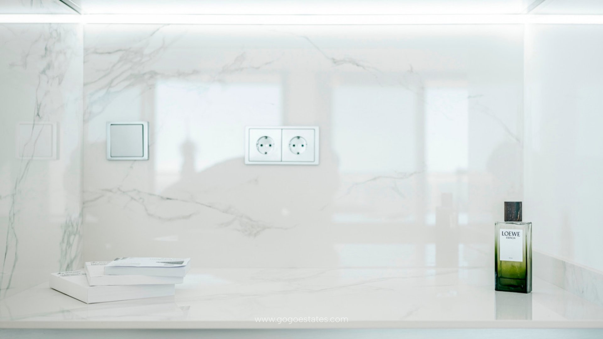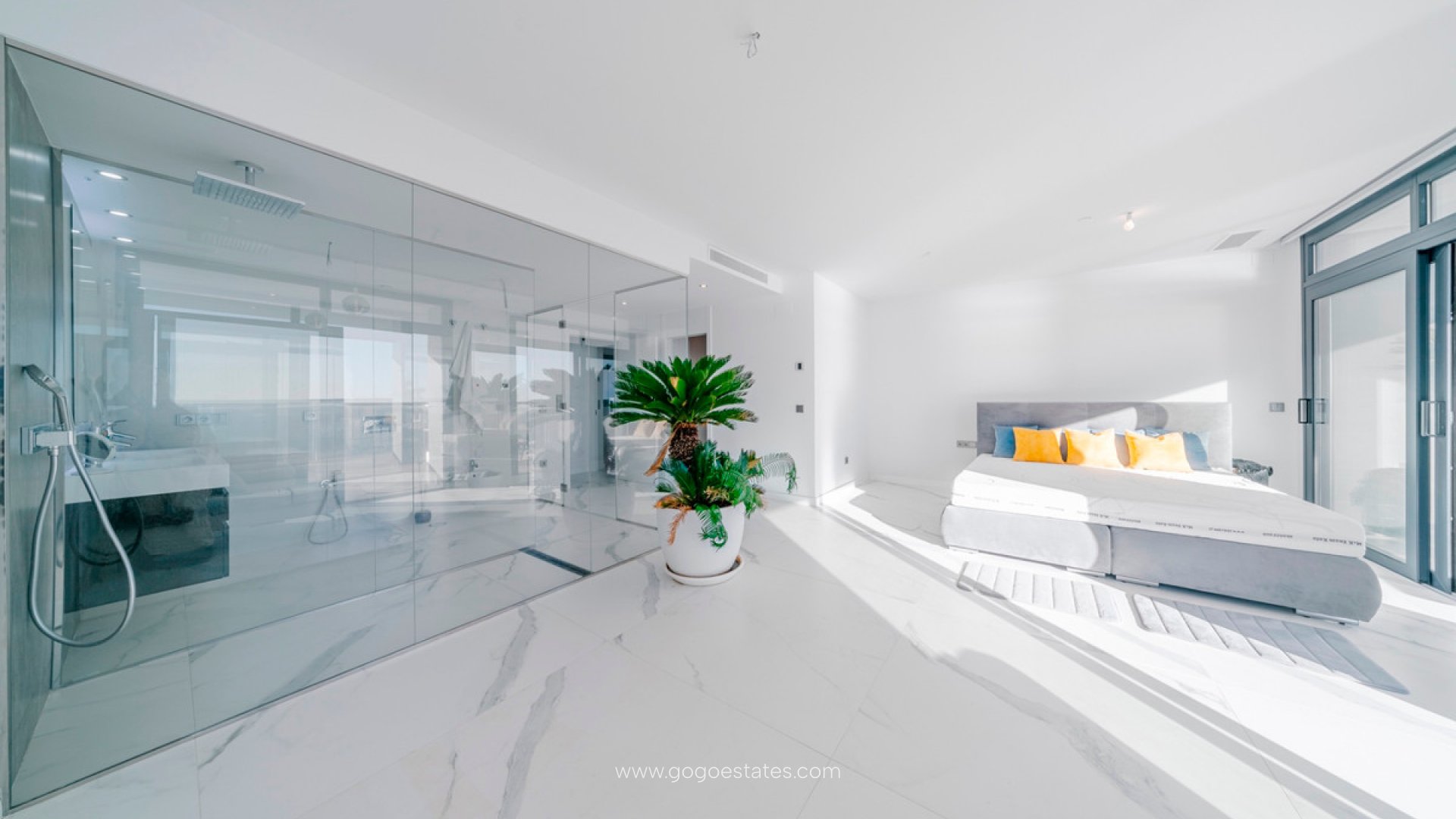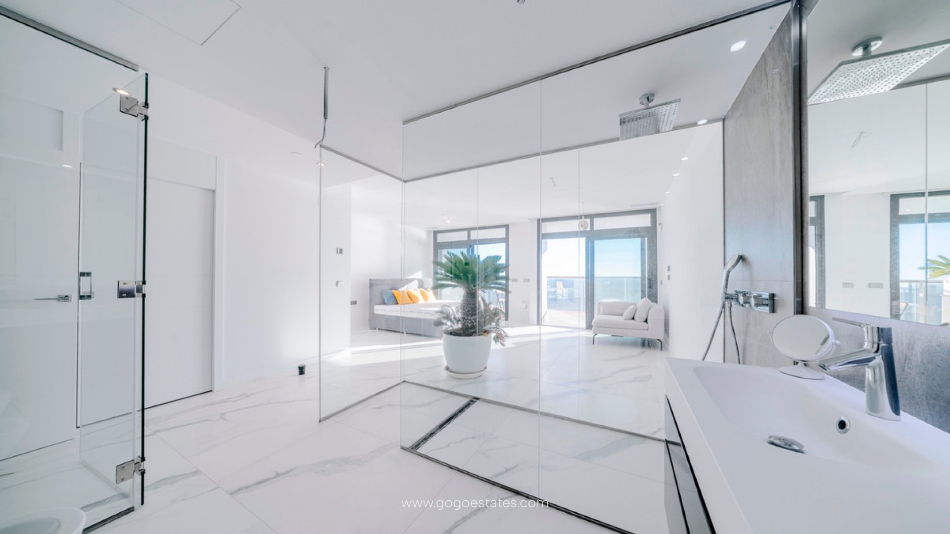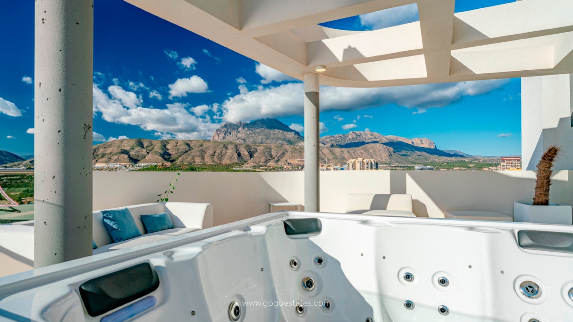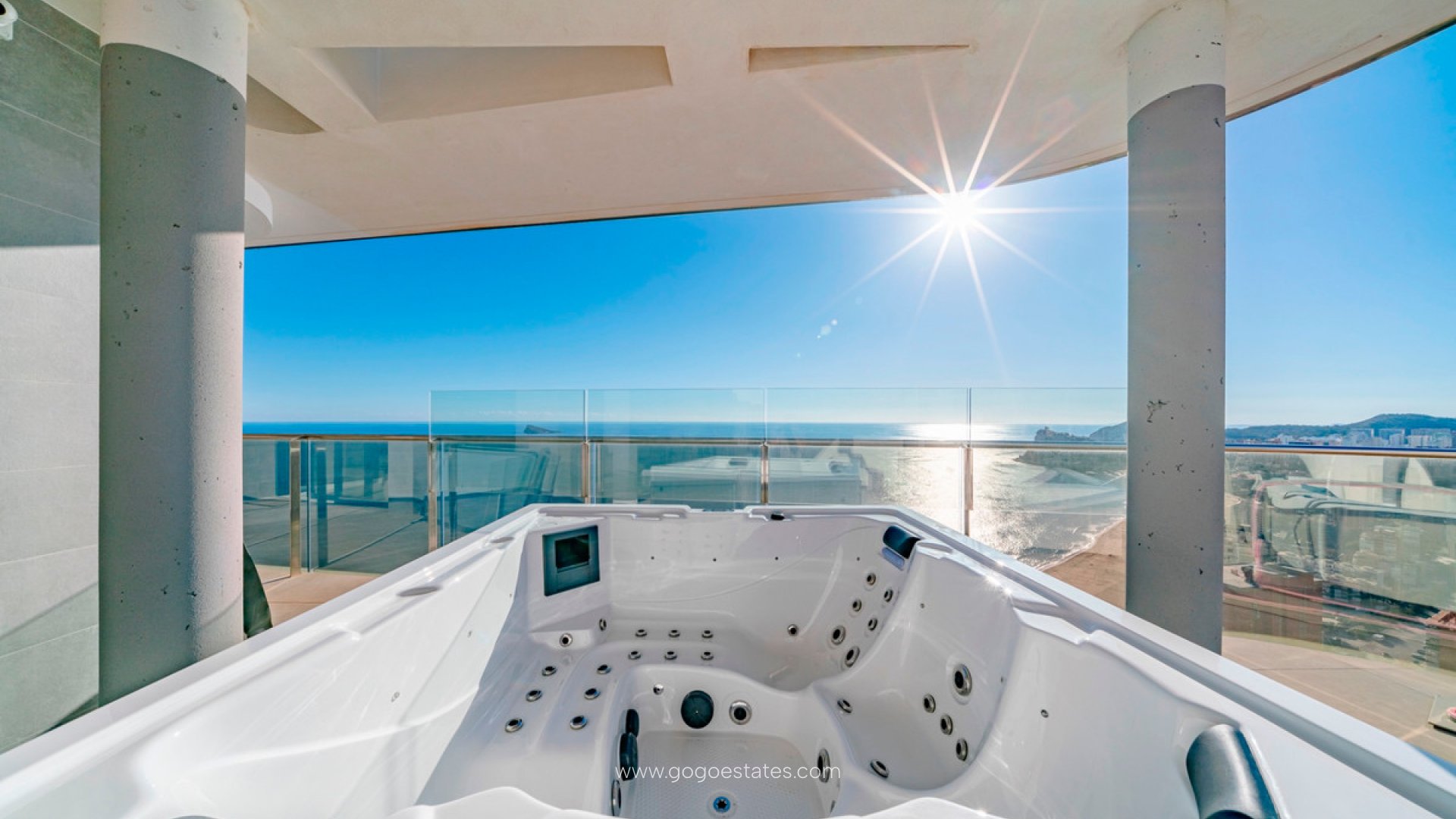 Gelegen in het prestigieuze Residential Sunset Cliffs, biedt dit prachtige appartement op de 29e verdieping een ongeëvenaarde kustlevensstijl met frontaal zeezicht op de Middellandse Zee en het Poniente-strand. Ontworpen voor zowel comfort als verfijning, combineert deze woning moeiteloos moderne elegantie met adembenemende omgevingen. De ruime woonkamer baadt in natuurlijk licht en beschikt over een open keuken met hoogwaardige Samsung smart-apparatuur en exclusieve Porcelanosa afwerkingen. Dankzij het naadloze ontwerp en de premium materialen is deze ruimte perfect voor zowel dagelijks gebruik als entertainment. De hoofdsuite is een privé toevluchtsoord met een inloopkast, een spa-achtige en-suite badkamer en een rustige sfeer. Een tweede slaapkamer biedt veelzijdigheid en kan eenvoudig worden omgevormd tot een derde slaapkamer indien gewenst. Geautomatiseerde klimaatbeheersing en luxe afwerkingen zorgen door het hele huis voor een uitzonderlijk comfortniveau. Een opvallend kenmerk van deze woning is het ruime privéterras, waar een privé jacuzzi uitnodigt om te ontspannen terwijl u geniet van het ononderbroken frontale zeezicht. Deze buitenruimte biedt de perfecte setting om te relaxen en te genieten van het prachtige kustlandschap. Als onderdeel van het exclusieve Sunset Cliffs residentiële complex hebben bewoners toegang tot verwarmde zwembaden, een panoramische fitnessruimte, sportvelden, een bioscoop en faciliteiten voor kinderen, wat een resort-achtige ervaring biedt. De ontwikkeling biedt ook directe toegang tot het strand en ligt op slechts enkele minuten van het historische centrum van Benidorm, wat luxe en gemak combineert. De woning beschikt over twee bergingen en ondergrondse parkeergelegenheid, wat praktische voordelen toevoegt aan de vele premium voorzieningen. Een zeldzame kans om luxe, comfort en spectaculaire zeezichten te ervaren op een van de meest gewilde locaties van Benidorm.